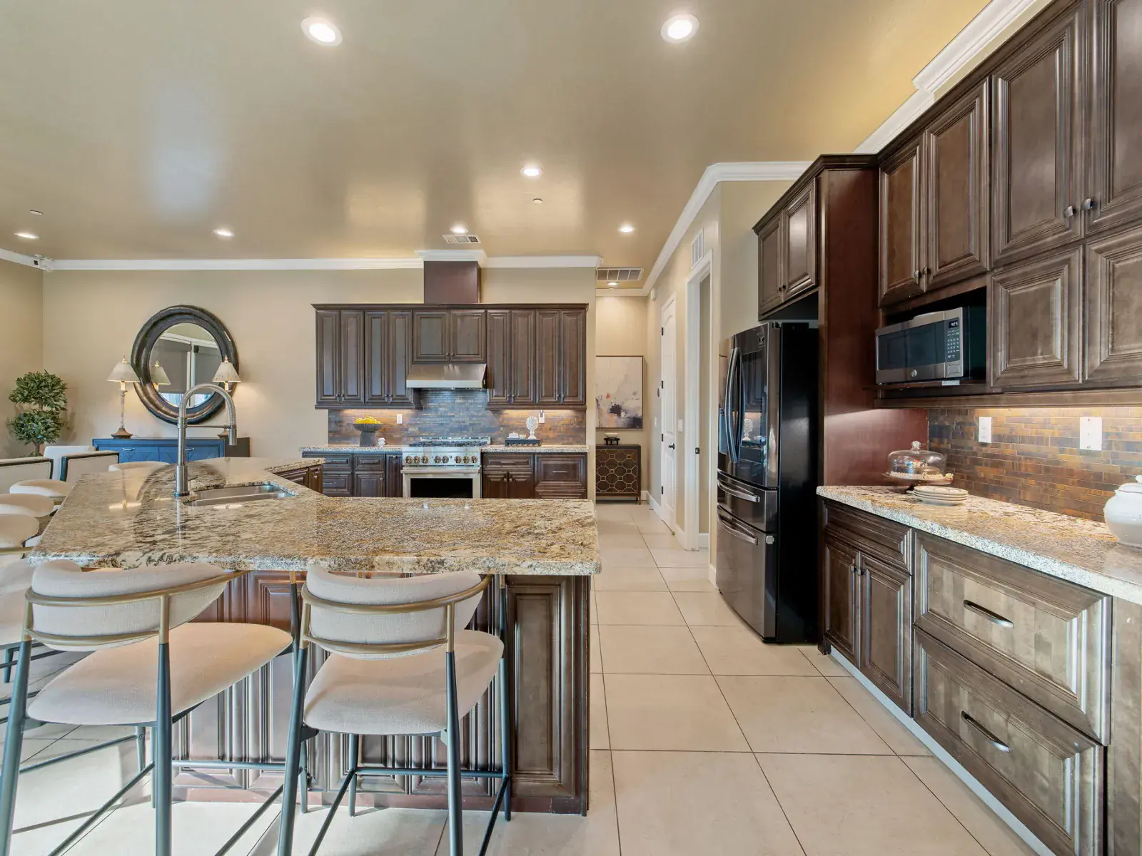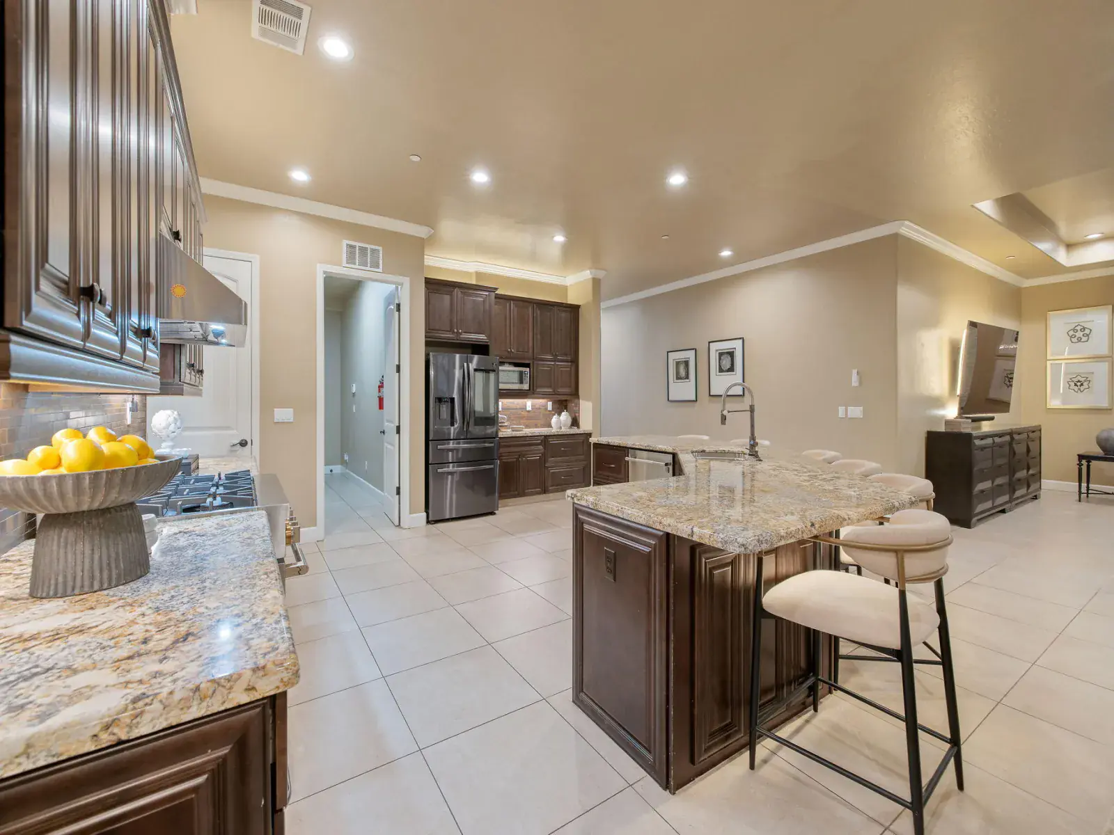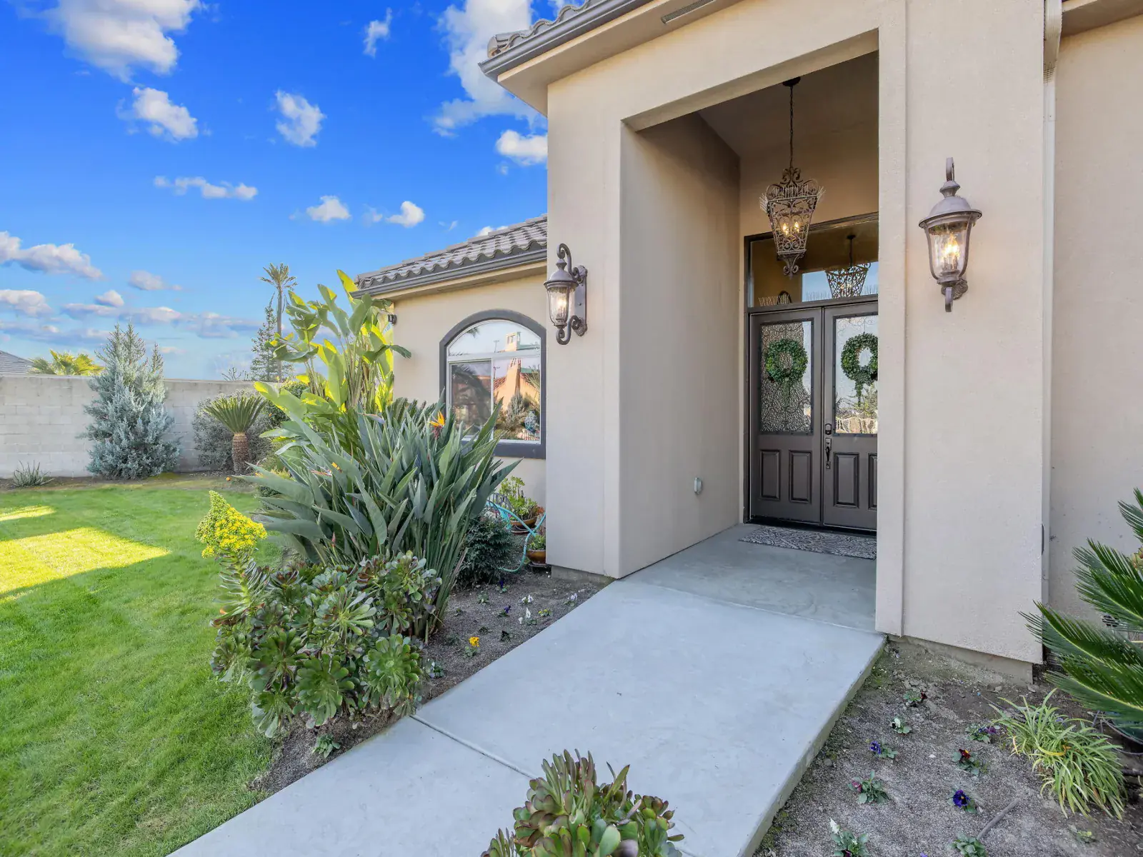 Completed in 2020 and located behind the gates of desirable Tesori in Northeast Tulare, this exceptional custom residence blends luxury, technology, and thoughtful design in one stunning property. Featuring 5 bedrooms and 4 bathrooms, the home offers generous space for everyday living and effortless entertaining, minutes from Tulare’s schools, shopping, dining, and convenient access to nearby Visalia. A formal entry welcomes you through custom double doors into an open, light-filled floor plan that showcases the home’s quality craftsmanship. The chef’s kitchen anchors the living spaces with granite countertops, a large center island with breakfast bar and stainless sink, professional gas range and hood, and premium appliances. The kitchen flows seamlessly into the great room and dining area, where expansive windows fill the space with natural light and create an ideal indoor-outdoor connection for entertaining. Main-level primary suite offers a private retreat with a spacious walk-in closet and spa-inspired bathroom featuring an oversized shower. Upstairs, a versatile suite with full bath works perfectly as a guest room, office, or additional bedroom. Additional bedrooms are generously sized, and every bathroom features OVE bidet toilets. Automated shades, lighting, and ceiling fans add comfort and convenience throughout. Outdoor living shines with a covered patio, two oversized gazebos, and cooling mist at the outdoor chef’s kitchen. Outfitted with professional Lion appliances, including gas range, BBQ, food warmer, refrigerator, and built-in ice chest, this space is built for gatherings. Nearly 2,000 sq. ft. of elevated garden beds produce fruits and vegetables year-round, while the lawn offers room for recreation or pool if desired. Additional highlights include a 3-car garage with storage, smart home and security system, outdoor fireplace, mature palms, custom landscaping, and owned 15.05 kWp solar system. Must see!