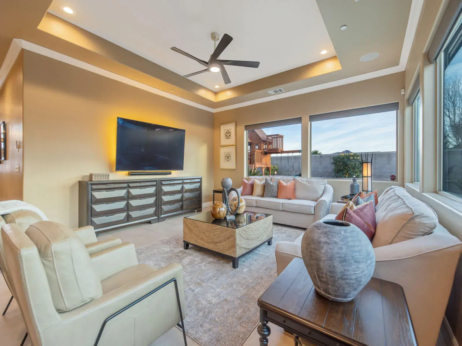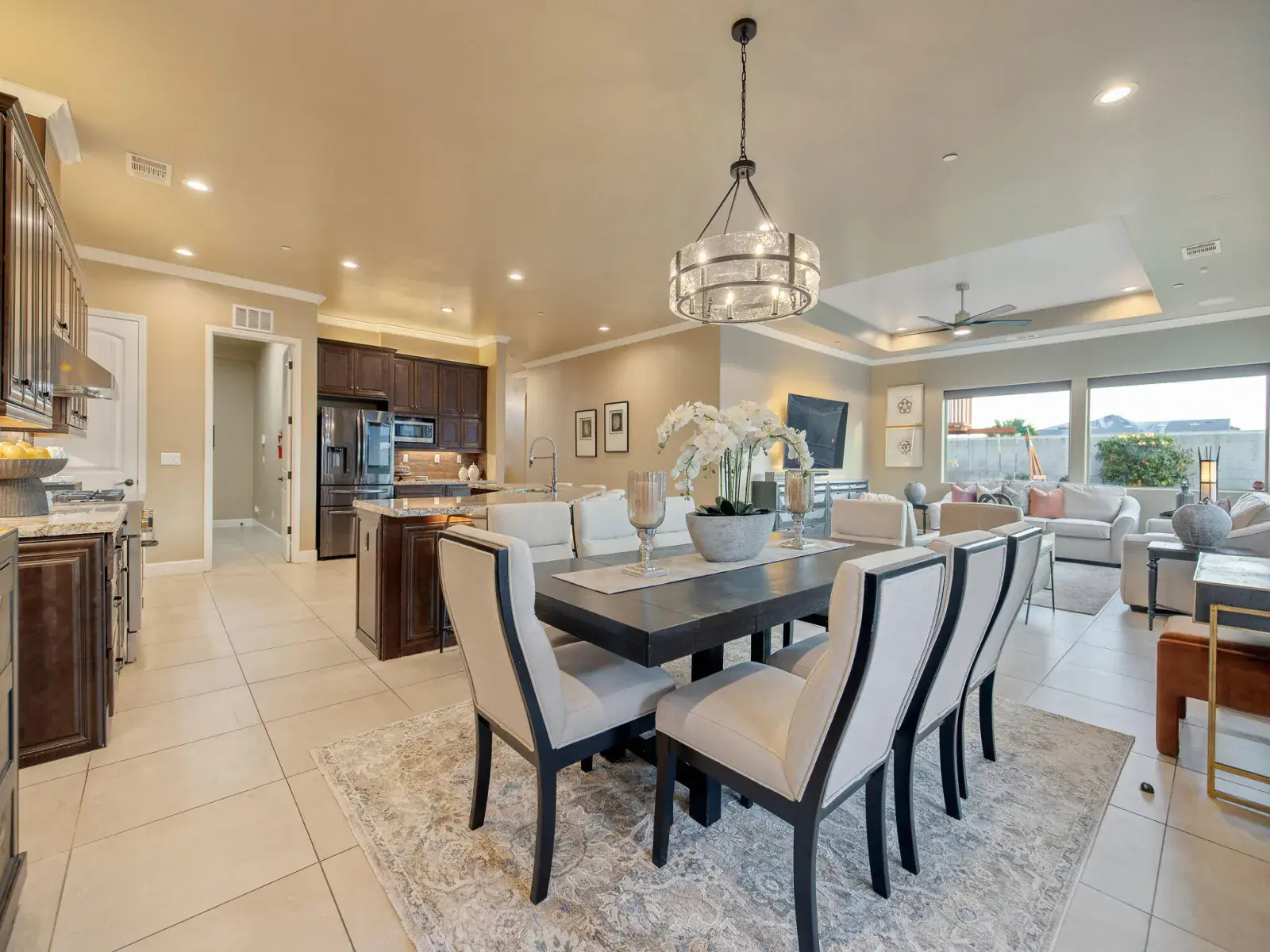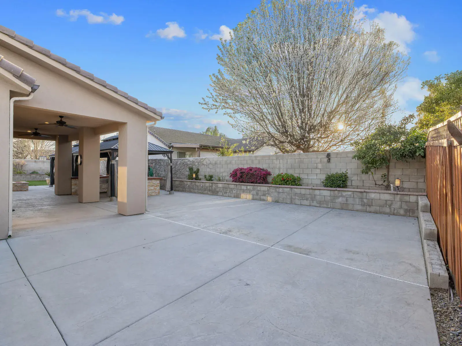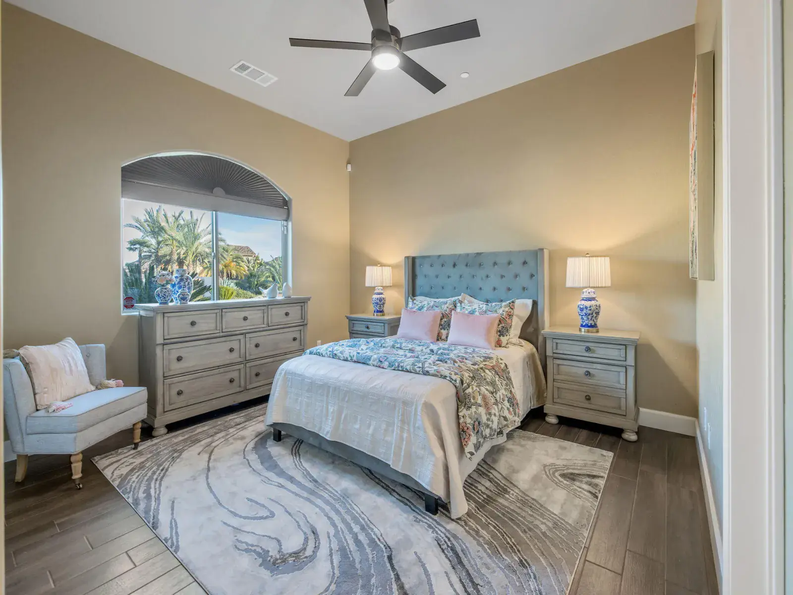 Completed in 2020 and located behind the gates of desirable Tesori in Northeast Tulare, this exceptional custom residence blends luxury, technology, and thoughtful design in one stunning property. Featuring 5 bedrooms and 4 bathrooms, the home offers generous space for everyday living and effortless entertaining, minutes from Tulare’s schools, shopping, dining, and convenient access to nearby Visalia. A formal entry welcomes you through custom double doors into an open, light-filled floor plan that showcases the home’s quality craftsmanship. The chef’s kitchen anchors the living spaces with granite countertops, a large center island with breakfast bar and stainless sink, professional gas range and hood, and premium appliances. The kitchen flows seamlessly into the great room and dining area, where expansive windows fill the space with natural light and create an ideal indoor-outdoor connection for entertaining. Main-level primary suite offers a private retreat with a spacious walk-in closet and spa-inspired bathroom featuring an oversized shower. Upstairs, a versatile suite with full bath works perfectly as a guest room, office, or additional bedroom. Additional bedrooms are generously sized, and every bathroom features OVE bidet toilets. Automated shades, lighting, and ceiling fans add comfort and convenience throughout. Outdoor living shines with a covered patio, two oversized gazebos, and cooling mist at the outdoor chef’s kitchen. Outfitted with professional Lion appliances, including gas range, BBQ, food warmer, refrigerator, and built-in ice chest, this space is built for gatherings. Nearly 2,000 sq. ft. of elevated garden beds produce fruits and vegetables year-round, while the lawn offers room for recreation or pool if desired. Additional highlights include a 3-car garage with storage, smart home and security system, outdoor fireplace, mature palms, custom landscaping, and owned 15.05 kWp solar system. Must see!