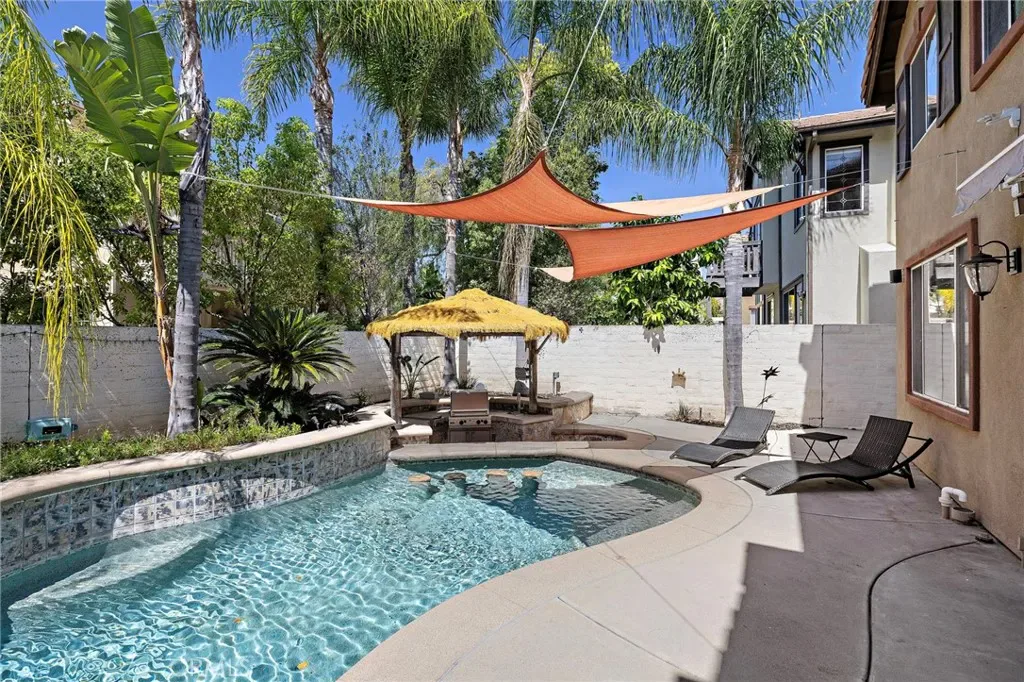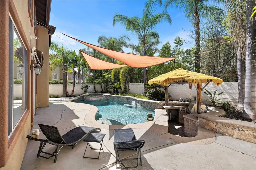 But the backyard is where this home truly shines. A pebble-tech pool with waterfall features invites you to swim up to a built-in bar with submerged stools — all beneath a gorgeous palapa-covered outdoor kitchen with built-in barbecue and spa. This is not just a backyard. It is a private resort.