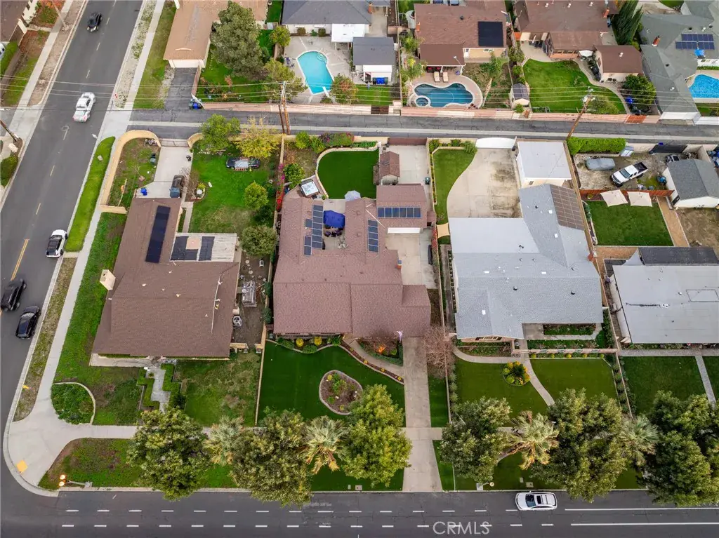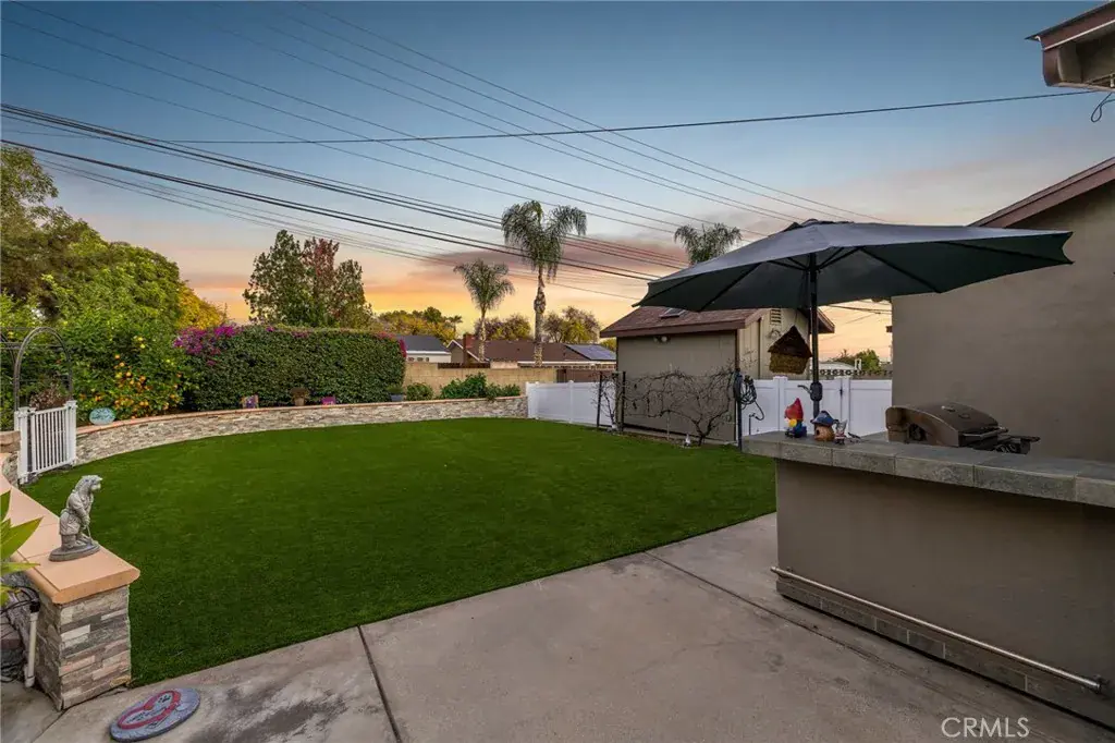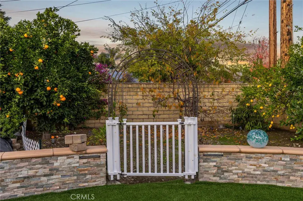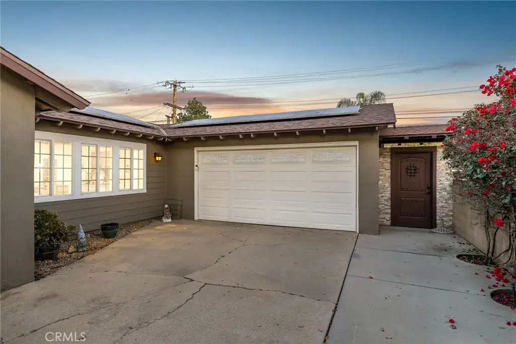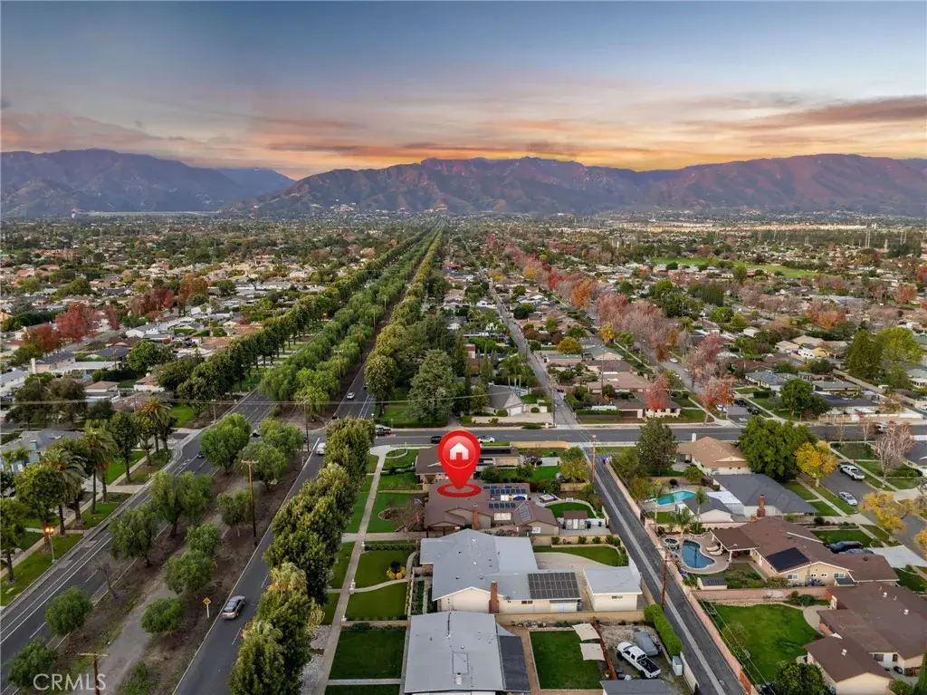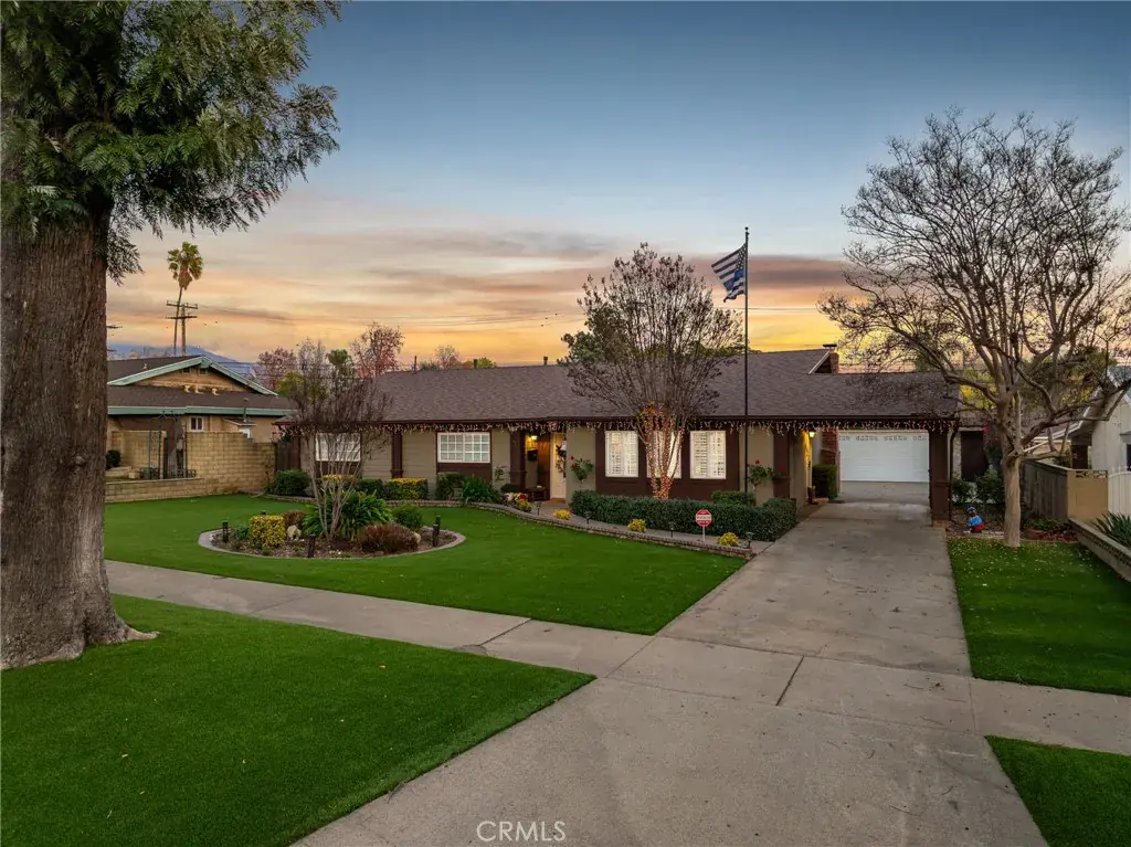 Beautifully remodeled single-story residence on iconic Euclid Avenue, featuring paid solar and exceptional curb appeal. The meticulously landscaped front yard showcases brand-new artificial turf, illuminated planters, a covered pull-through drive leading to a private motor court and attached two-car garage, and a welcoming covered front porch. The home opens to a travertine-tiled entry and front living room with vaulted ceilings, recessed lighting, LVP flooring, plantation shutters, and an open connection to the family room. The family room offers travertine flooring, recessed lighting, a fireplace with mantel, and seamless flow into the kitchen. The kitchen features custom wood cabinetry with glass upper displays, granite countertops, stainless steel appliances, a walk-in pantry, and a peninsula with countertop seating and pendant lighting. Just steps away, the spacious dining room is highlighted by a wall of windows overlooking the backyard. An oversized laundry/mudroom provides abundant storage, natural light, and French doors leading outdoors. Down the extra-wide hallway, the primary suite is accessed through double entry doors and features wood-patterned tile flooring, recessed lighting, crown molding, plantation shutters, and French doors opening to the backyard. The spa-inspired primary bathroom offers dual sinks, a soaking tub beneath a chandelier, a dramatic full-height tiled accent wall that flows into a custom shower with frameless glass enclosure and dual shower heads, and a large walk-in closet with built-in organizers. Three additional bedrooms, all with crown molding, are served by a completely remodeled hall bathroom featuring dual sinks, a custom-tiled shower with frameless glass enclosure, and a freestanding tub. The attached garage is fully finished and includes flush-mount lighting, an EV charger, and attic access with pull-down ladder and overhead storage. The backyard is designed with brand-new artificial turf, stacked-stone perimeter walls, custom lighting, a built-in barbecue, an above-ground spa, and a garden area with mature fruit trees. A cul-de-sac alley provides access to an automatic gate leading to a spacious RV parking area with two storage sheds, separated from the main yard by vinyl fencing and a gated entry. Additional features include a new roof (May 2025), dual HVAC systems, tankless water heater installed in the attic, 200-amp electrical panel, alarm system, automatic sprinklers, and Ring doorbell.