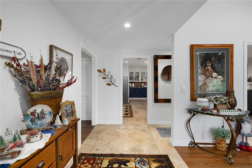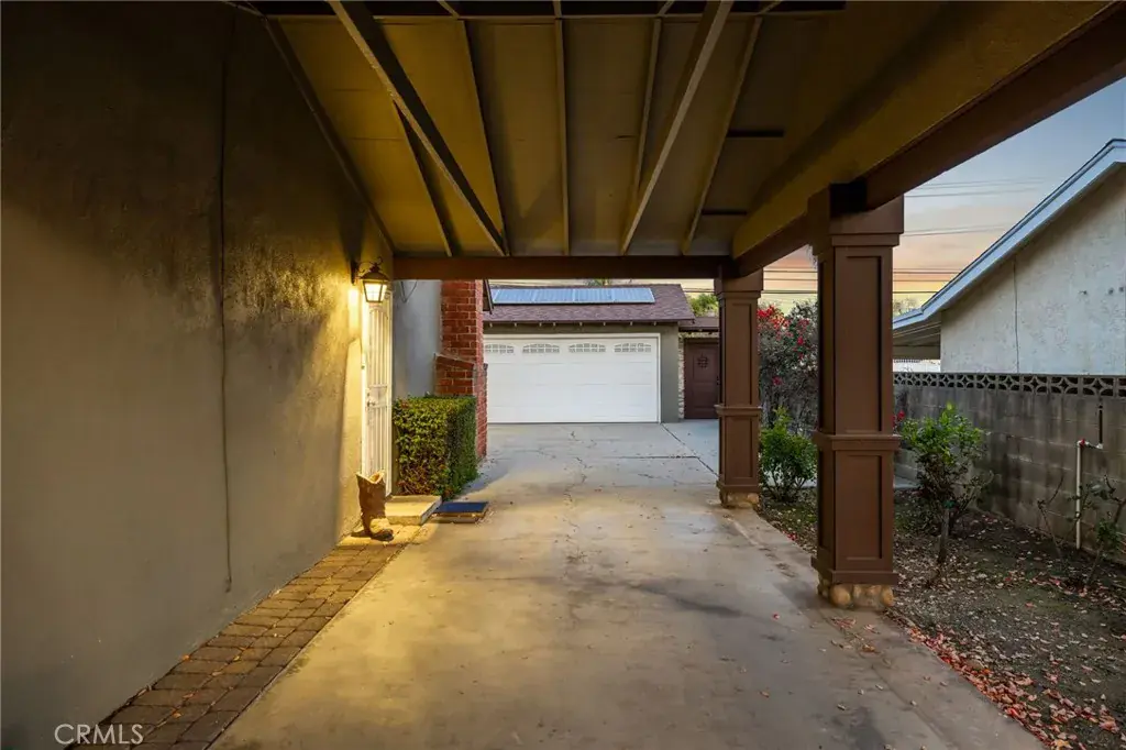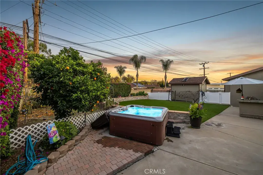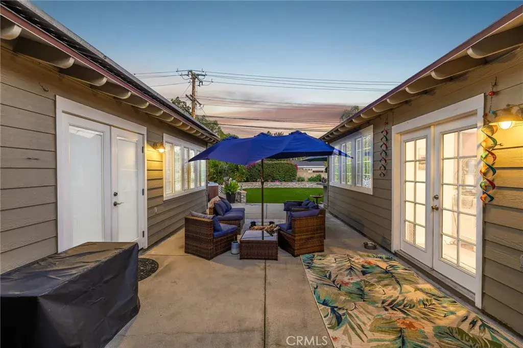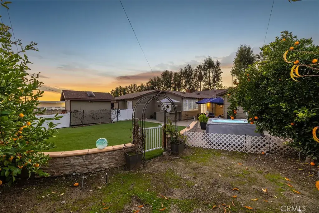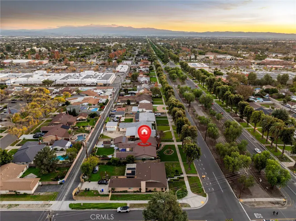 Beautifully remodeled single-story residence on iconic Euclid Avenue, featuring paid solar and exceptional curb appeal. The meticulously landscaped front yard showcases brand-new artificial turf, illuminated planters, a covered pull-through drive leading to a private motor court and attached two-car garage, and a welcoming covered front porch. The home opens to a travertine-tiled entry and front living room with vaulted ceilings, recessed lighting, LVP flooring, plantation shutters, and an open connection to the family room. The family room offers travertine flooring, recessed lighting, a fireplace with mantel, and seamless flow into the kitchen. The kitchen features custom wood cabinetry with glass upper displays, granite countertops, stainless steel appliances, a walk-in pantry, and a peninsula with countertop seating and pendant lighting. Just steps away, the spacious dining room is highlighted by a wall of windows overlooking the backyard. An oversized laundry/mudroom provides abundant storage, natural light, and French doors leading outdoors. Down the extra-wide hallway, the primary suite is accessed through double entry doors and features wood-patterned tile flooring, recessed lighting, crown molding, plantation shutters, and French doors opening to the backyard. The spa-inspired primary bathroom offers dual sinks, a soaking tub beneath a chandelier, a dramatic full-height tiled accent wall that flows into a custom shower with frameless glass enclosure and dual shower heads, and a large walk-in closet with built-in organizers. Three additional bedrooms, all with crown molding, are served by a completely remodeled hall bathroom featuring dual sinks, a custom-tiled shower with frameless glass enclosure, and a freestanding tub. The attached garage is fully finished and includes flush-mount lighting, an EV charger, and attic access with pull-down ladder and overhead storage. The backyard is designed with brand-new artificial turf, stacked-stone perimeter walls, custom lighting, a built-in barbecue, an above-ground spa, and a garden area with mature fruit trees. A cul-de-sac alley provides access to an automatic gate leading to a spacious RV parking area with two storage sheds, separated from the main yard by vinyl fencing and a gated entry. Additional features include a new roof (May 2025), dual HVAC systems, tankless water heater installed in the attic, 200-amp electrical panel, alarm system, automatic sprinklers, and Ring doorbell.