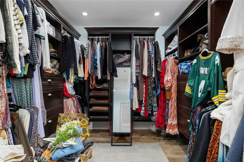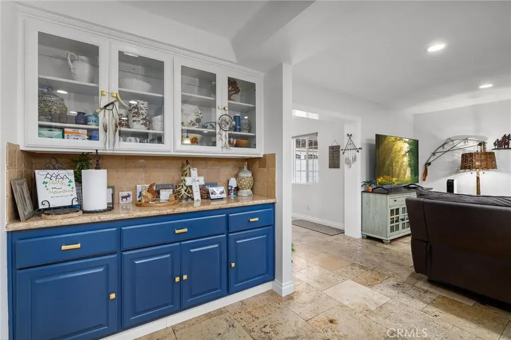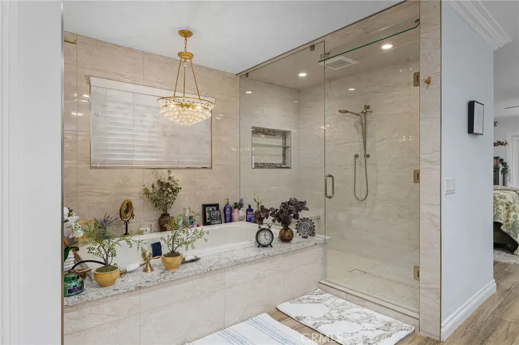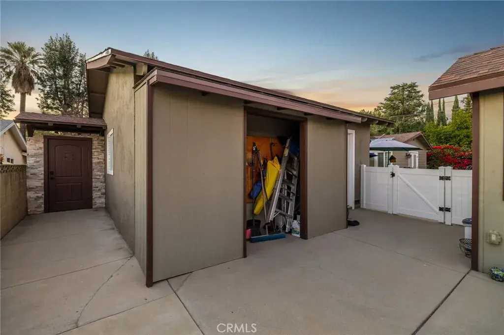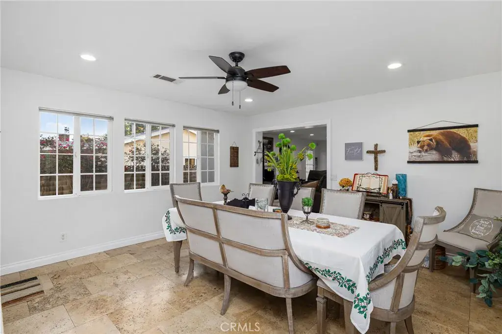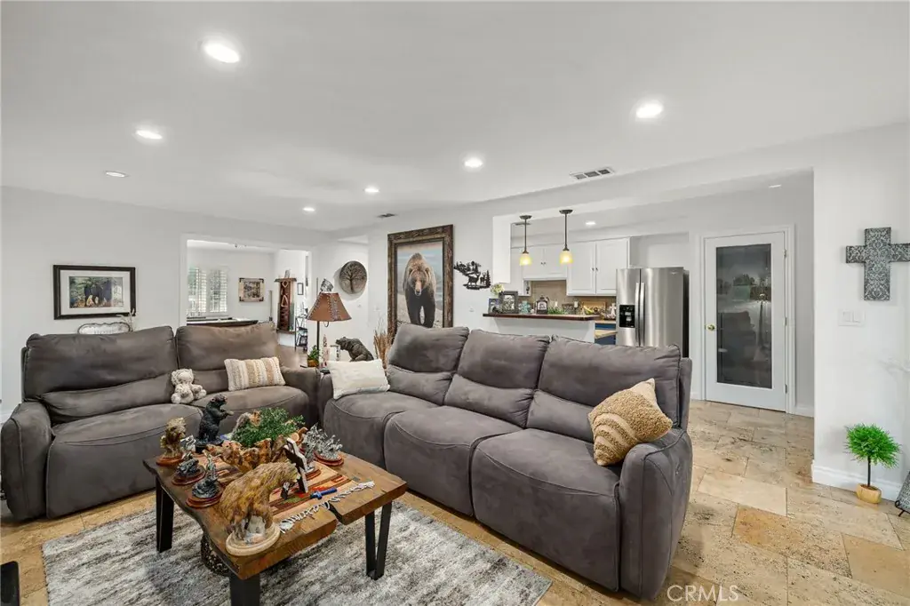 Beautifully remodeled single-story residence on iconic Euclid Avenue, featuring paid solar and exceptional curb appeal. The meticulously landscaped front yard showcases brand-new artificial turf, illuminated planters, a covered pull-through drive leading to a private motor court and attached two-car garage, and a welcoming covered front porch. The home opens to a travertine-tiled entry and front living room with vaulted ceilings, recessed lighting, LVP flooring, plantation shutters, and an open connection to the family room. The family room offers travertine flooring, recessed lighting, a fireplace with mantel, and seamless flow into the kitchen. The kitchen features custom wood cabinetry with glass upper displays, granite countertops, stainless steel appliances, a walk-in pantry, and a peninsula with countertop seating and pendant lighting. Just steps away, the spacious dining room is highlighted by a wall of windows overlooking the backyard. An oversized laundry/mudroom provides abundant storage, natural light, and French doors leading outdoors. Down the extra-wide hallway, the primary suite is accessed through double entry doors and features wood-patterned tile flooring, recessed lighting, crown molding, plantation shutters, and French doors opening to the backyard. The spa-inspired primary bathroom offers dual sinks, a soaking tub beneath a chandelier, a dramatic full-height tiled accent wall that flows into a custom shower with frameless glass enclosure and dual shower heads, and a large walk-in closet with built-in organizers. Three additional bedrooms, all with crown molding, are served by a completely remodeled hall bathroom featuring dual sinks, a custom-tiled shower with frameless glass enclosure, and a freestanding tub. The attached garage is fully finished and includes flush-mount lighting, an EV charger, and attic access with pull-down ladder and overhead storage. The backyard is designed with brand-new artificial turf, stacked-stone perimeter walls, custom lighting, a built-in barbecue, an above-ground spa, and a garden area with mature fruit trees. A cul-de-sac alley provides access to an automatic gate leading to a spacious RV parking area with two storage sheds, separated from the main yard by vinyl fencing and a gated entry. Additional features include a new roof (May 2025), dual HVAC systems, tankless water heater installed in the attic, 200-amp electrical panel, alarm system, automatic sprinklers, and Ring doorbell.