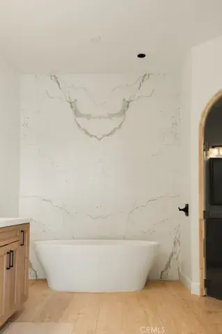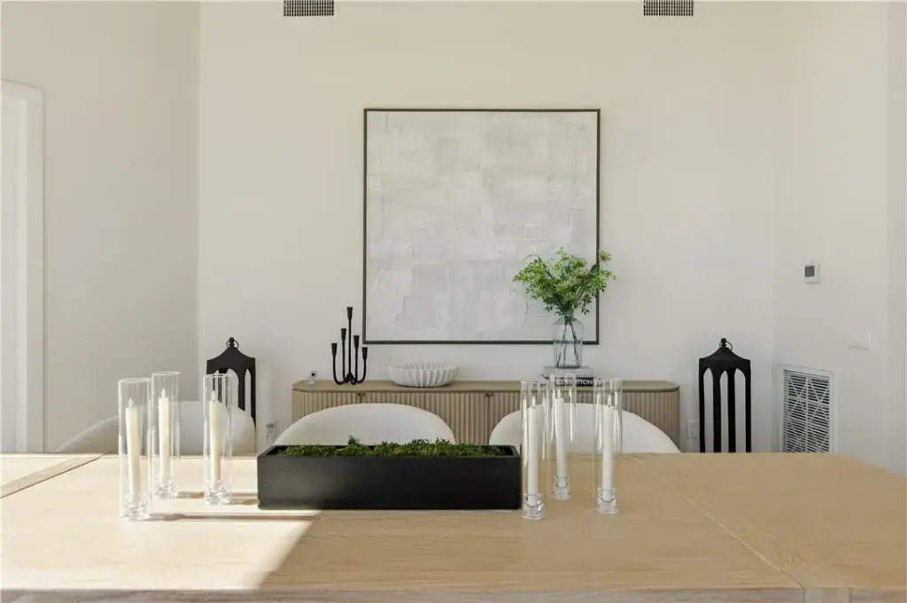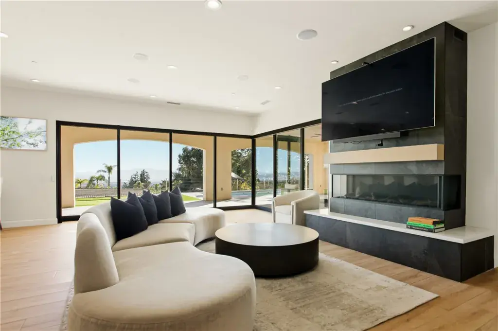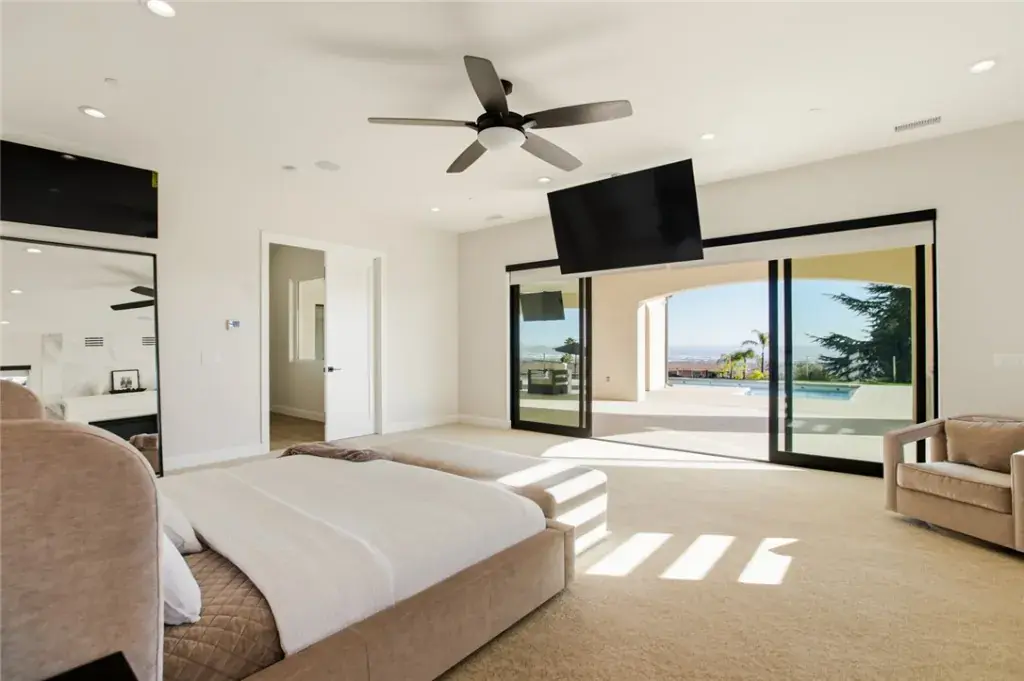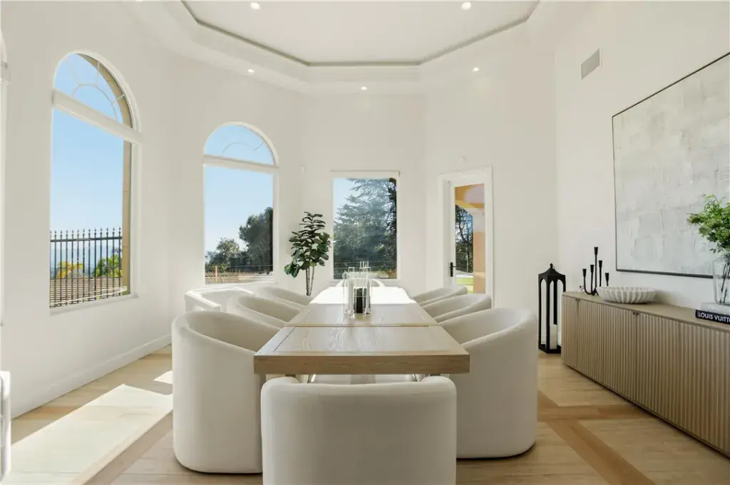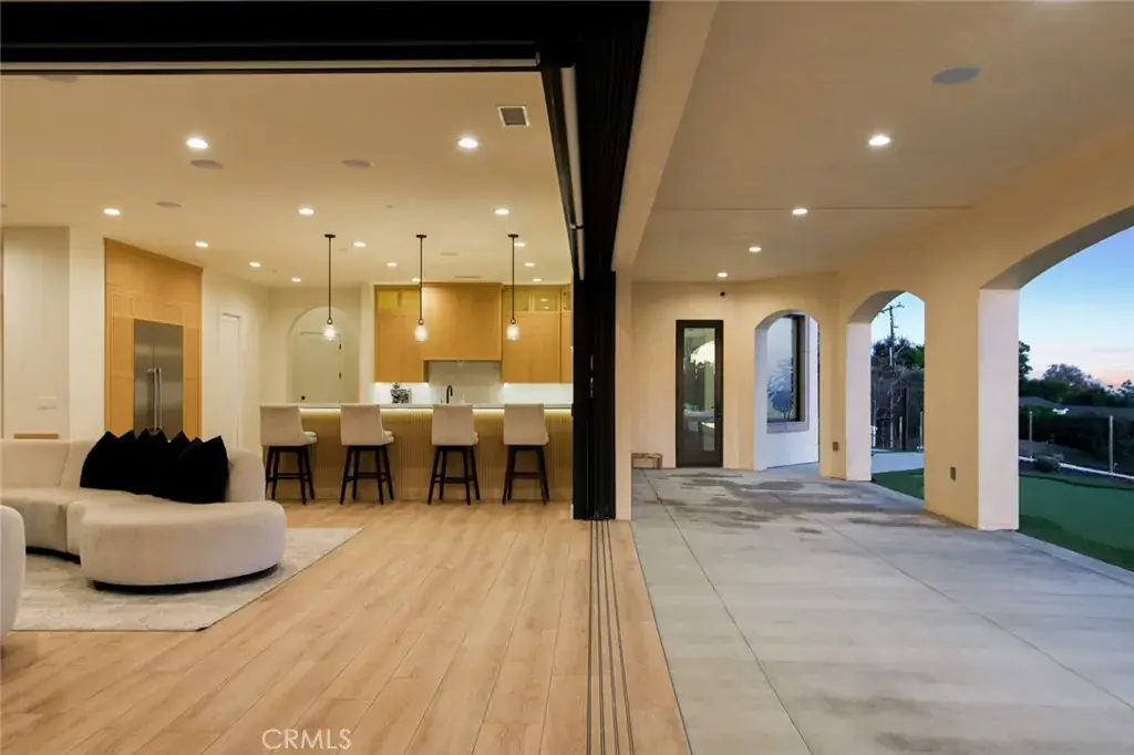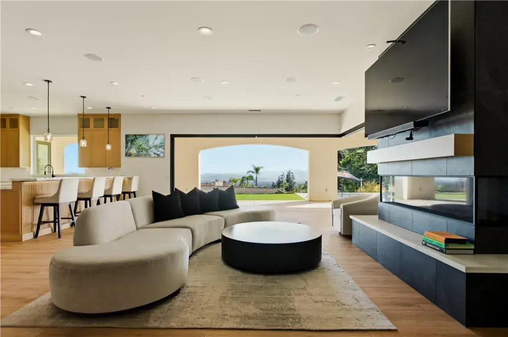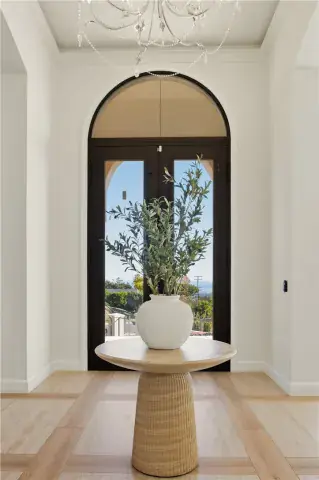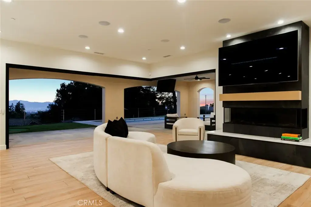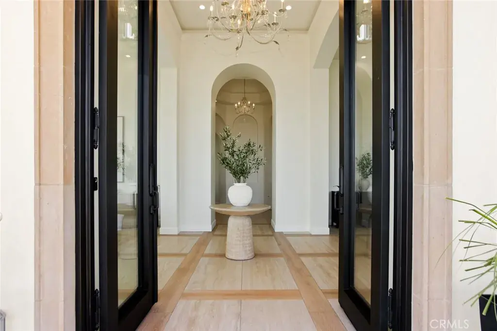 The residence showcases refined Mediterranean-inspired architecture paired with a sophisticated, modern interior. A striking entry with oversized double doors opens to expansive ceiling heights, arched windows, and a light-filled open floor plan. Elevated positioning enhances the sense of privacy while providing unobstructed views rarely found in single-level estates.