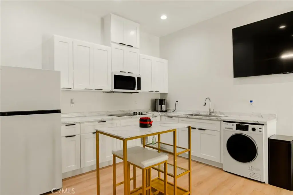 The primary suite offers a serene retreat with panoramic views, fireplace, generous walk-in closet, and a spa-like bath featuring dual vanities, a freestanding soaking tub, and a separate walk-in shower. One bedroom has been configured as a private studio with kitchenette and bathroom, offering flexibility for guests, multigenerational living, or extended stays.