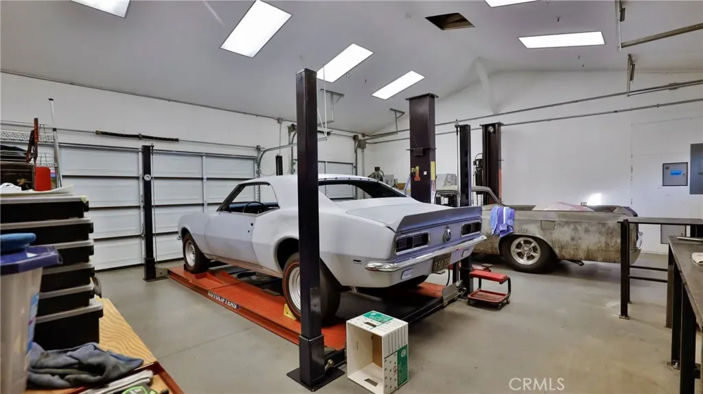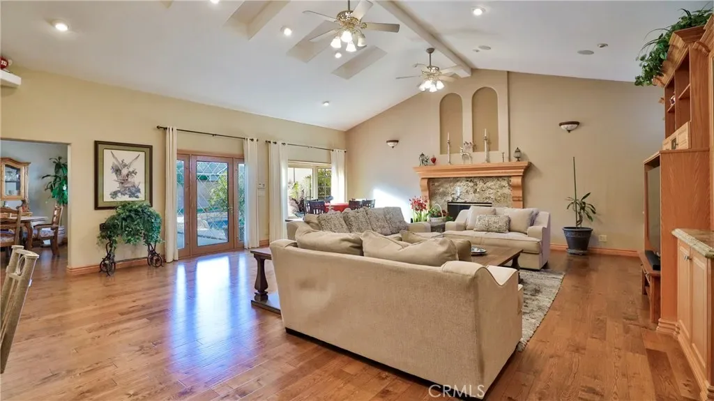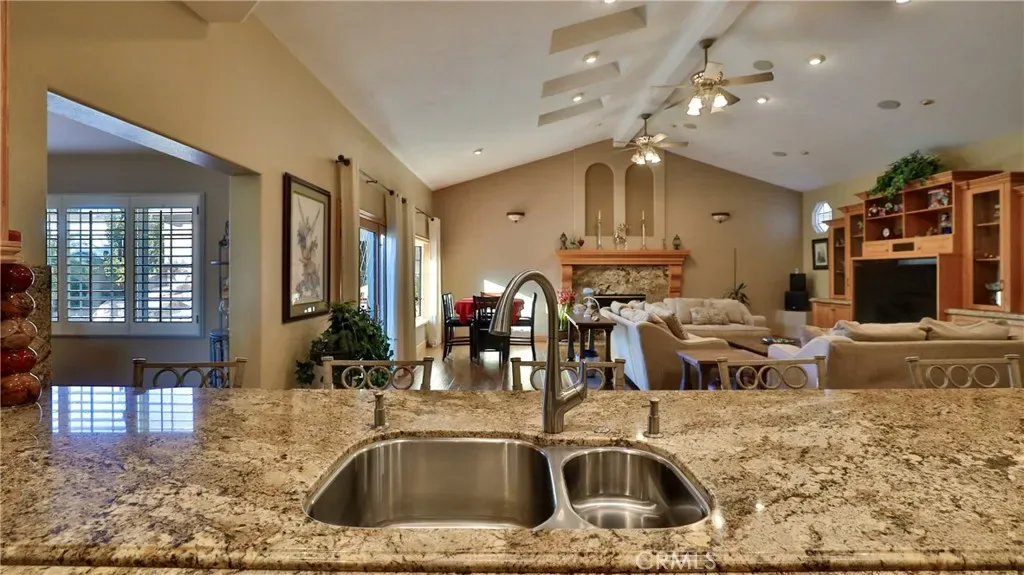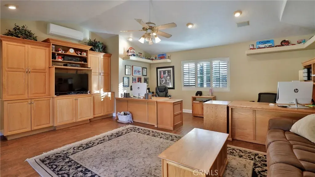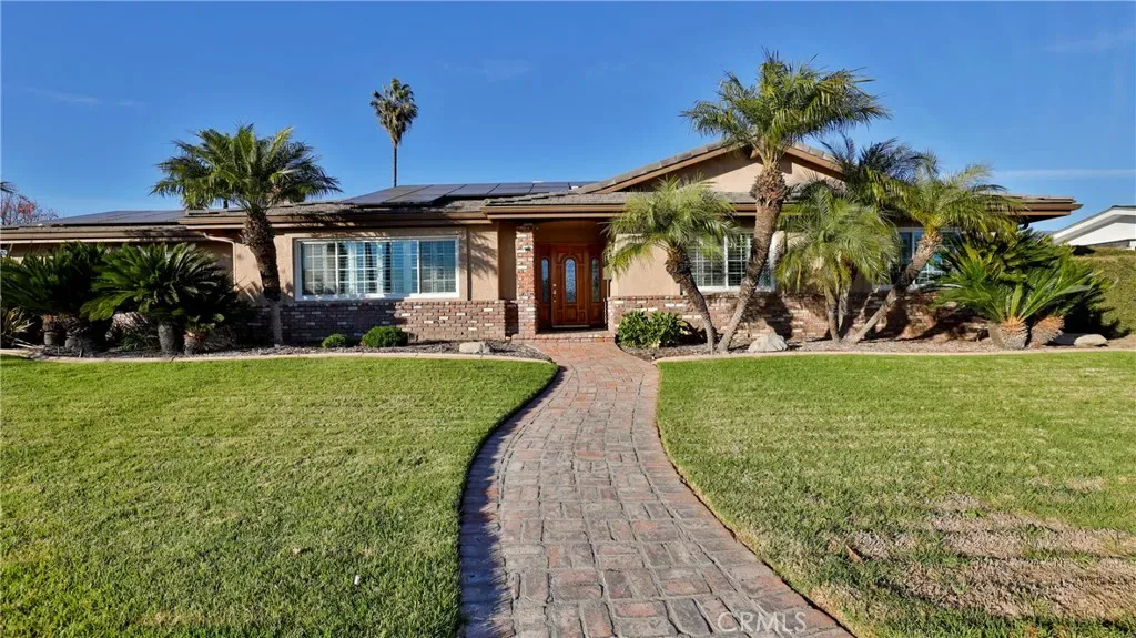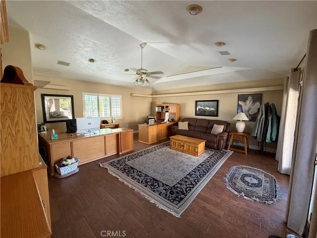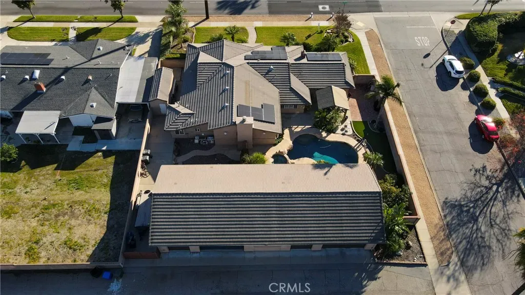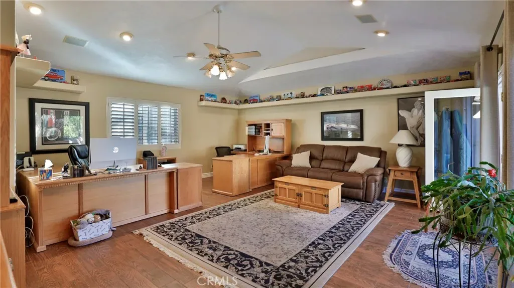 Additional living spaces include a comfortable living room, a dedicated dining room, and a large office, perfect for working from home or pursuing hobbies. Interior features include recessed lighting, plantation wood shutters, and ceiling fans throughout for year-round comfort. The primary bedroom boasts a walk-in closet with a pull-down ladder for easy access to additional attic storage. Enjoy indoor-outdoor living with a sliding door that opens to an inviting patio and sparkling pool. A hardwired alarm system ensures your peace of mind. Engineered hardwood floors enhance the living room, dining room, kitchen, and main bedroom with both beauty and durability. Two custom fireplaces add warmth and charm to the home’s living spaces. Garage and Exterior Features: A 28′ x 76′ detached garage at the rear of the property features four new garage doors, accommodating six or more cars, a hydraulic lift, and plenty of storage cabinets and shelving for organization. An additional RV pad includes an in-ground sewer line for convenient dumping. A custom-built detached shed (150 sq. ft.) with shelving provides even more space for tools or hobbies. The home and garage are topped with a durable tile roof and double paper for additional protection. 28 solar panels offer energy efficiency and cost savings. Copper plumbing was updated in 2002, and water lines from the meter to the house were replaced the same year. The block wall was rebuilt when the garage was constructed, ensuring privacy and security.