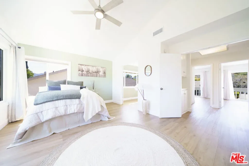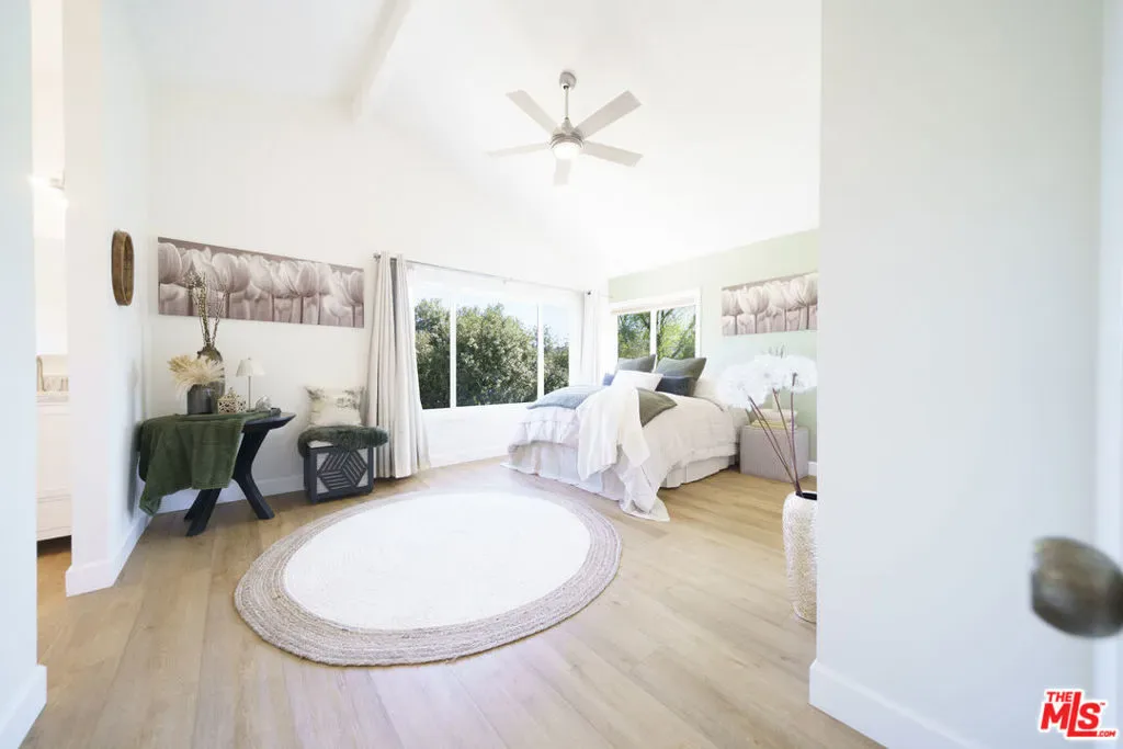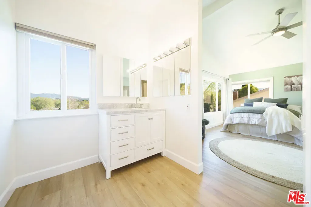 Panoramic Views & Seamless Indoor-Outdoor Living. Nestled in the heart of Valencia, this expanded Old Orchard II masterpiece blends Mid-Century Traditional charm with sophisticated modern updates. Designed for those who love light and scale, this home offers an unbeatable lifestyle and front-row seats to the California sunset. An open-concept living room featuring high cathedral-vaulted ceilings and a stylish statement fireplace. Upgraded wide-plank floors flow seamlessly throughout the entire home. The spacious kitchen features a central island, garden windows, and casual dining with views. A large family room with a fireplace ideal for supervised playtime or family movie nights. A convenient downstairs bedroom with sliding doors offers direct backyard access ideal for guests or a quiet home office. 4 separate access points to the “botanical garden” backyard create the perfect indoor-outdoor rhythm. Two West-facing bedrooms share an oversized front balcony, your private perch for stunning LA sunsets. Huge primary suite with cathedral ceilings, ensuite shower, and a massive walk-in closet perfect for a creative workspace or elite storage. Step directly onto the famous Valencia Paseo system. Walk or bike to top-rated schools, parks, and luxury shopping at the mall without ever crossing a major road. High-volume ceilings. High-end views. Welcome to your forever home.