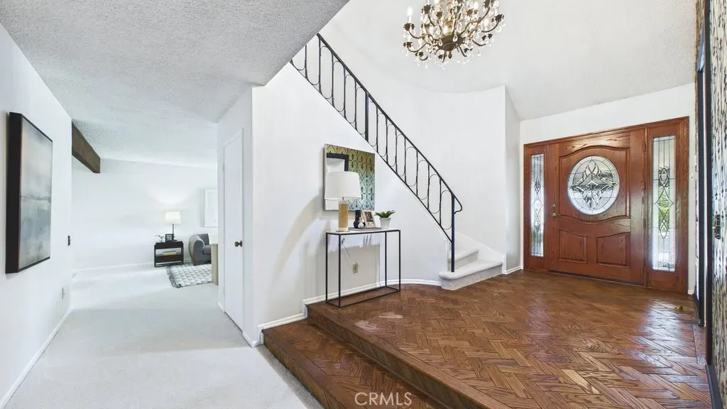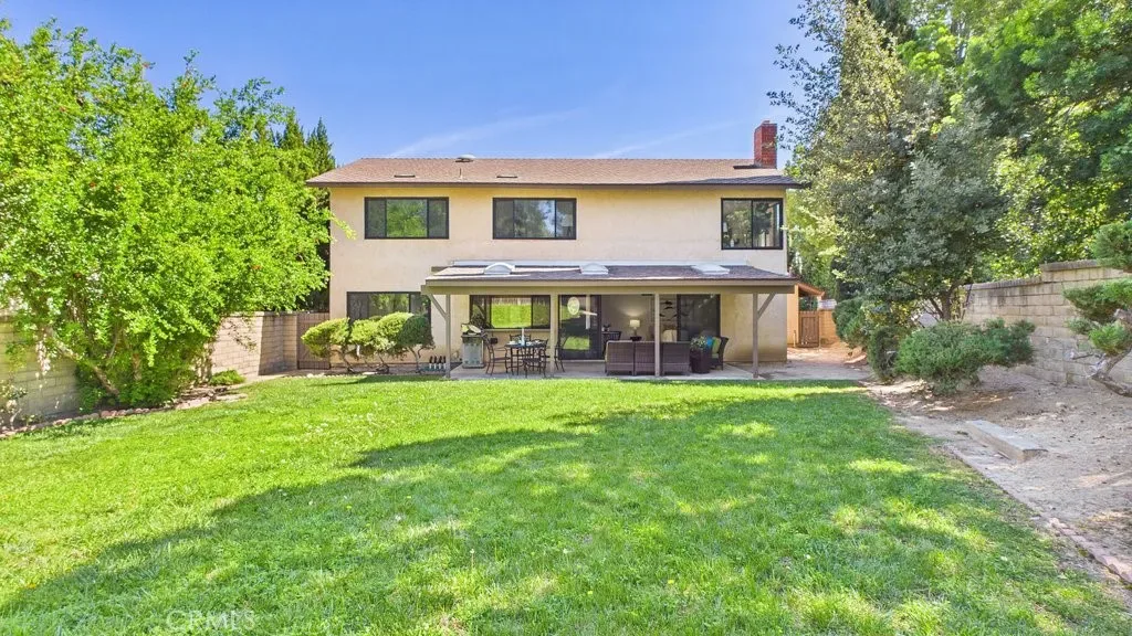A dramatic formal entry with soaring ceilings, skylight, and sweeping staircase creates a bright and welcoming first impression. The versatile floor plan includes a desirable main-level bedroom with an adjoining full bathroom and access to a private patio, ideal for guests, extended family, or a home office. The home offers multiple living spaces including a formal living room and dining room, along with an open-concept family room that flows seamlessly into the kitchen with stone countertops and a large window overlooking the backyard, creating an inviting setting for everyday living and entertaining. Upstairs features four additional bedrooms and two bathrooms, including a spacious primary suite with an ensuite bath and generous closet space. Large windows throughout the home allow natural light to fill the living areas. The covered patio and expansive backyard provide plenty of room for outdoor dining, entertaining, gardening, or simply relaxing and enjoying the Southern California lifestyle. Additional highlights include a 3-car garage, laundry area, 2 fireplaces, newer HVAC and roof.