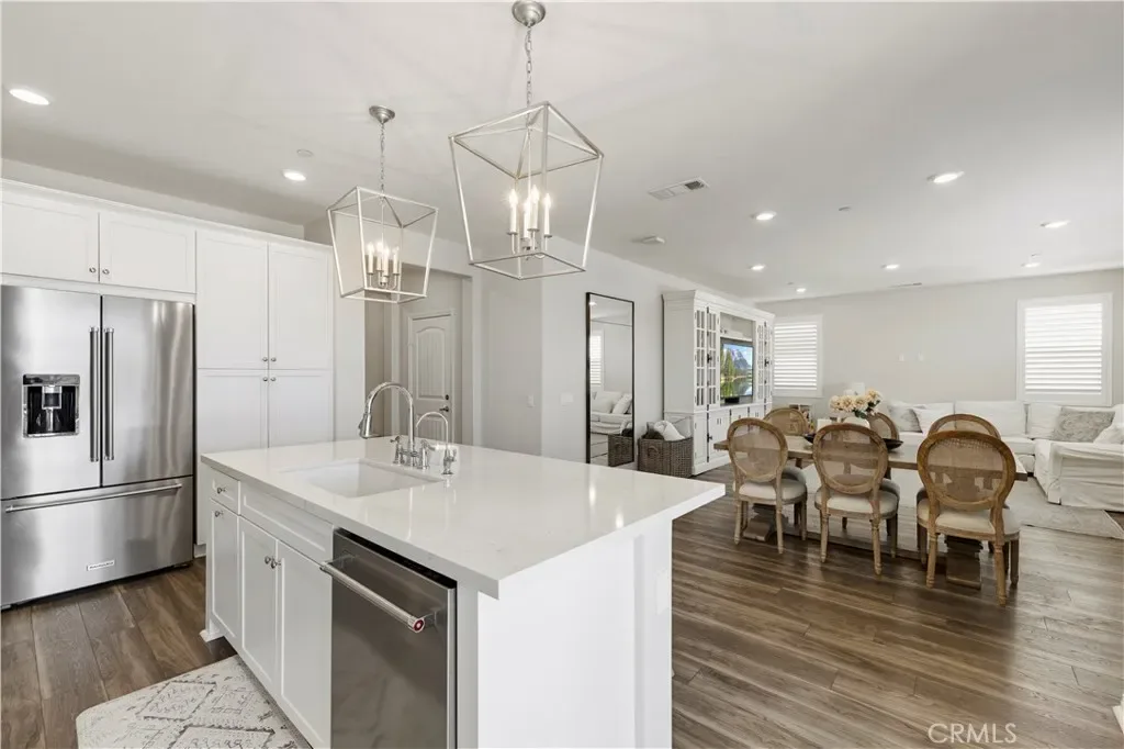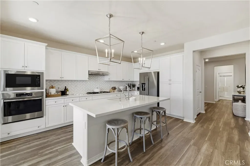 Inside, you’ll find luxury vinyl flooring throughout with no carpet, creating a clean, modern flow from room to room. The kitchen is elevated with quartz countertops, a custom herringbone backsplash, and upgraded KitchenAid appliances including a premium dishwasher and refrigerator.