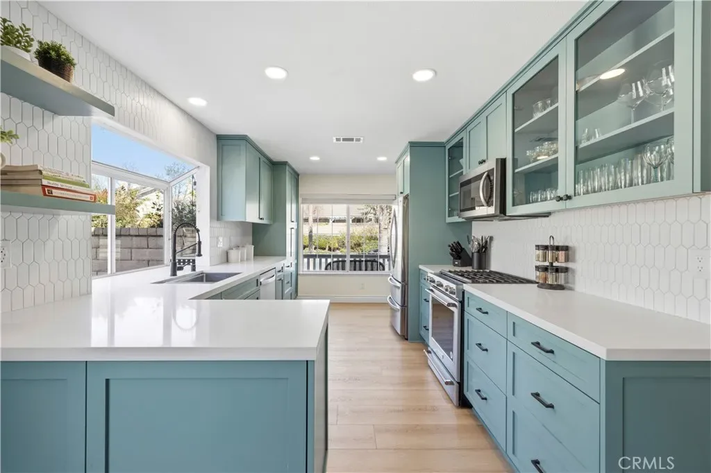 SINGLE-story POOL home, corner lot, featuring a beautifully remodeled kitchen and a backyard designed for entertaining! Welcome to this beautiful home in the highly desirable Northbridge community of Valencia. The inviting entry opens to a spacious living room highlighted by updated luxury vinyl plank flooring and a custom fireplace, creating a warm and stylish gathering space. The home flows seamlessly into the stunningly remodeled kitchen, featuring custom cabinetry, quartz countertops, and modern finishes, perfect for both everyday living and entertaining. The spacious primary suite offers a relaxing retreat with its own en-suite bathroom, while two additional bedrooms, a full hallway bath, and a private office space provide versatility for work or family needs. A whole-house humidifier system adds year-round comfort. Step outside to your private entertainer’s backyard, complete with a sparkling pool, covered patio ideal for outdoor dining, and low-maintenance turfed back and side yards. Additional highlights include a 2-car attached garage with epoxy flooring, ductless mini-split climate control, and an EV charger, offering both convenience and functionality.