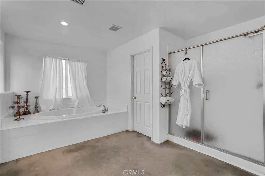 The primary suite offers a relaxing retreat with a walk-in closet and a luxurious en-suite bathroom, complete with dual sinks, a vanity area, a separate shower, and a soaking tub. A dedicated laundry room located upstairs includes a sink for added convenience.