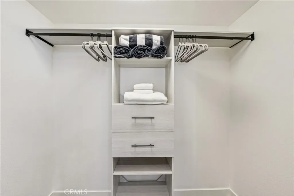 The spacious primary suite offers a walk-in closet and a spa-inspired en-suite bath with dual sinks and generous storage. The secondary bedroom includes its own full bath, walk-in closet, and direct access to the private patio—ideal for guests or shared living. A large laundry closet with side-by-side washer and dryer adds everyday convenience.