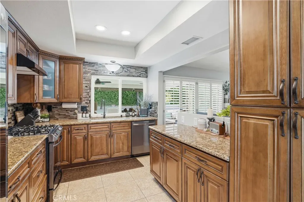 The spacious family room offers a cozy fireplace, abundant natural light, and serene backyard views, flowing seamlessly into the dining area. The upgraded kitchen is both stylish and functional, featuring granite countertops, upgraded cabinetry with pull-out drawers, quality appliances, and an open layout ideal for entertaining.