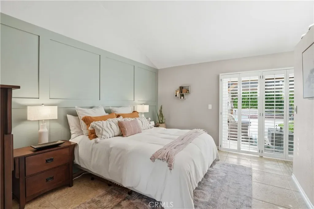 The primary suite boasts high ceilings, mirrored wardrobe doors, and direct backyard access. The remodeled en-suite bath showcases a sleek glass-enclosed walk-in shower. Two additional bedrooms and an upgraded secondary bathroom complete the interior.