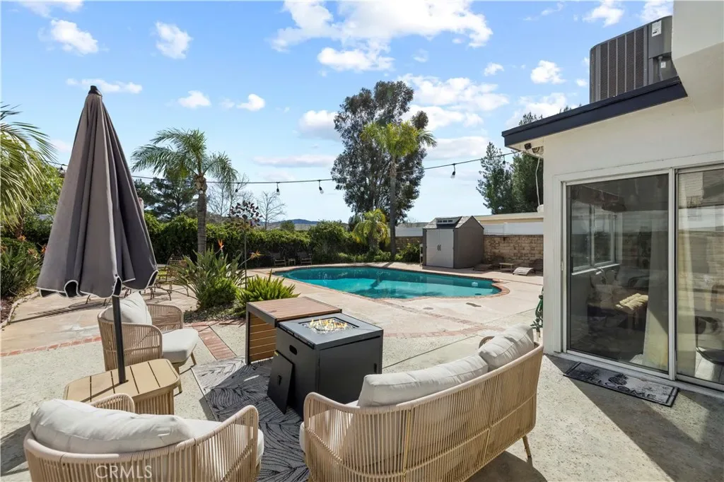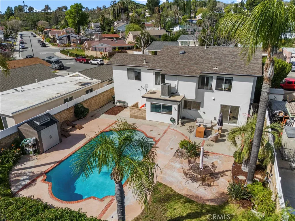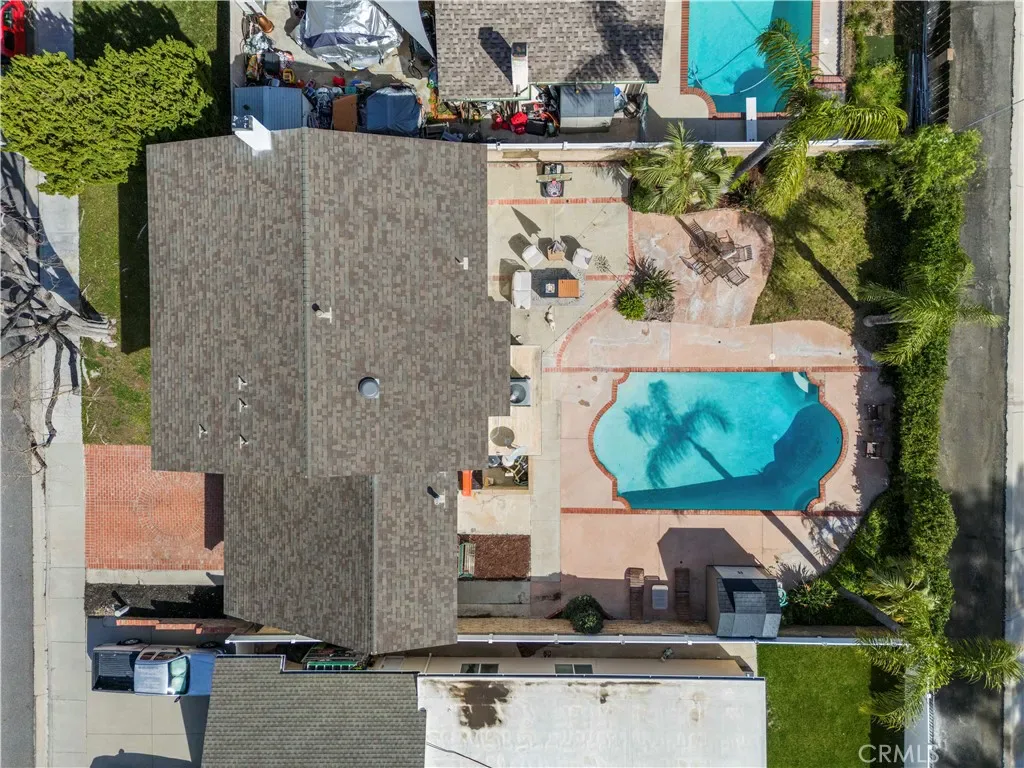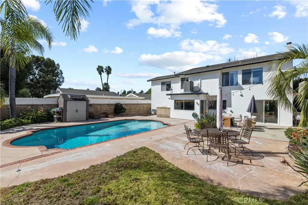 Uptairs, four generous bedrooms provide flexible living — one can easily be divided into a fifth bedroom or a home office. The master bathroom is nicely updated with travertine finishes, dual sinks, and dual shower heads, plus a walk-in closet. Practical updates within the last five years include a roof replaced in 2021, updated pool equipment, and a recently added tankless water heater; the home also features central A/C and heating, with a newer HVAC condenser. Bonus storage above the garage plus extra outdoor storage!