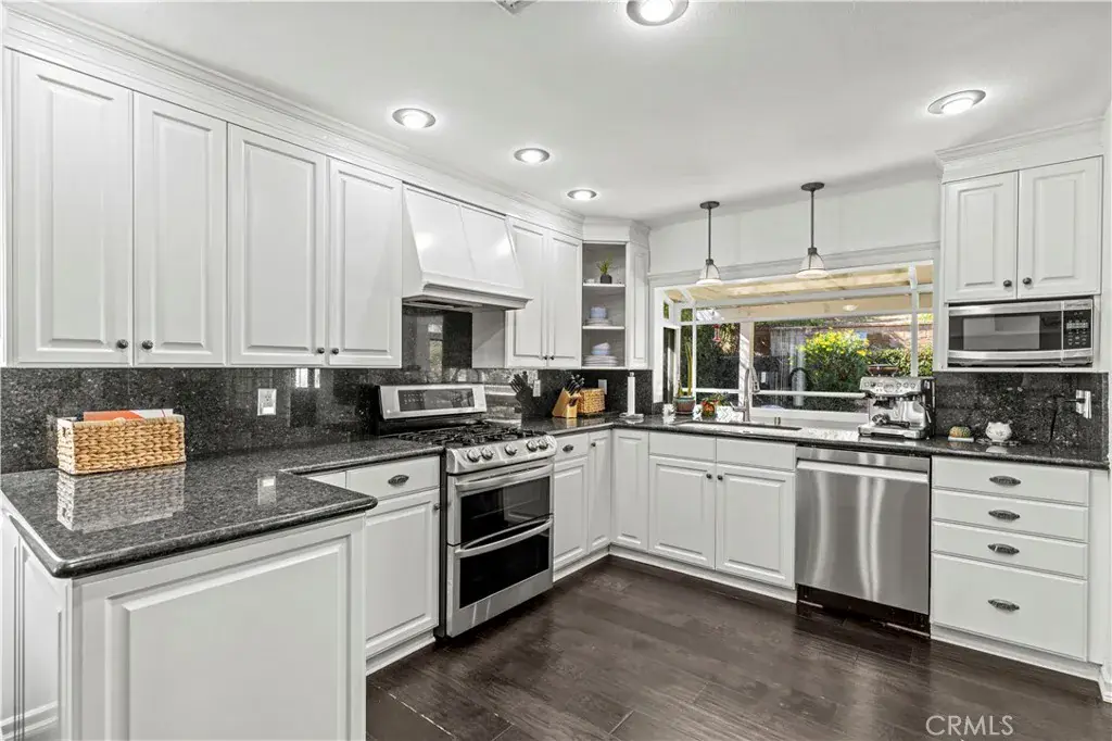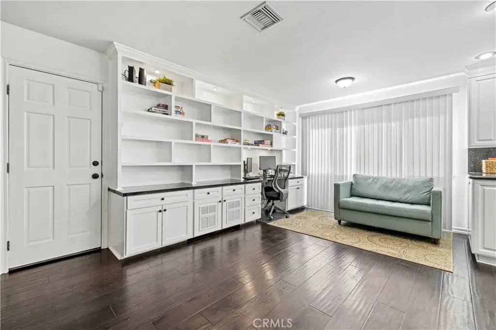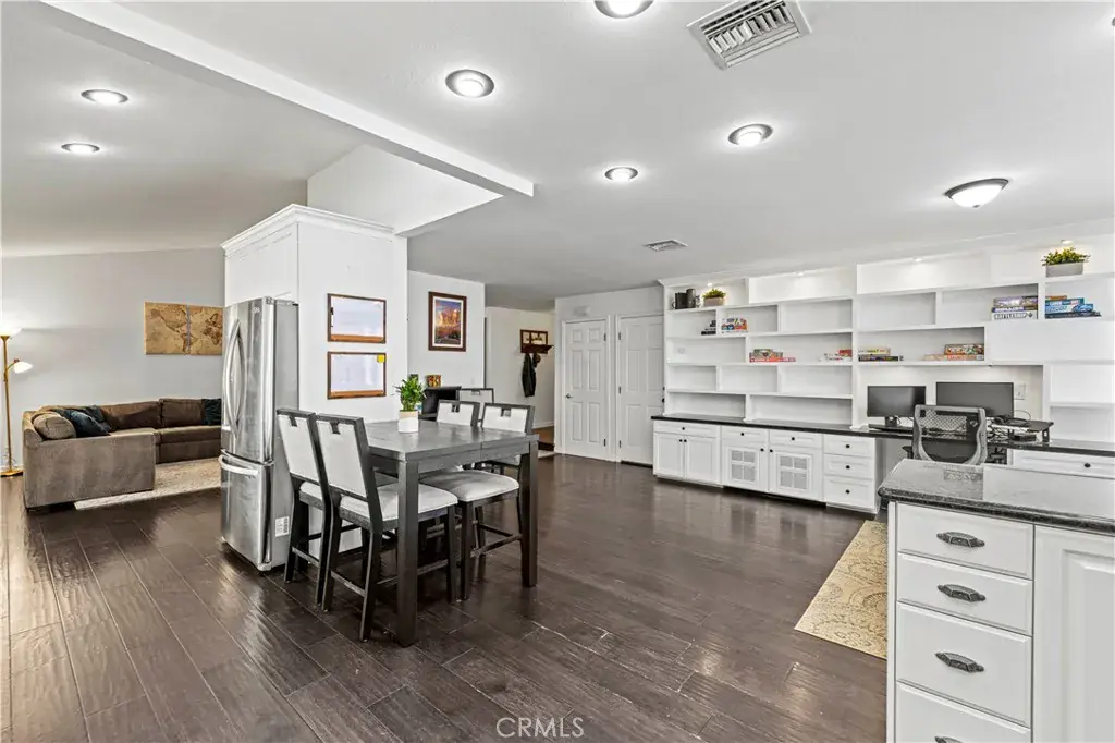 Inside, you’ll find wood flooring and an open layout that creates a comfortable flow between the kitchen and family room. Dual-pane windows and a whole-house fan enhance energy efficiency and everyday comfort. The kitchen offers white cabinetry, granite countertops, stainless steel appliances, recessed lighting, and added built-ins in the office area for extra storage and functionality. It opens directly to the living spaces, making it practical for daily living and gatherings alike.