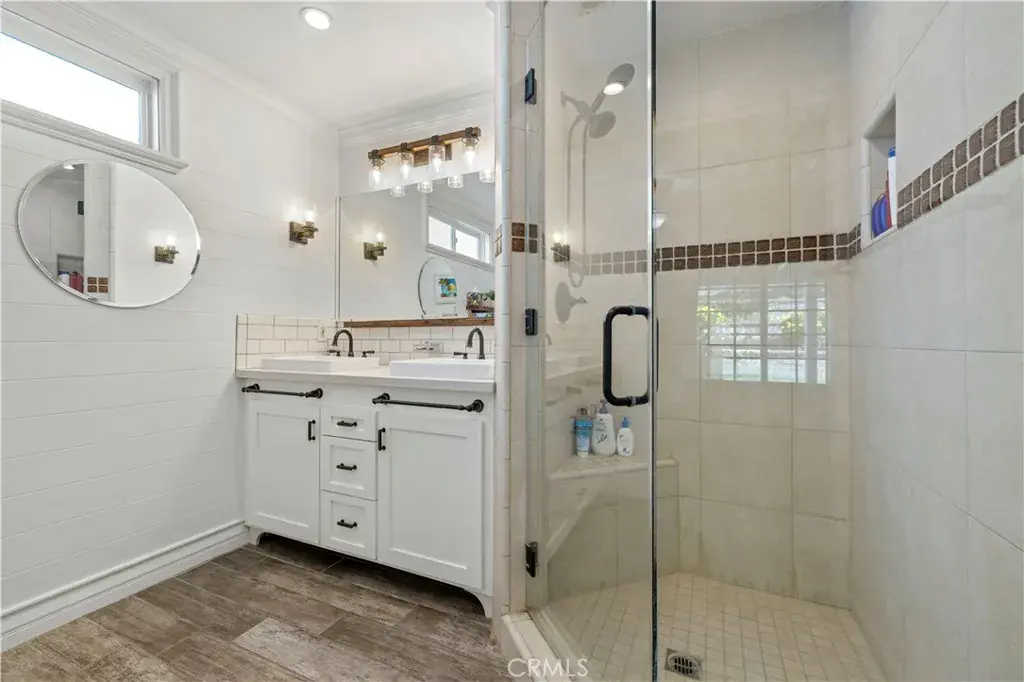 The primary suite includes custom built-ins in the closet and a remodeled ensuite bathroom with a large shower, quartz countertops, and subway tile backsplash. Three additional well-sized bedrooms share a remodeled hall bathroom.