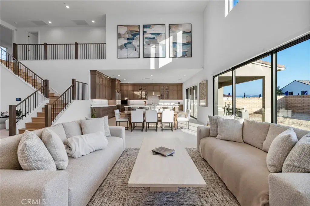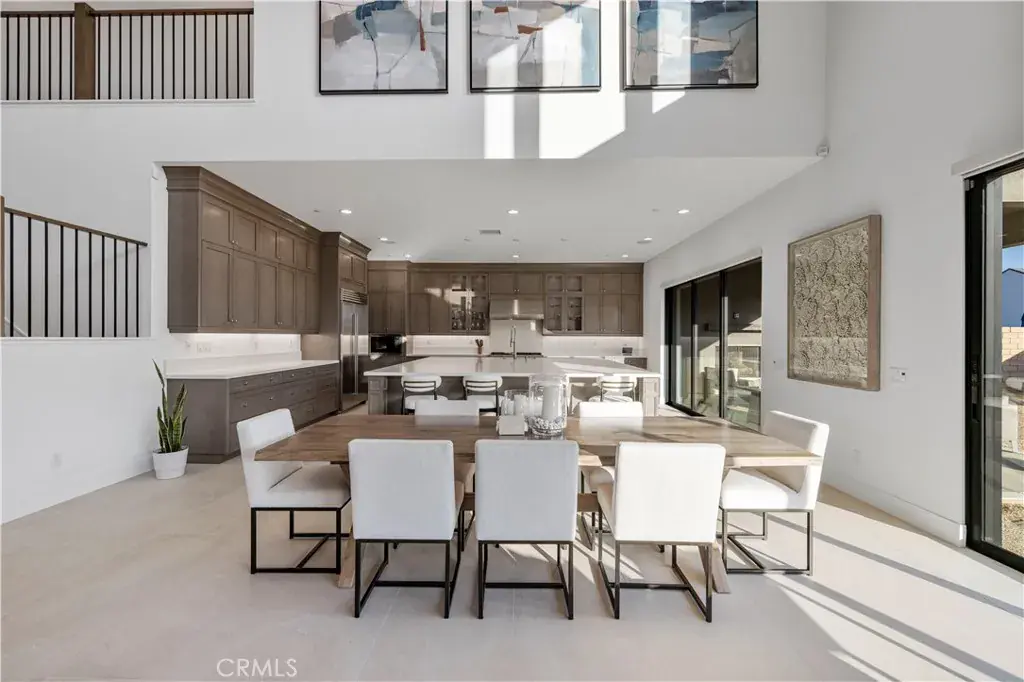 At the heart of the home is a gourmet chef’s kitchen, equipped with a massive center island, walk-in pantry, custom cabinetry, and a seamless pass-through to the formal dining room. The kitchen opens to a spectacular double-height great room—perfect for hosting or relaxing in front of sweeping landscape views. Indoor-outdoor living comes alive as you step into your private backyard retreat, ideal for alfresco dining, lounging, and golden-hour sunsets.
