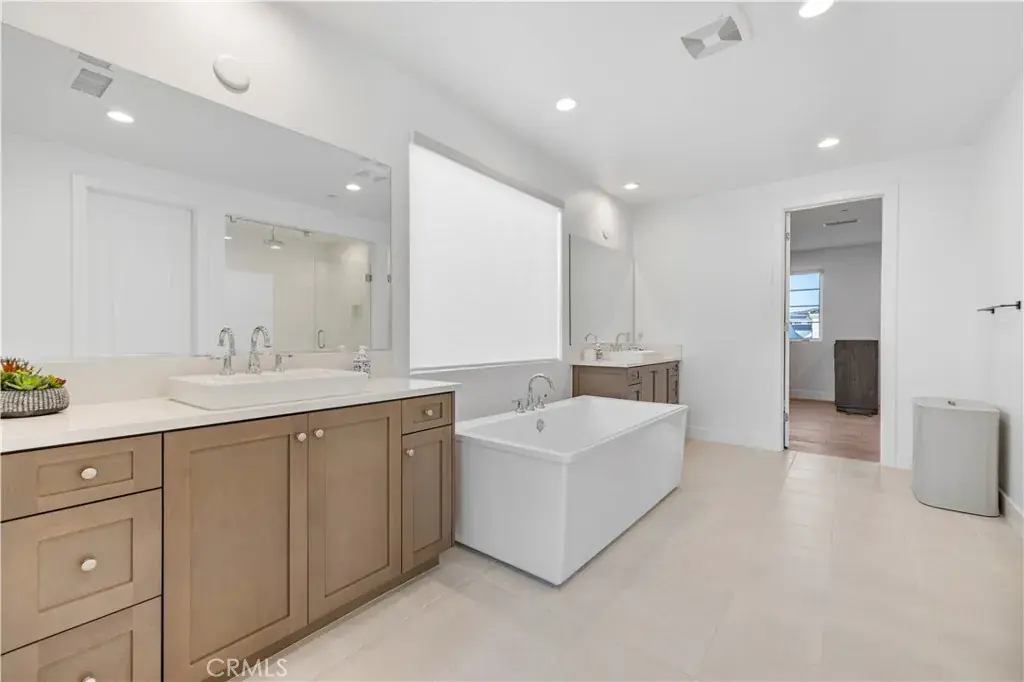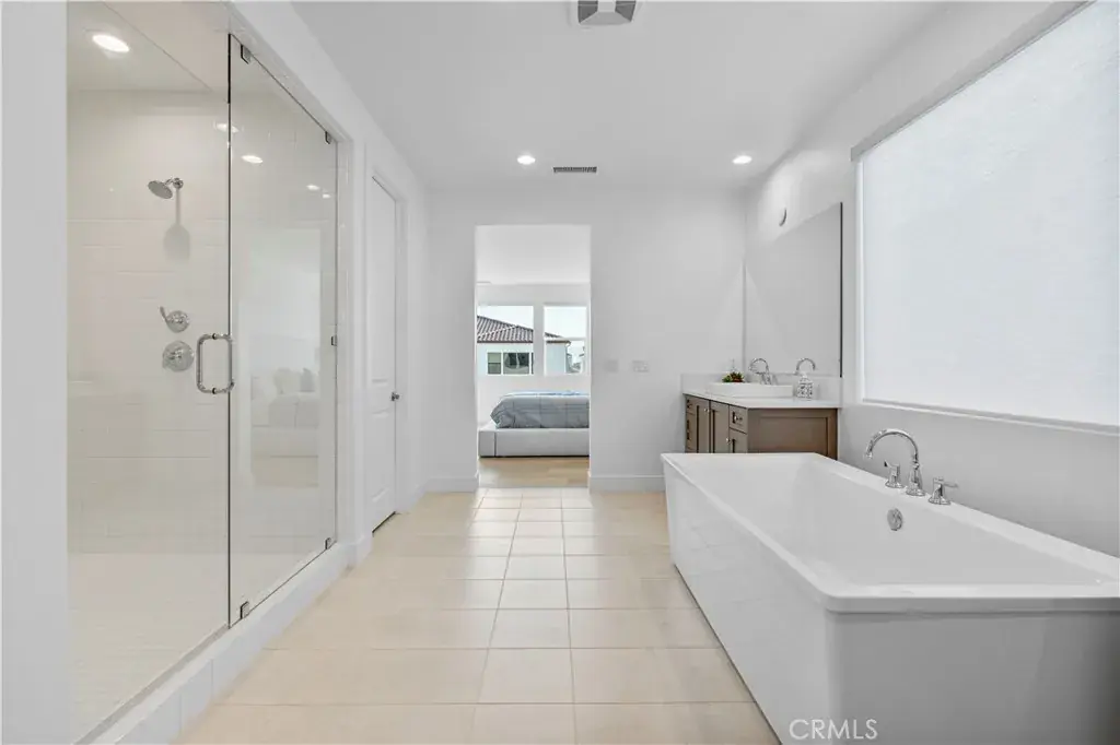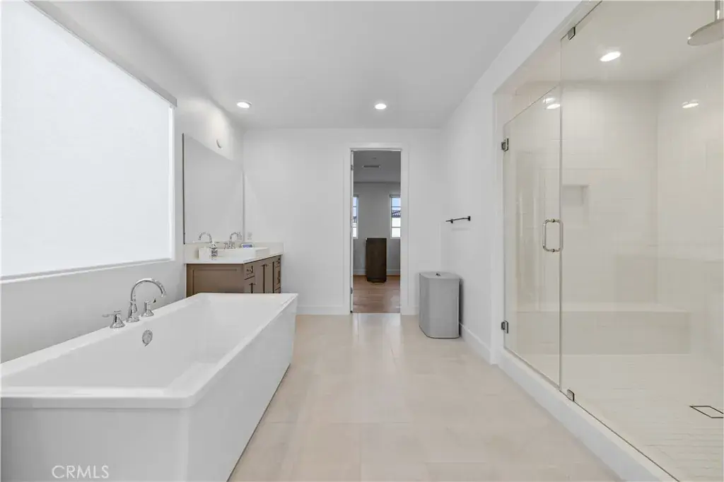 The main level features two flexible-use bedrooms—perfect for a home office, guest suite, or gym—while the upper level hosts three spacious bedrooms, a second family/bonus room, and the crown jewel: a luxurious primary suite. This private sanctuary includes dual vanities, a soaking tub, oversized walk-in shower with built-in seating, and a grand walk-in closet.
