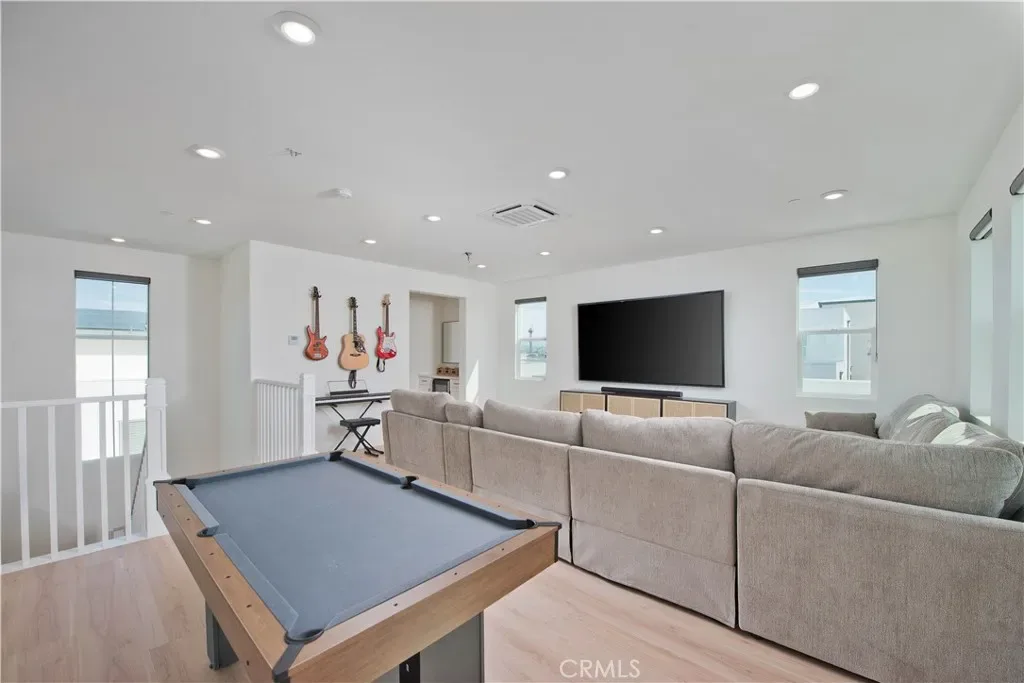 Welcome to this stunning modern detached home in the Rosemist community of FivePoint Valencia. Situated on a prime corner lot, this expansive 5-bedroom, 4.5-bathroom, three-story residence offers over 3,300 square feet of thoughtfully designed living space with scenic mountain views. Upon entry, you’re greeted by a bright open-concept floor plan featuring sleek laminate flooring throughout and stylish designer light fixtures that create a clean, contemporary feel. The gourmet kitchen features a large center island with bar seating, sleek upgraded countertops with a herringbone backsplash, abundant storage, and stainless steel appliances including a professional-grade 6-burner cooktop with griddle, range hood, and built-in refrigerator. The kitchen opens to the living and dining areas, perfect for both everyday living and entertaining. The first level includes a convenient bedroom and full bathroom with updated fixtures and a Mid-Century modern vanity, ideal for guests or multi-generational living. On the second level, the spacious primary suite offers two closets including a walk-in closet, and an en-suite bathroom with dual vanities and a separate shower and bathtub. The second floor also features three additional bedrooms, including one with its own en-suite bathroom, another full bath, and a laundry room with plenty of storage. The third floor features an expansive bonus room complete with a connecting dry bar and powder room, offering a versatile space ideal for a home office, gym, or media room. Sliding doors open to a covered deck with sweeping mountain views. Designed for indoor-outdoor living, expansive corner sliding doors open to the California Room, seamlessly connecting to the backyard with low-maintenance artificial turf. Additional highlights include an attached 2-car garage with extra storage, direct home access, and two EV chargers, plus solar panels and a backup battery system. Enjoy the community’s impressive recreation areas. Just across the way is Confluence Park, an HOA recreational area featuring swimming pools, a spa and splash zone, lounge areas, a clubhouse, a park, and more. In addition, the community offers a community garden, pump track, and miles of scenic trails for residents to enjoy. Conveniently located minutes from Valencia Town Center, Six Flags Magic Mountain, shopping, dining, parks, and hiking and biking trails, with easy freeway access.