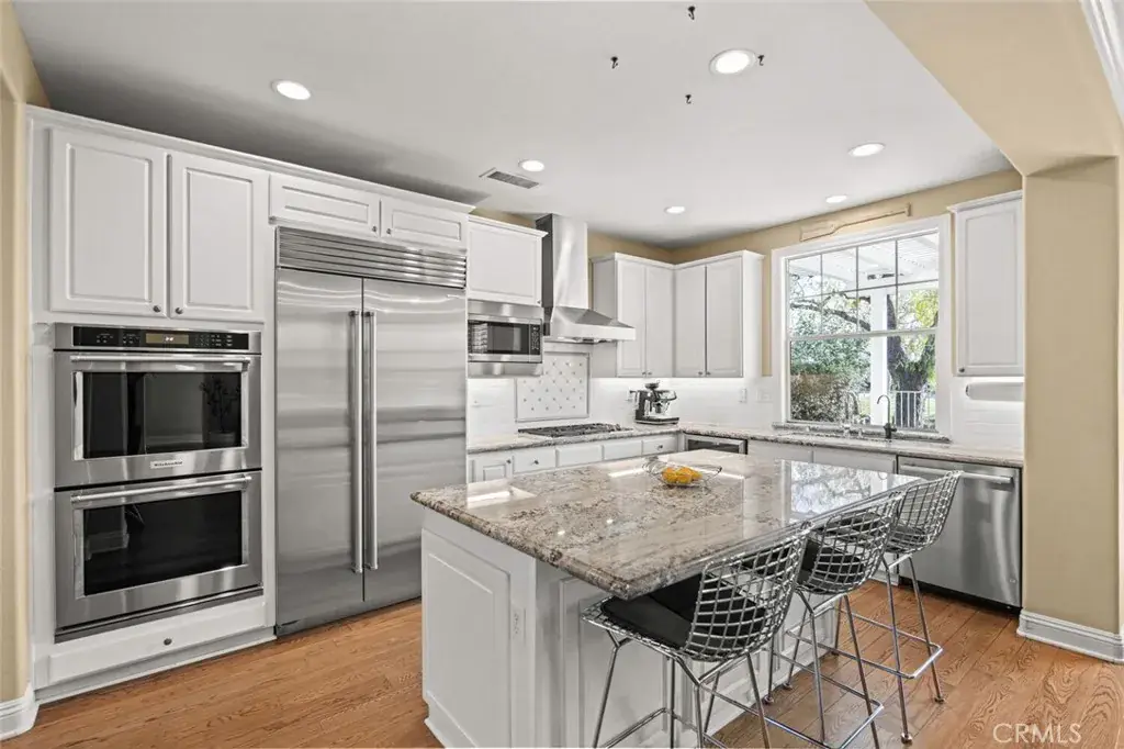 The residence features four bedrooms plus a downstairs flex room (currently used as a gym) with a full bath nearby, ideal for an office or optional bedroom. The kitchen was enhanced in 2024–2025 and includes a Sub-Zero refrigerator, opening to the main living area and backyard views.
