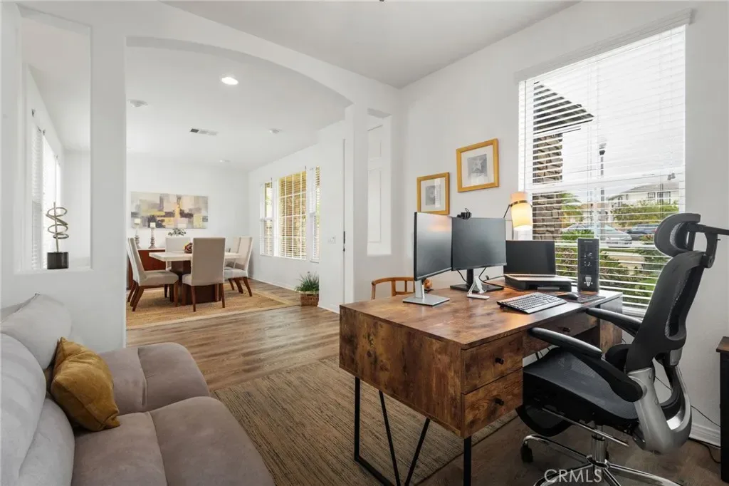 Welcome to the highly sought-after Creekside community in Valencia, known for its charming homes and welcoming atmosphere. This spacious 4-bedroom, 3.5-bathroom home offers a formal dining room, dedicated office, and an inviting main room ideal for everyday living and entertaining. The open-concept kitchen is equipped with a center island, ample cabinetry, and direct access to the garage, seamlessly connecting to the main room. The formal dining room is perfectly sized for hosting large dinners and special occasions. All four bedrooms are located upstairs, including a generous primary suite with abundant natural light, a walk-in closet, and a private balcony. A conveniently located upstairs laundry room adds everyday ease. Outside, enjoy a beautifully maintained backyard, offering a peaceful setting for relaxation or entertaining. Additional highlights include a three-car garage and a prime location within a short distance to Valencia High School, parks, shopping, dining, and local markets. Move-in ready with NO Mello Roos—this is a rare opportunity to own in one of Valencia’s most desirable neighborhoods.