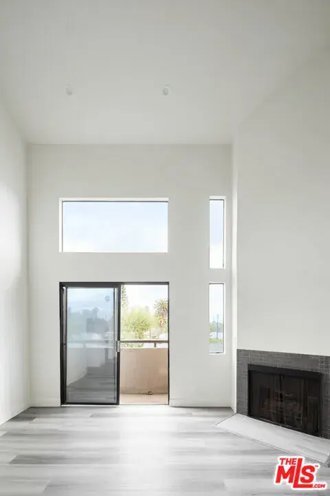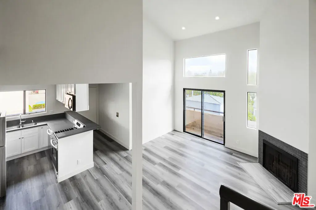 TOP FLOOR 2-story remodeled end unit loft apartment with only one common wall and an abundance of light. 30 feet high ceilings with lots of windows greet you as you enter. New kitchen with stainless steel appliances, quartz countertops and all new cabinetry. The living room has a fireplace and balcony with views of the mountains and tree tops. Huge primary bedroom on the main floor with an extra large walk-in closet and private balcony. Wood laminate floor throughout. 2nd floor has another bedroom and bathroom. Central-AC and lots of extra closet space in the unit. Two side by side parking spots in a gated garage. This is a small 10 unit building in the heart of Valley Glen in Van Nuys. PET FRIENDLY