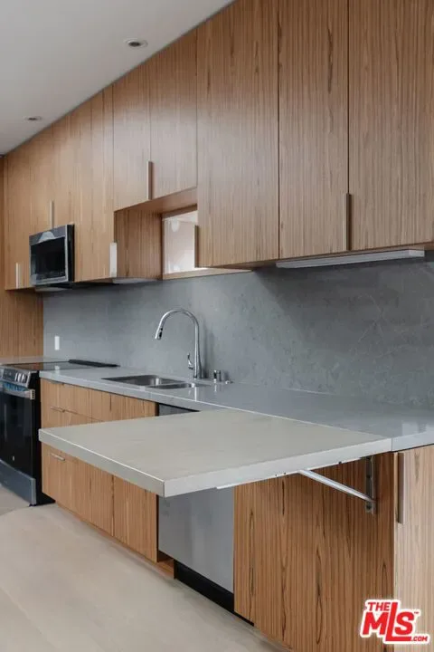 Newly built architect-designed home in the heart of Venice, just three blocks from the beach. Never lived in. This light-filled unit features dramatic geometric windows, a large overhead skylight, a glass floor that fills the bottom unit with natural light, and an open, modern layout that emphasizes privacy. Enjoy a compact, efficient kitchen with new appliances, built-in seating, generous storage, and a movable TV on a track that allows viewing from any part of the bottom floor. Dual balconies provide outdoor space on both sides of the unit, and the property is fully gated with tall hedges and lush landscaping for exceptional seclusion. On-site parking is available within the gated lot.In-unit washer-dryer included in a striking modern detached two-unit project, designed with sculptural lines and clean contemporary finishes. This is a general description of the complex. Individual units may vary slightly.