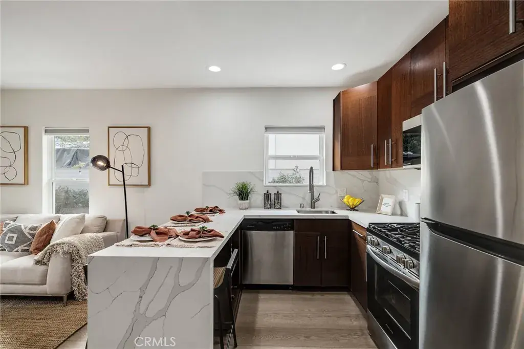 Welcome to 724 San Miguel Ave, a beautifully updated single-family home nestled in the vibrant heart of Venice. Just a short walk from the iconic Abbott Kinney Blvd and the stunning Venice Beach, this residence offers the perfect blend of charm and modern convenience. This recently renovated 3-bedroom, 3-bathroom home boasts a host of upgrades, including new quartz kitchen countertops, state-of-the-art kitchen appliances, a brand-new HVAC system, and elegant engineered hardwood floors. The interior and exterior have been freshly painted, complemented by recessed lighting throughout. Upon entering, you’ll find an open-concept living area that seamlessly connects the kitchen and living room. The entry-level features two bedrooms, each with large walk-in closets and dual-pane windows that flood the rooms with natural light. The back primary bedroom includes an en-suite bathroom and opens up to a private backyard patio and charming yard. Additional storage is available in the spacious attic, easily accessible via a pulldown ladder. Upstairs, discover a bright and cheerful third bedroom with its own en-suite bathroom, ample closet space, and a private porch—perfect for enjoying your morning coffee. Outdoor enthusiasts will appreciate the ultra-private fenced-in yard with multiple areas for entertaining. Parking is convenient with space for two cars in tandem in the driveway and additional street parking available. Don’t miss your chance to own this stunning home in one of Venice’s most sought-after locations. Schedule a viewing today before it’s SOLD!
