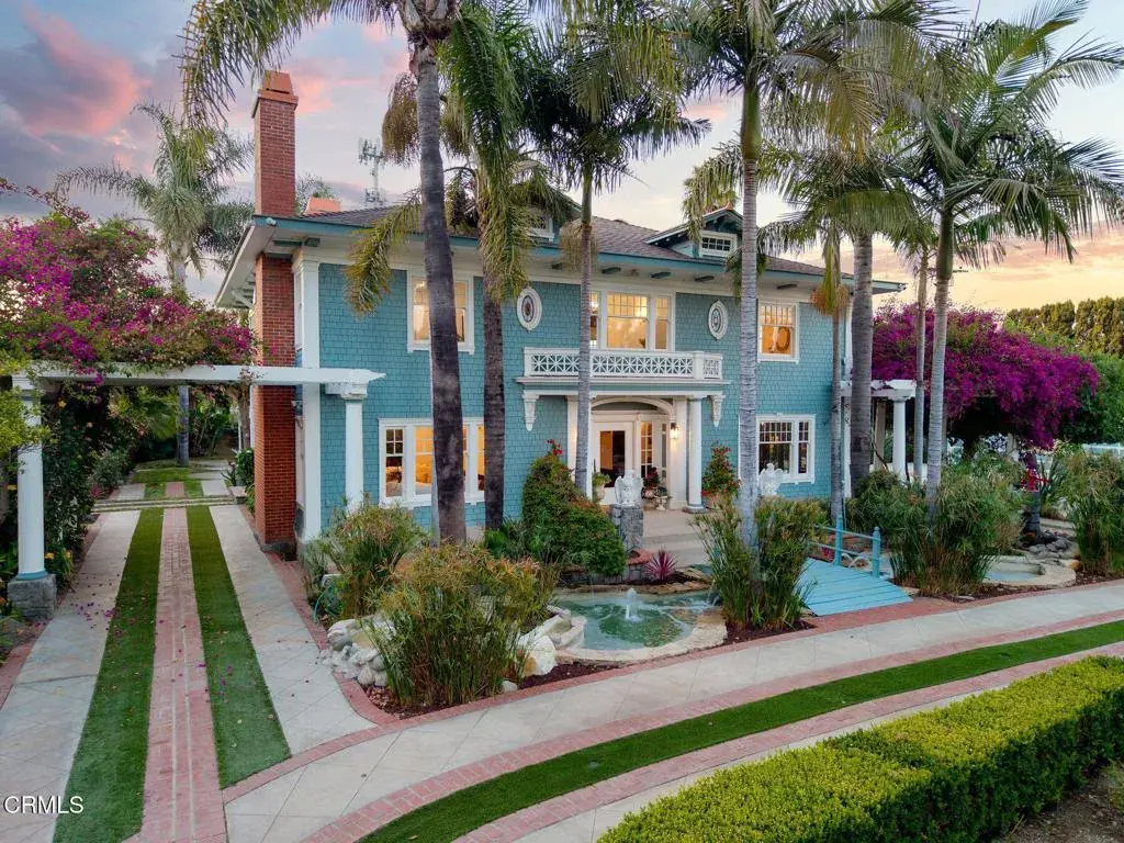 Welcome to Palm & Proper — a rare Ventura estate where timeless craftsmanship meets modern luxury. Originally built in the 1920s and thoughtfully restored, this Hamptons-inspired home blends historic character with curated, high-end finishes throughout.The heart of the property is a stunning pool courtyard flanked by the main residence and two charming guest houses, creating a private, social retreat ideal for gathering, relaxing, or entertaining in style.Inside the main home, every detail has been elevated — from the classic millwork and marble finishes to the custom kitchen, butler’s pantry with copper sink, bespoke wetbar and lounge and sophistication of a hidden wine cellar. Each room feels both fresh and rooted in history.Step beyond the Craftsman charm and into a private paradise–Palm & Proper’s lush, gated grounds are a showpiece in their own right. Wander through blooming bougainvillea, tranquil koi ponds, and bubbling fountains that set the tone for resort-style living. The sparkling pool, outdoor shower, and hidden grotto invite pure relaxation, while the built-in BBQ, fire pit, and multiple al fresco dining spaces make entertaining effortless. Several raised garden beds–set apart among mature fruit trees–offer a true farm-to-table experience. Even the practical elements are artfully integrated, with garages and ample parking tucked away, and carports cleverly hidden behind flowering bougainvillea.Framed by stately palms and ideally situated for refined ease of travel and connectivity, this estate is a true nod to the beauty of Ventura’s landscape and idyllic climate. It’s a place where sophistication and coastal lifestyle effortlessly meet.