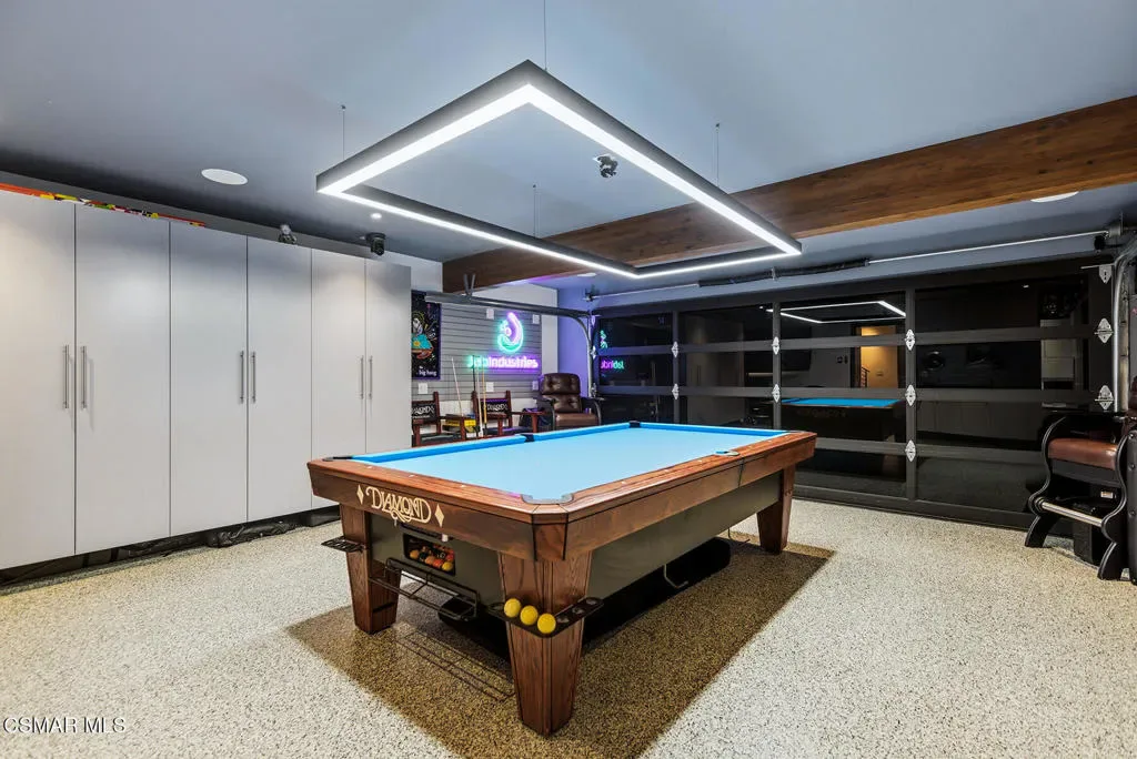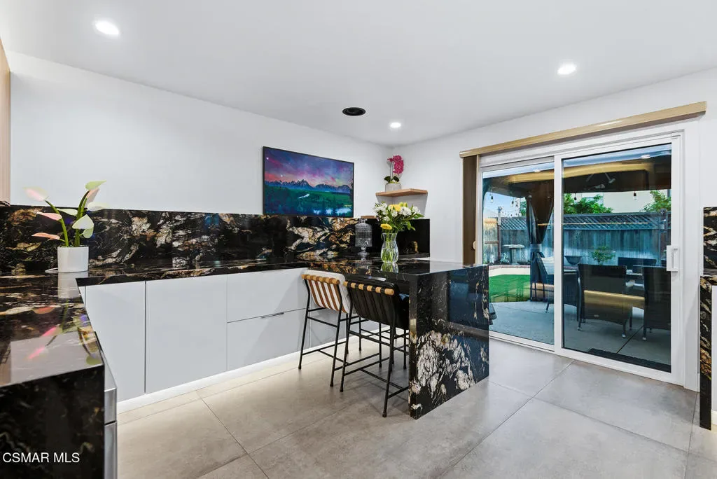 Welcome to a truly one-of-a-kind modern home in the heart of Ventura, where thoughtful design, high-end finishes, and effortless entertaining come together beautifully. Located at 9998 Jamestown, this exceptional residence blends contemporary luxury with everyday comfort in a desirable, established neighborhood. From the sleek smooth-stucco exterior and metal roof to the landscaped front yard with synthetic turf, low-voltage lighting, and a serene Buddha water feature, every detail has been carefully curated to create a striking first impression. Inside, the open great room impresses with large-format concrete tile floors, skylights that flood the space with natural light, base lighting, a dramatic custom onyx fireplace, and a built-in Dolby Atmos sound system. French doors with built-in shades and blackout blinds create a seamless indoor-outdoor flow and a comfortable, modern ambiance. The gourmet kitchen is both stylish and functional, featuring custom two-tone cabinetry, a Wolf range, built-in JennAir refrigerator, Fisher & Paykel drawer dishwasher, microwave drawer, and striking Golden Spectrolite granite countertops with waterfall edges. An extended dining area with wraparound cabinetry and built-in storage adds to the home’s effortless entertaining appeal. A custom bar elevates the space even further, offering a Sub-Zero mini fridge, Viking ice maker, onyx bar top, and ambient accent lighting, perfect for hosting or unwinding at the end of the day. The primary suite is a private retreat with real wood floors, a smoked mirror feature wall, and a spa-inspired bathroom complete with marble countertops, a Toto toilet, zero-threshold drains, custom glass enclosures, and a luxurious steam shower.Step outside to a backyard designed for memorable gatherings, featuring synthetic turf, citrus trees, low-voltage lighting, and a pergola with curtains and soft lighting for relaxed evenings under the stars. The garage is a true bonus space with showroom-style epoxy floors, custom cabinetry, a mini-split system, built-in speakers, a washer and dryer, and premium lighting, ideal for a home gym, studio, or ultimate hangout zone. With smart features, upgraded electrical, a tankless water heater, soft-water system, Milgard windows and doors, and a glass garage door, this exceptional home at 9998 Jamestown, Ventura, CA delivers modern luxury, comfort, and turnkey living at its finest.