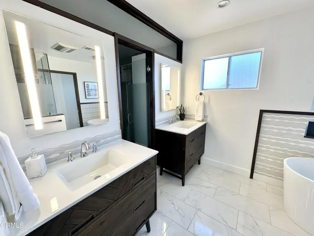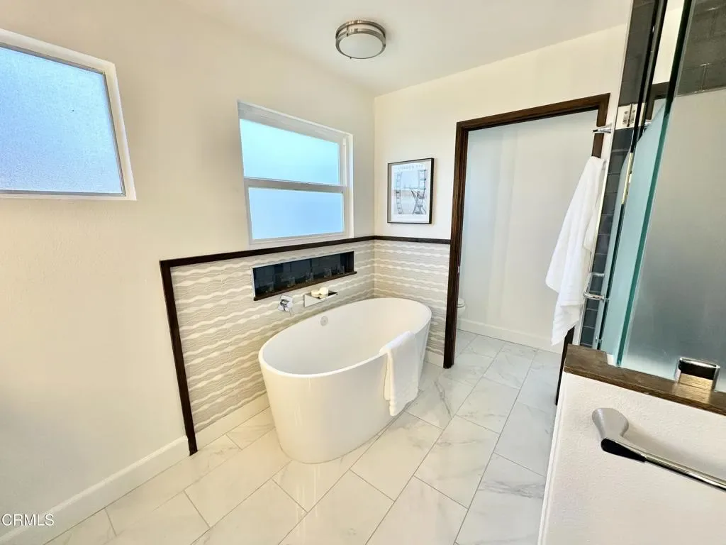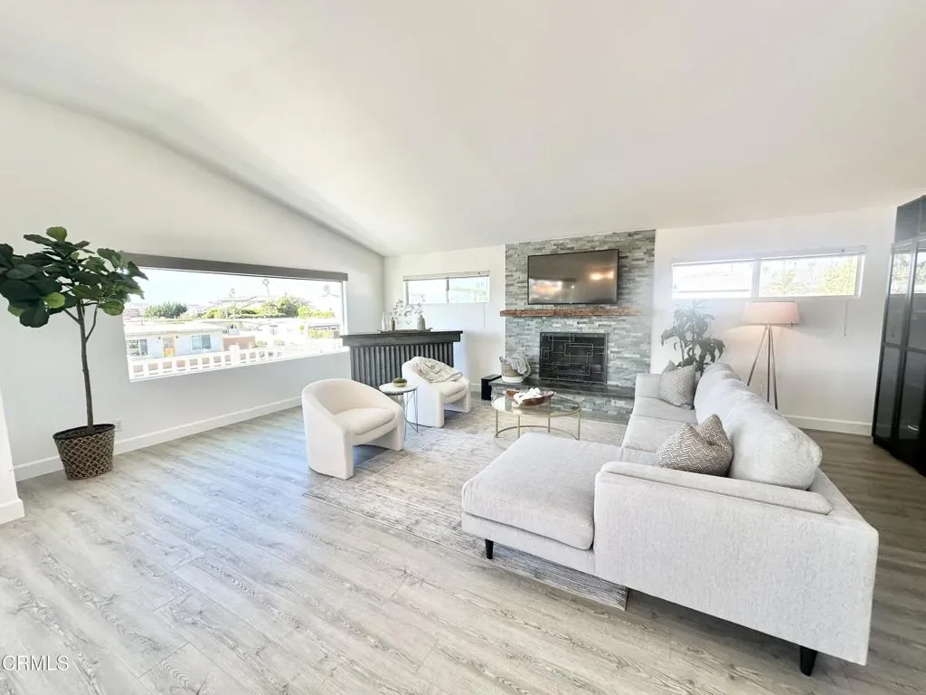 Idyllic California Coastal lifestyle! Enjoy the ocean breeze, walk your dog just 2 short blocks to Marina Park and ‘the Mermaid’ or down the lane directly to your private neighborhood beach. Local attractions are plenty, with Leo Robbins Community Sailing Center or ride your bike to the restaurant district at the end of Seaward Ave. Welcome to 2827 Pierpont Blvd, in one of of Ventura’s most desirable seaside neighborhoods. Upstairs features open concept living room with Core-Tec flooring, beautiful rustic hearth and fireplace, picture windows facing Pierpont, remote controlled shades, and the slider takes you to the balcony to enjoy afternoon scenes and sunsets. Dining area has custom lighting, LG dishwasher, Kitchen Aid oven with Wifi connectivity, 4 burner gas stove, stainless sinks, beachy back splash, and a walk in pantry! Primary bedroom with tall ceilings, views of Two Trees, attached bath with custom sinks, lighted mirrors, walk in California closet with full organizers with jewelry drawers. Spa-like shower with frosted doors. Luxurious Victoria and Albert limestone tub. Marble floors top off this gorgeous Primary bath. Second upstairs bedroom with en suite bathroom with bathtub/shower combo. All 4 bathrooms have been remodeled. Downstairs features a fully functional ADU, freshly painted, private entry, full kitchen, 4 burner stove with oven, refrigerator, cabinets for storage, bathroom with shower, vanity and sink, walk in closet, living room with slider to backyard, laundry room with utility sink. Living room with slider to backyard, large laundry room with utility sink. Another storage closet in foyer with pocket door! Two car attached garage with wall to wall built in storage cabinets, and more storage shelves. Added bonus includes a 240 volt electric car charger, and 23 home solar panels for EV ‘driving on Sunshine’ . Outside, the property offers large patio, fire pit, Hotsprings Hot Tub, privacy with large trees, garden shed and dog run, making the back yard a great place to relax and enjoy your day. If you are looking for a weekend retreat, investment property or a primary residence this location is ideal, provides beach lifestyle and luxury living.