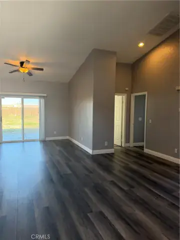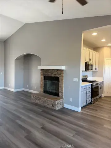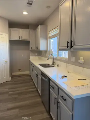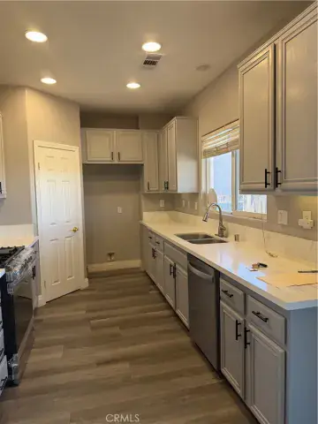 Very pretty, Large living area, Gray wood flooring (laminate) Bright and cheery. Split floor plan. One of the Bedrooms suited well as an office or den. Nice kitchen, New stove. Easy maintenance front yard. Indoor Laundry with plenty of storage. Great location to access Bear Valley rd or Palmdale rd.