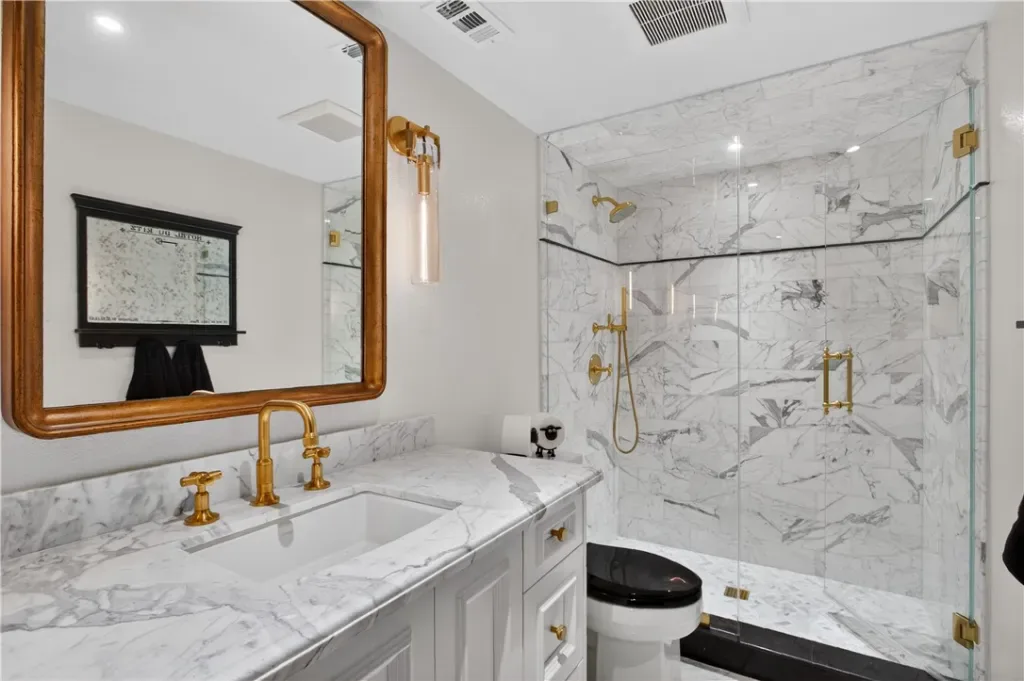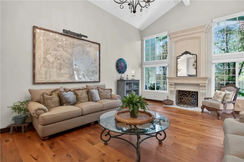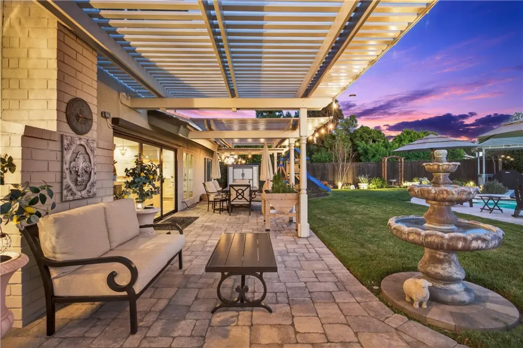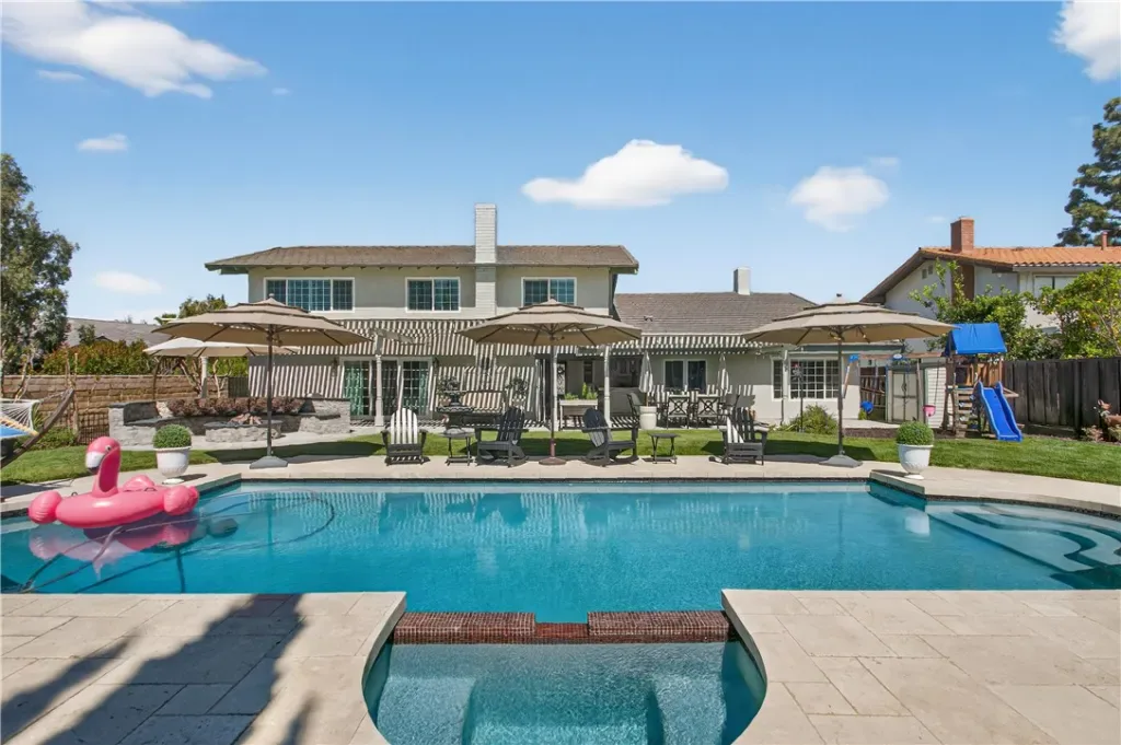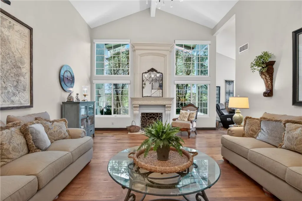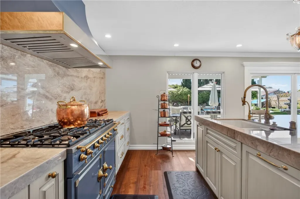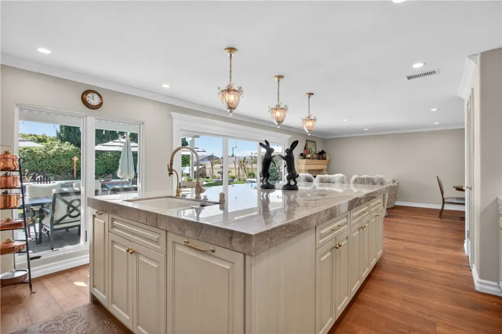 This immaculately finished Villa Park estate sets the standard for sophistication, creativity, and timeless appeal. Offering 3,600 sq ft of living space on a generous 12,000 sq ft lot, this 4-bedroom, 3-bath stunner delivers luxury at every turn. The experience begins at the curb: lush, manicured softscape pairs with crisp architectural lines, stacked stone accents, carriage-style garage doors, and a custom wrought-iron privacy fence, evoking instant exclusivity. Step through high-end custom lead-glass double doors onto finely honed marble floors. A striking custom staircase with decorative wrought iron is coupled with a showstopping Schonbek chandelier. The formal living room features soaring ceilings, a dramatic two-story precast fireplace surround, an impressive chandelier, and abundant windows that blend grandeur with warmth and comfort. The former dining room now serves as a versatile flex space—ideal for entertaining guests or enjoying a quiet movie night. The kitchen is a culinary masterpiece: French-inspired cabinets with glass-inlaid uppers and solid brass hardware frame a La Cornue dual-fuel oven, range, and vent hood. A massive center island with stunning quartzite counters offers exceptional function and beauty, while a spacious walk-in pantry completes this chef’s dream. The open great-room design unites the family room and kitchen behind an impressive 12-foot window wall—open it to embrace quintessential luxury California indoor-outdoor living. The highly coveted main-level primary suite impresses with elegant wood floors, custom base and crown molding, and a private spa-like bath featuring a marble-topped vanity, deep soaking tub, and floor-to-ceiling porcelain wall finishes that feel like a five-star resort every morning. Upstairs awaits a bright, open bonus room with stain-grade wainscoting, cathedral-style ceilings, a massive TV, plus a separate bedroom and full bath. The backyard is an entertainer’s paradise: sparkling pool and spa, Versailles-pattern pavers, built-in firepit seating, and an elegant patio cover promise endless summer evenings and relaxed family moments. Additional highlights include a three-tiered fountain, formal finished office, three Schonbek chandeliers, Lutron shades, newer AC, and much more.
