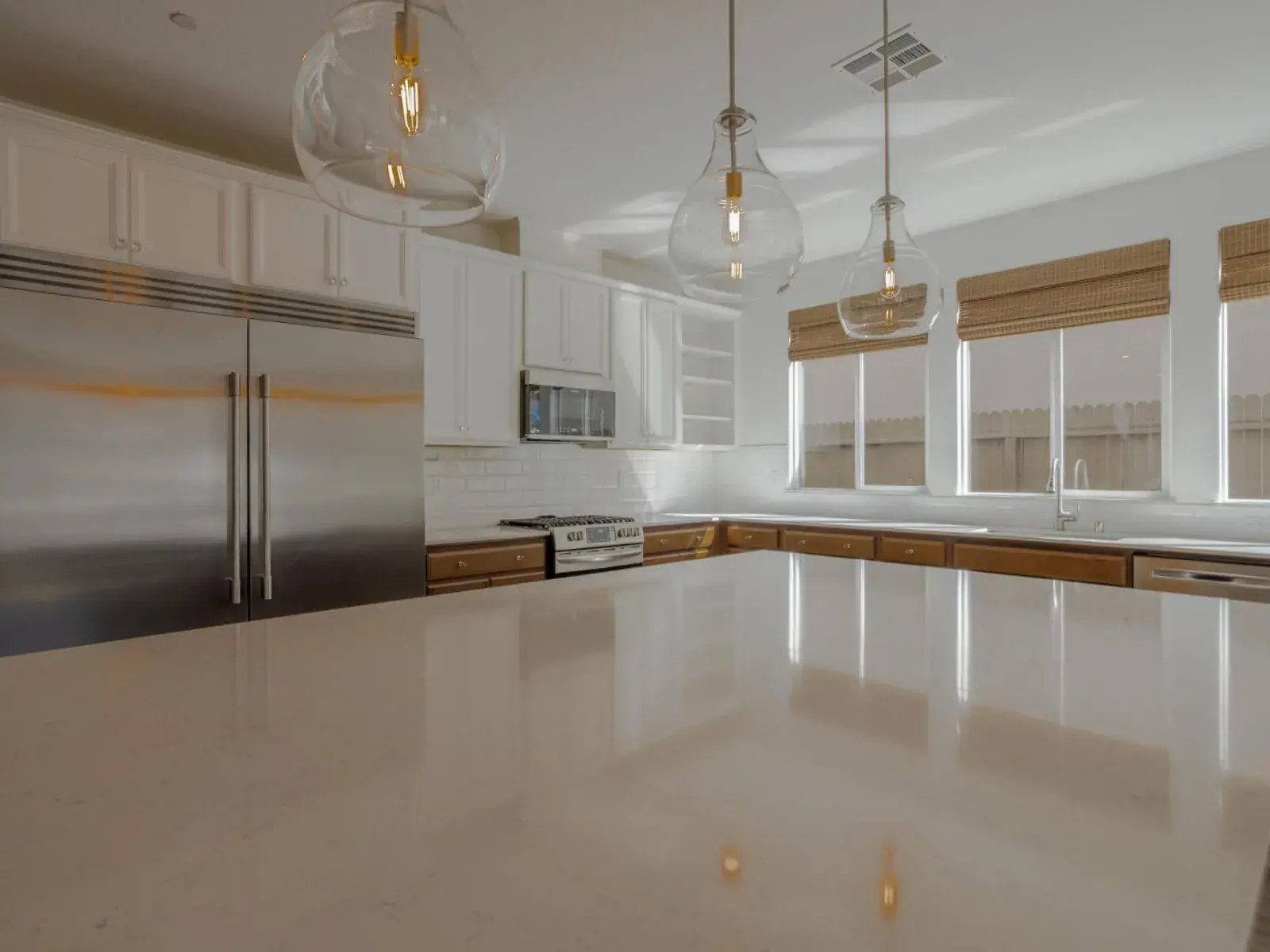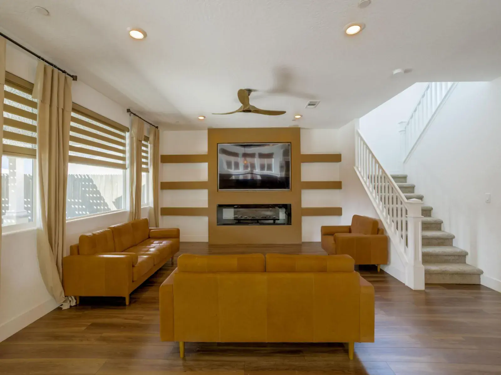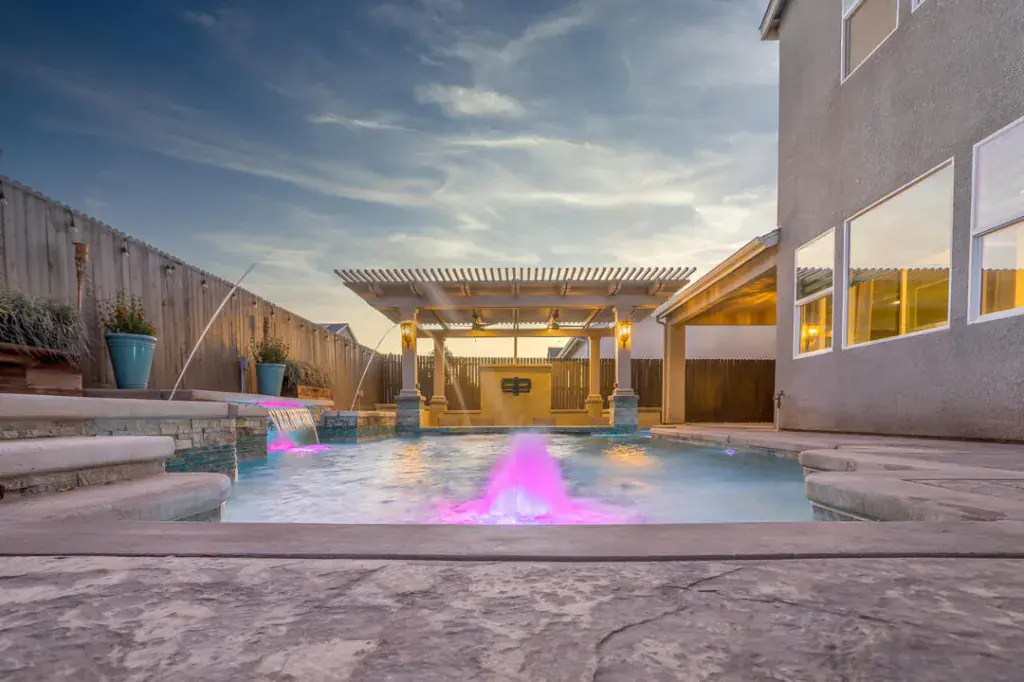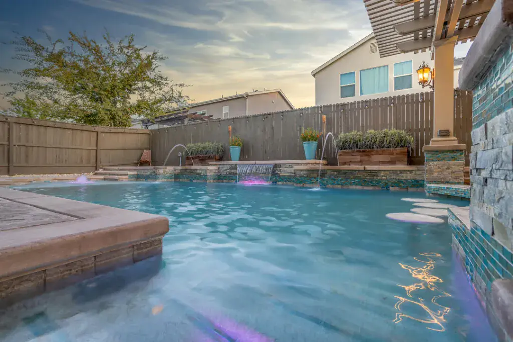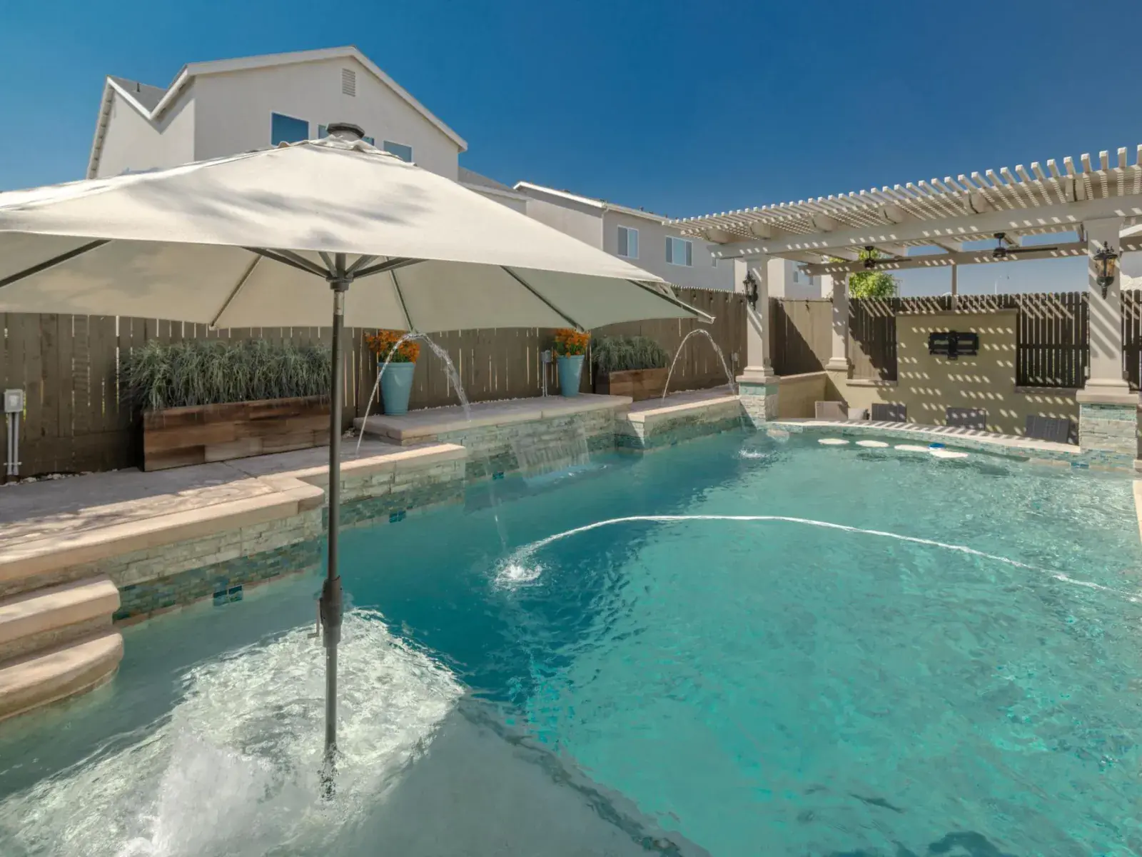 As you enter, the inviting foyer leads first to a downstairs bedroom and adjacent full bathroom and then further down the hall awaits a spacious, open concept living room and kitchen area. The featured living room wall offers a flush mount 85 inch television and a beautiful 88 inch built-in fireplace. Custom window treatments adorn all of the many windows, which bring ample natural light into the home. Stainless kitchen appliances, modern on-trend light fixtures, a large quartz kitchen island, commercial refrigerator, bamboo window coverings and a walk-in pantry are all part of the package. And don’t forget the wood-look flooring that really adds pizazz to the entire downstairs. Upstairs features 4 bedrooms and a large loft, perfect for a media room or as a play area. A large primary bedroom is accompanied by bathroom with dual vanities and a glass shower. Two car garage is fully textured, painted and finished and, as bonus, has epoxy floors. Now the kicker…a custom-built swimming pool that includes a baja shelf, umbrella insert, 24-inch bubblers, 2 deck water jets, 4-foot water sheer and bench, light features, swim up bar and sunken patio with custom 12 x 20-foot aluma wood pergola with flat panel and AV capability. Pentair filtration system with easy touch panel adds to the value and simplicity of care. Full backyard stamped concrete, owned solar panels–what more could you want? Make your appointment today to visit this wonderful home.
