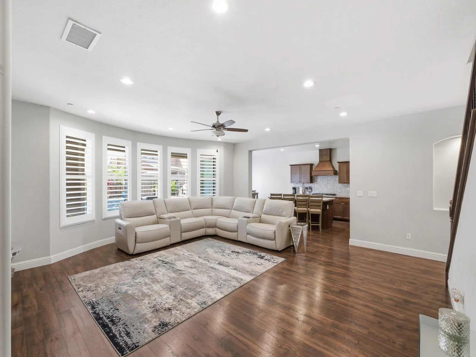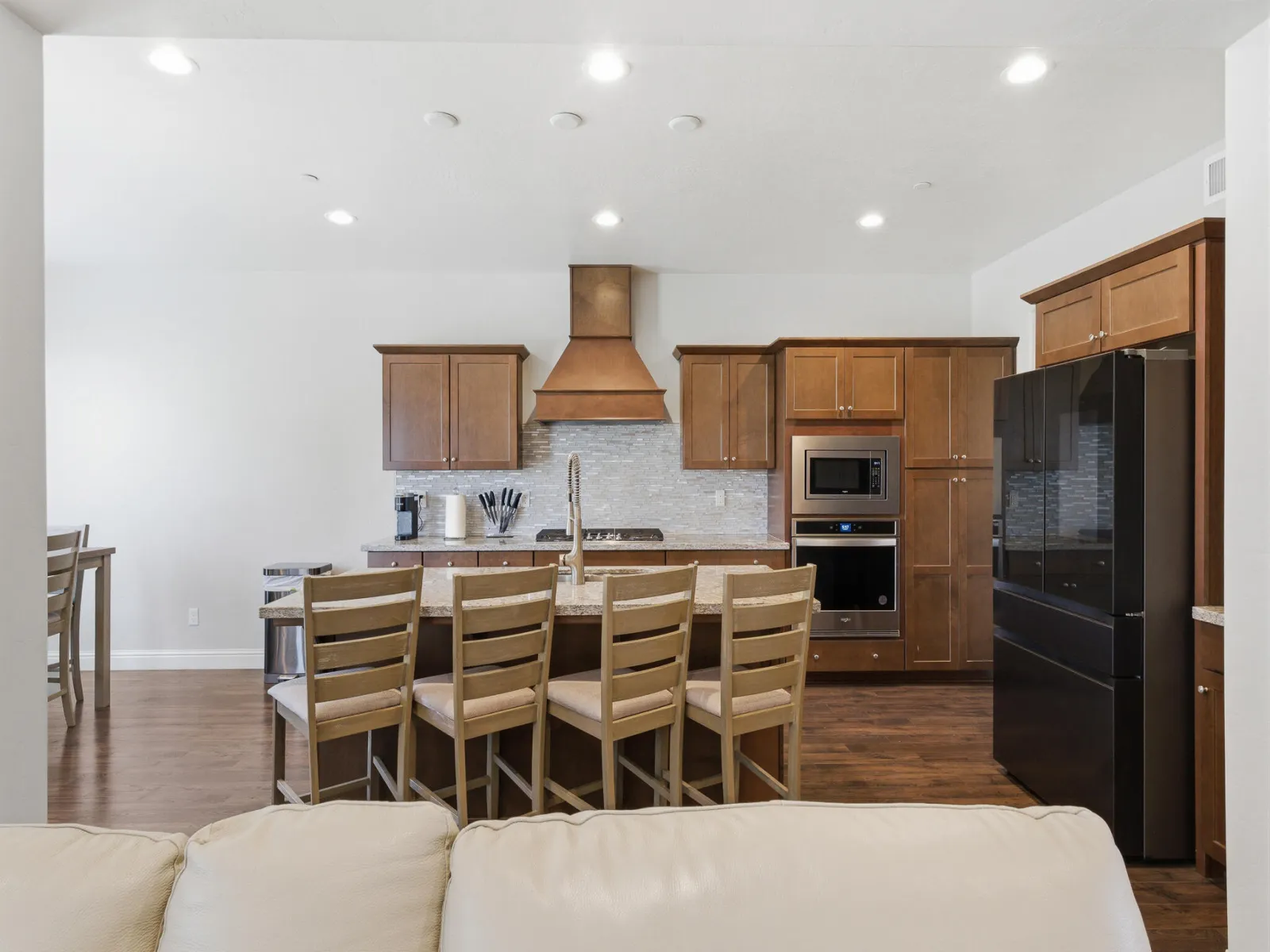 Breakfast Bar, Ceiling Fan(s), High Ceilings, Kitchen Island, Open Floorplan, Recessed Lighting, Stone Counters