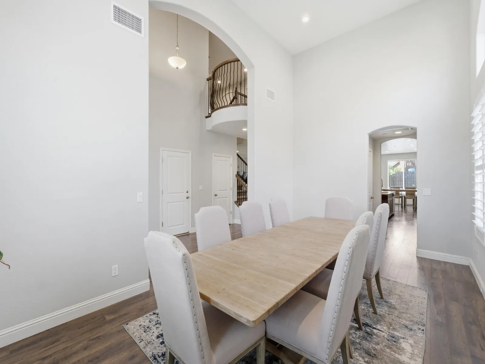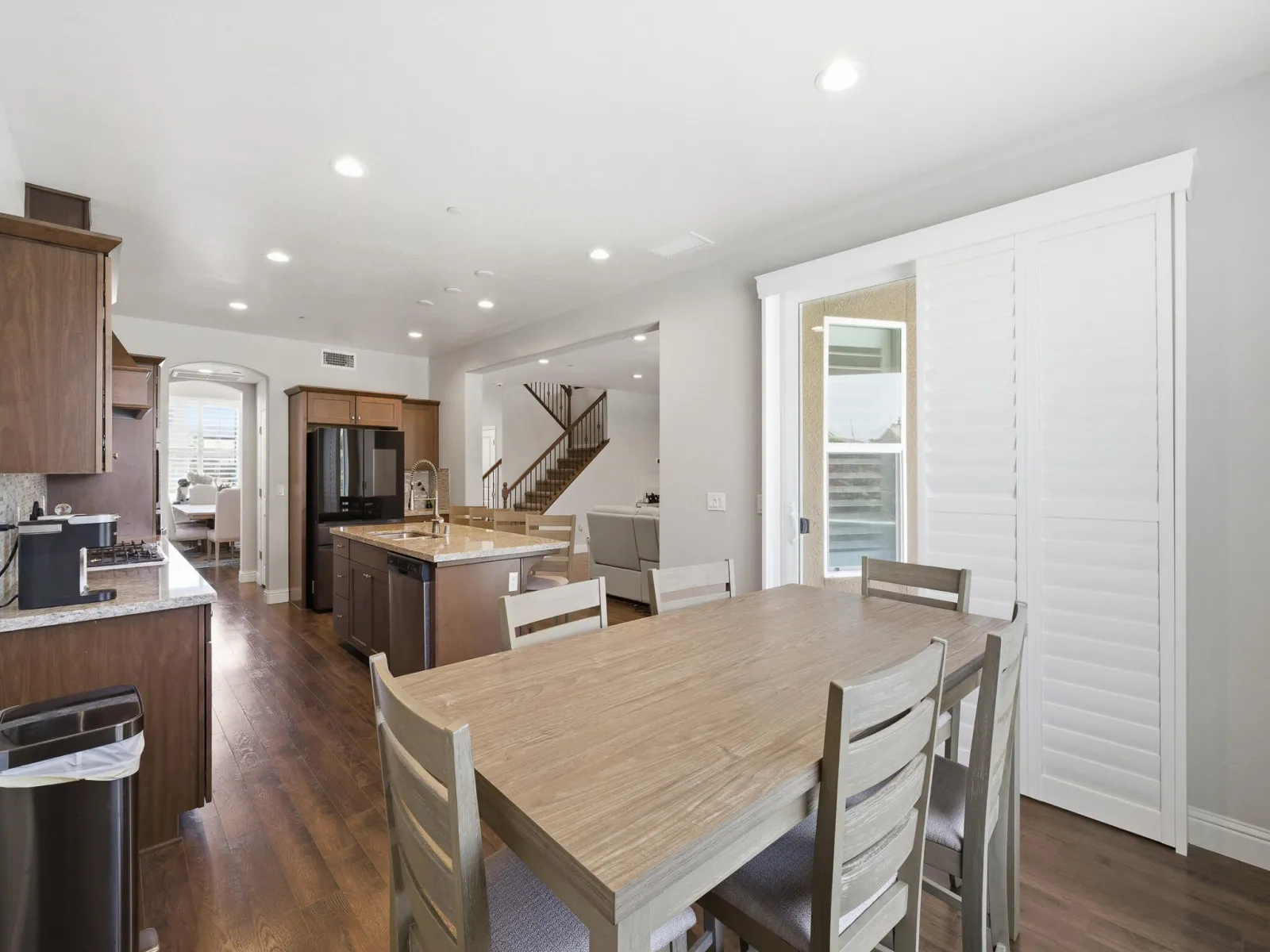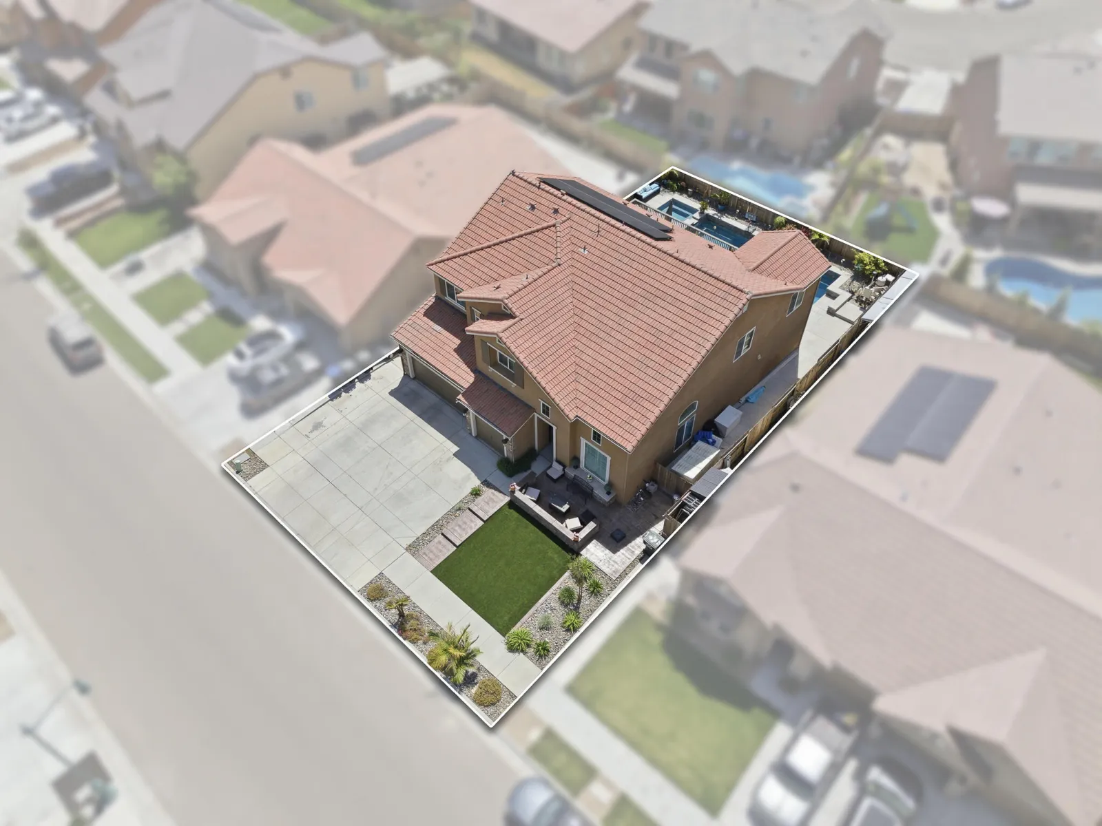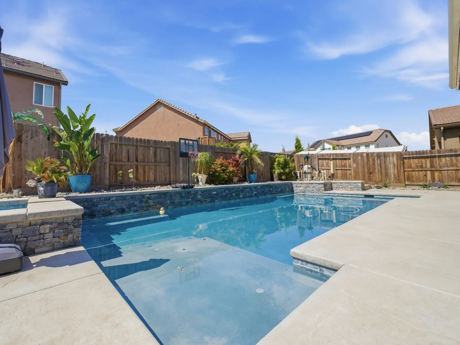 Welcome to this stunning two story home in highly desirable NW Visalia, offering over 3,500 sqft of thoughtfully designed living space built in 2022. From the moment you arrive, you’ll notice the beautifully upgraded curb appeal featuring low-maintenance synthetic grass, a stamped concrete walkway, & a front patio area that creates a warm & inviting entrance perfect for outdoor seating. Inside, soaring ceilings, abundant natural light, & a formal dining area set the tone for the home’s open & functional layout. The expansive great room seamlessly connects the living, dining, & kitchen spaces ideal for both everyday living & entertaining. The upgraded kitchen host rich cabinetry, granite countertops, a large center island with seating, double ovens, a built in cooktop with custom hood, & a butler’s pantry for added convenience. Upstairs, a massive loft-style game room provides the perfect flex space for a second living area, media room, or playroom, along with generously sized bedrooms. The spacious primary suite offers a private retreat with direct access to an expansive balcony overlooking the backyard, plus a luxurious en suite bath with dual vanities, a dedicated makeup station, soaking tub, and an oversized walk in tile shower with dual shower heads. Step outside to a true backyard showpiece featuring a custom heated gunite pool & spa with Baja shelf, expansive concrete decking, & multiple lounging areas designed for year round enjoyment & entertaining. The outdoor space is further enhanced by a large covered patio & a rare second story balcony with exterior spiral staircase access, creating a seamless indoor outdoor lifestyle. Additional highlights include a well appointed laundry room with built in cabinetry & sink, a 3 car garage, solar for energy efficiency, & thoughtfully designed low maintenance landscaping. Located near Riverway Sports Park, shopping, dining, schools, and parks, this home offers the perfect blend of modern comfort, space, and lifestyle.