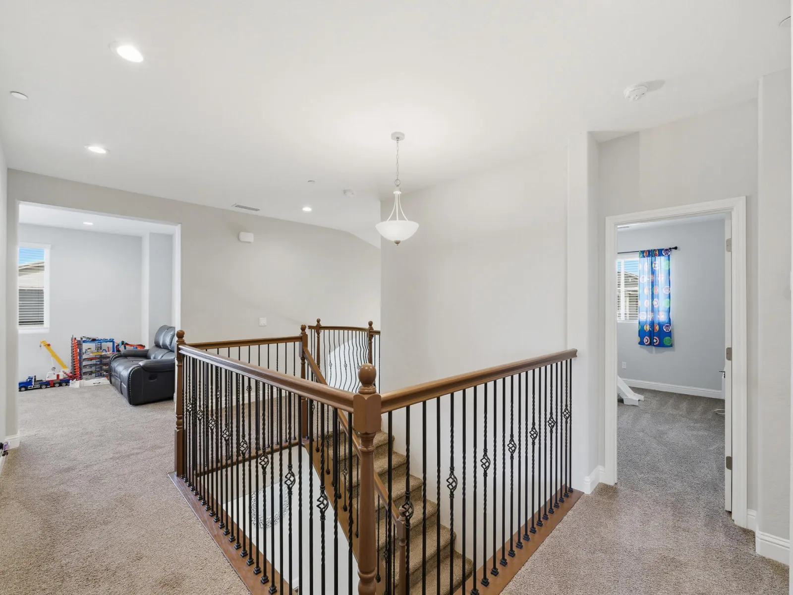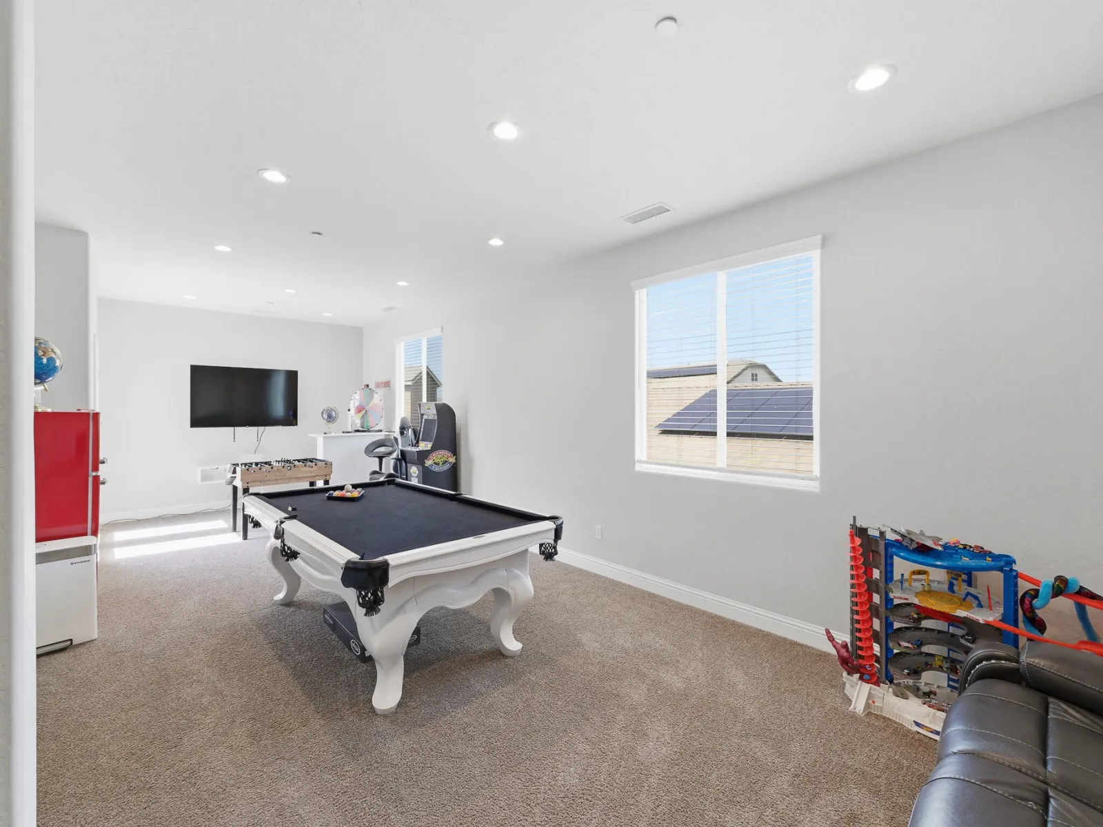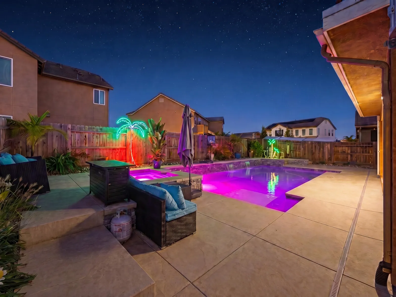 Welcome to this stunning two story home in highly desirable NW Visalia, offering over 3,500 sqft of thoughtfully designed living space built in 2022. From the moment you arrive, you’ll notice the beautifully upgraded curb appeal featuring low-maintenance synthetic grass, a stamped concrete walkway, & a front patio area that creates a warm & inviting entrance perfect for outdoor seating. Inside, soaring ceilings, abundant natural light, & a formal dining area set the tone for the home’s open & functional layout. The expansive great room seamlessly connects the living, dining, & kitchen spaces ideal for both everyday living & entertaining. The upgraded kitchen host rich cabinetry, granite countertops, a large center island with seating, double ovens, a built in cooktop with custom hood, & a butler’s pantry for added convenience. Upstairs, a massive loft-style game room provides the perfect flex space for a second living area, media room, or playroom, along with generously sized bedrooms. The spacious primary suite offers a private retreat with direct access to an expansive balcony overlooking the backyard, plus a luxurious en suite bath with dual vanities, a dedicated makeup station, soaking tub, and an oversized walk in tile shower with dual shower heads. Step outside to a true backyard showpiece featuring a custom heated gunite pool & spa with Baja shelf, expansive concrete decking, & multiple lounging areas designed for year round enjoyment & entertaining. The outdoor space is further enhanced by a large covered patio & a rare second story balcony with exterior spiral staircase access, creating a seamless indoor outdoor lifestyle. Additional highlights include a well appointed laundry room with built in cabinetry & sink, a 3 car garage, solar for energy efficiency, & thoughtfully designed low maintenance landscaping. Located near Riverway Sports Park, shopping, dining, schools, and parks, this home offers the perfect blend of modern comfort, space, and lifestyle.