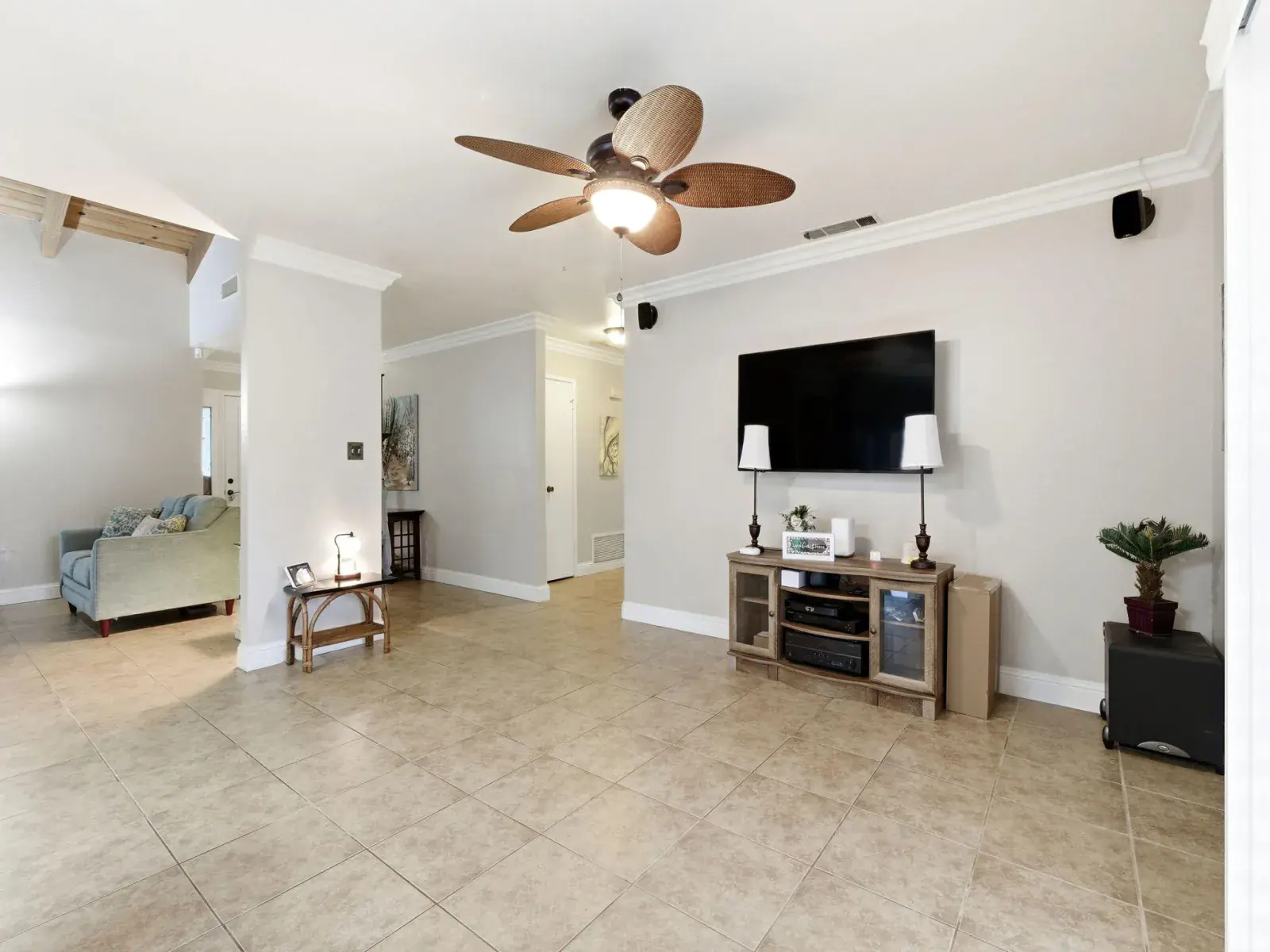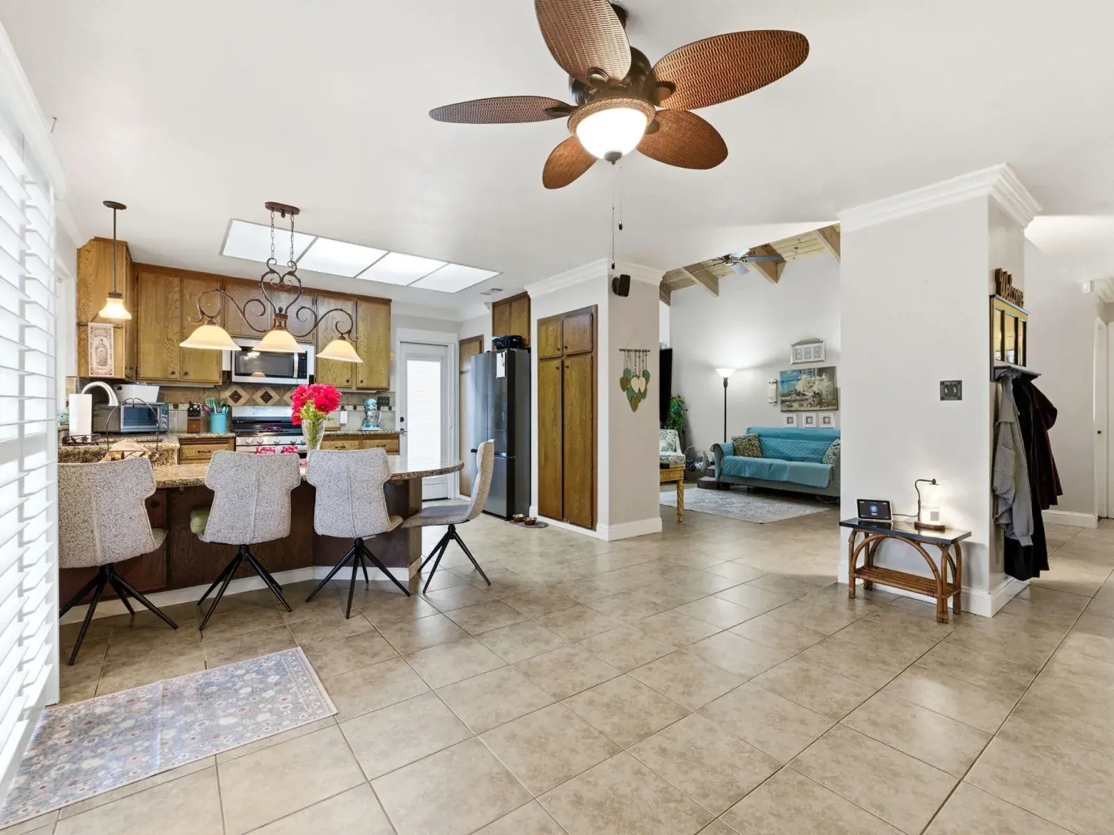 Welcome to this beautifully upgraded 4 bedroom ,2 bath home that blends modern comfort with thoughtful details throughout. Step inside to find tile flooring with plush carpet accents , crown moulding, plantation shutters ,and a wide hallway that enhances the open feel of the home. The designer entry door sets the tone , leading into a warm family space with a gas log fireplace perfect for entertaining or unwinding.