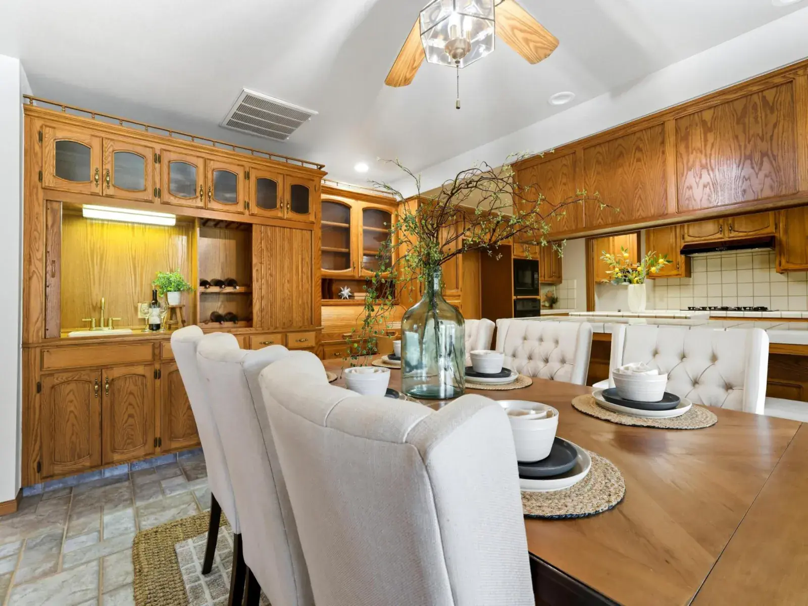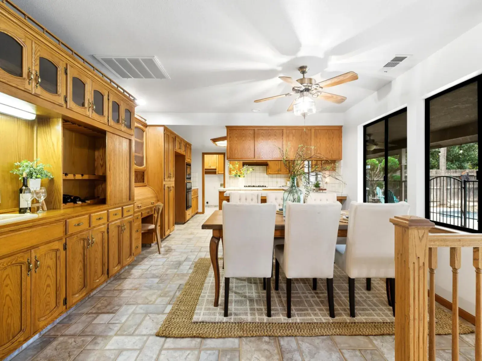 Step outside to a stunning backyard oasis, perfect for both relaxation and entertainment. Enjoy the sparkling pool, expansive covered patio, and a spacious area of greenery and glass for effortless indoor-outdoor living.