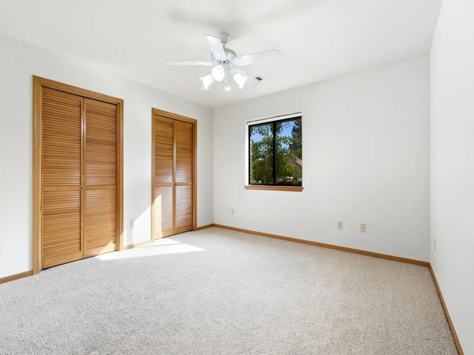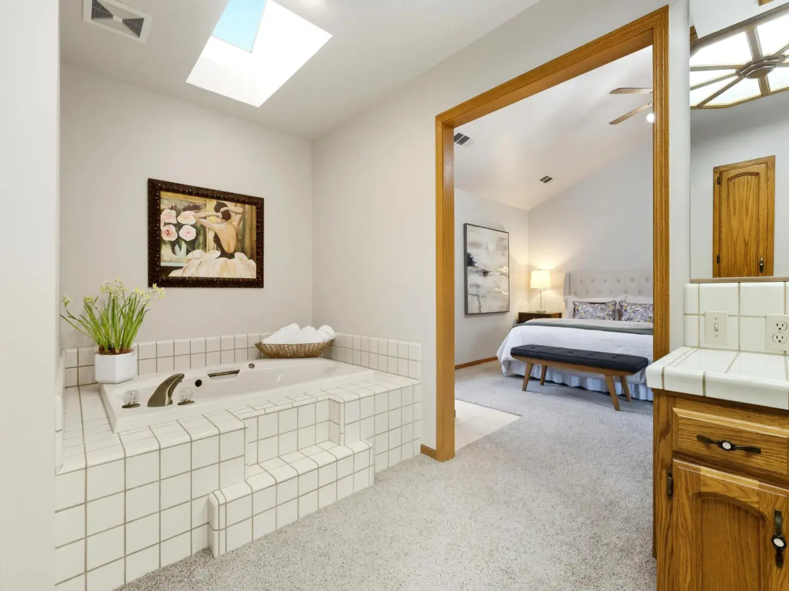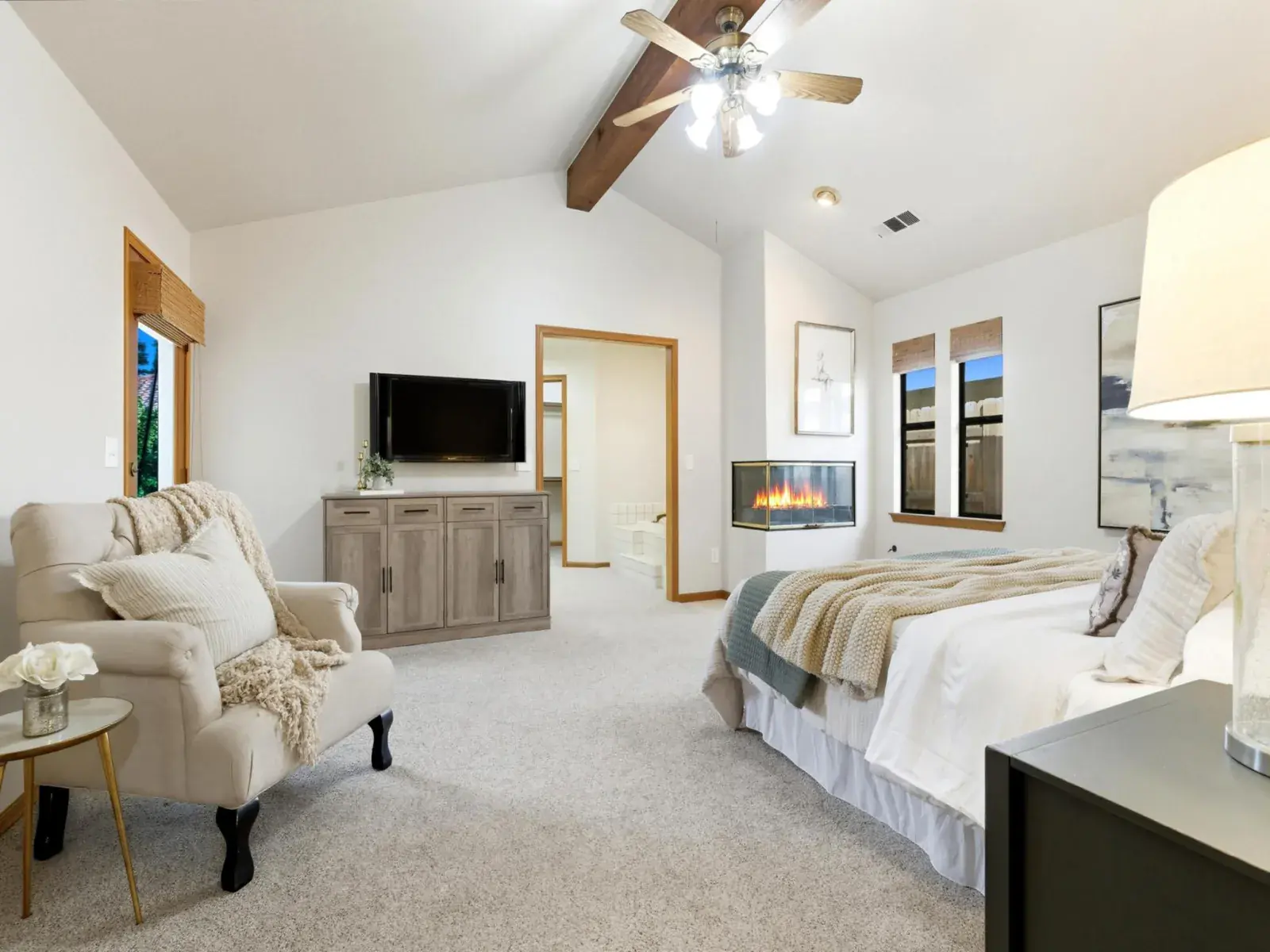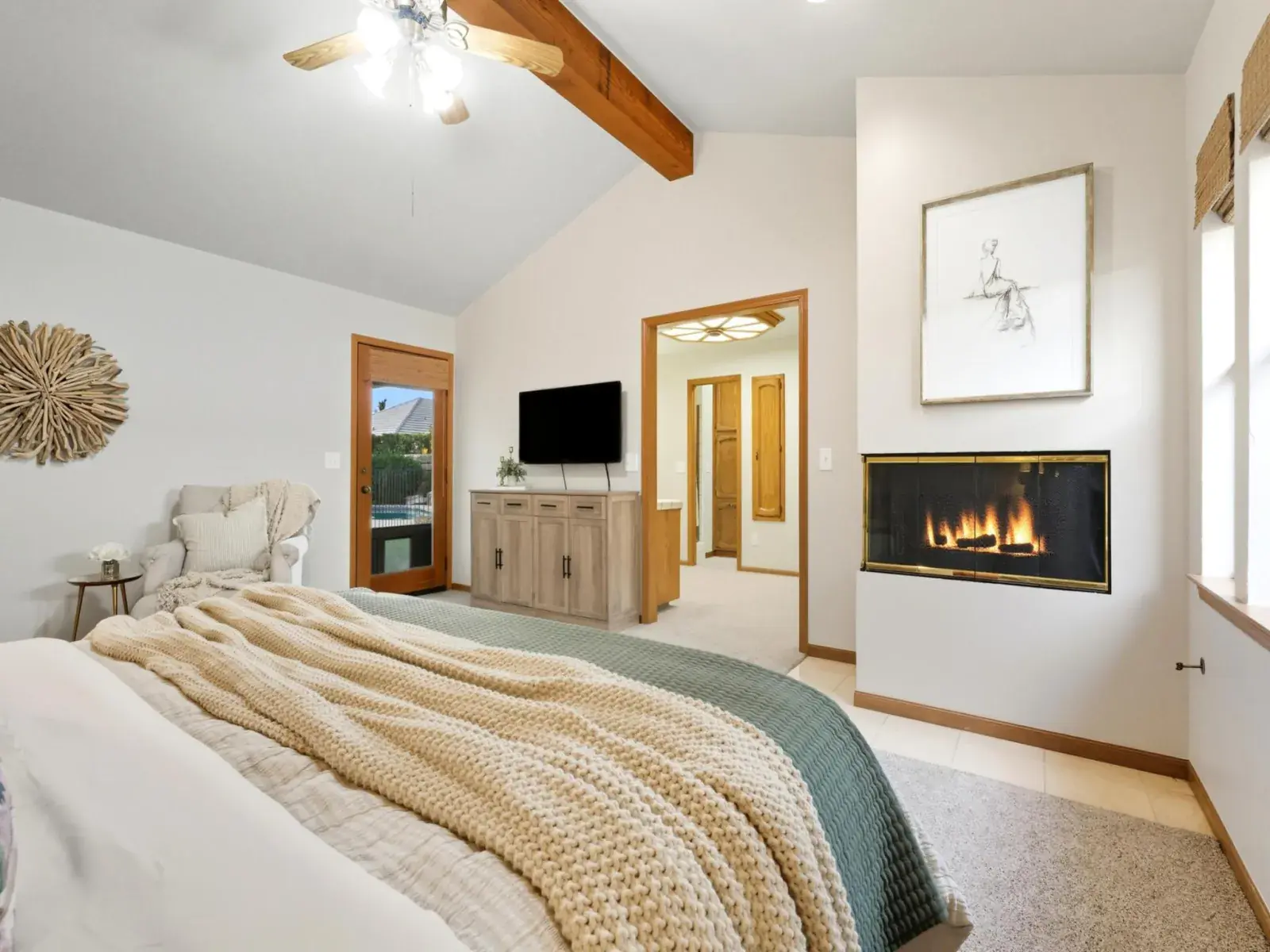 This beautiful home has three generously sized bedrooms and three baths. The owner’s suite is a private retreat, featuring vaulted ceilings, an exposed wood beam, and its own cozy fireplace. The luxurious en-suite bath is complete with a large soaking tub and separate shower, offering a spa-like experience.