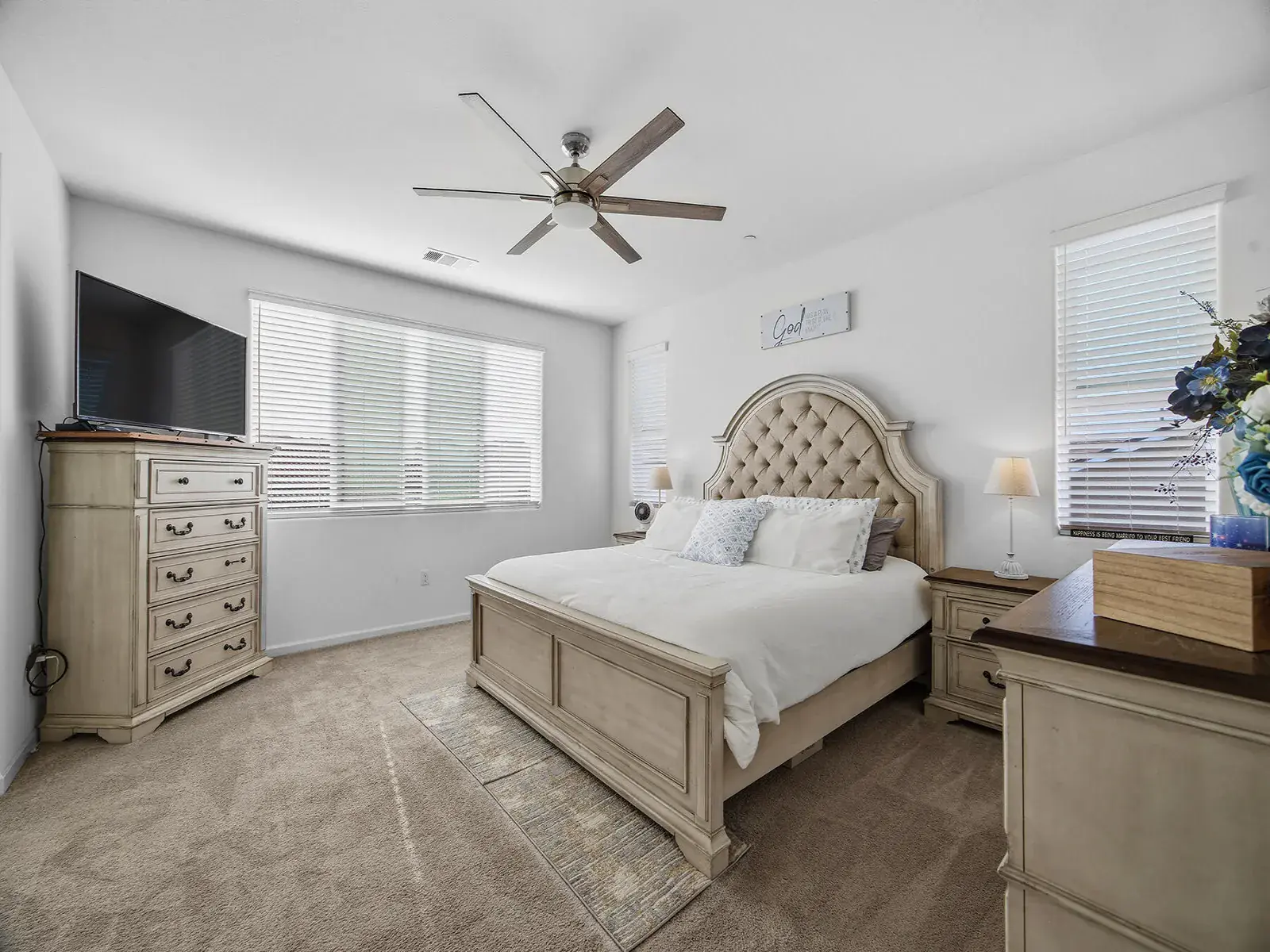 Built in 2021, this 6-bedroom, 5-bath two-story home offers 2,944 sq ft of open living space with a modern kitchen featuring granite countertops, a large island, and a walk-in pantry, plus a downstairs bedroom and full bath ideal for guests or in-laws. Situated on a 6,970 sq ft lot the home also includes an oversized two-car garage and a leased solar system. Located in a newer cul-de-sac neighborhood, this home is priced to sell and a must-see.