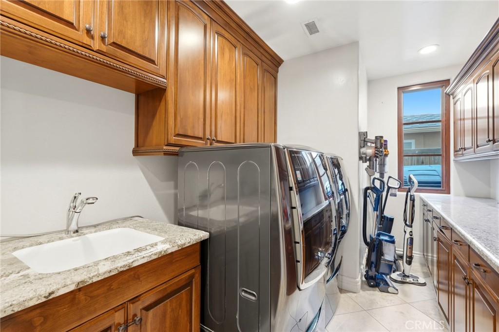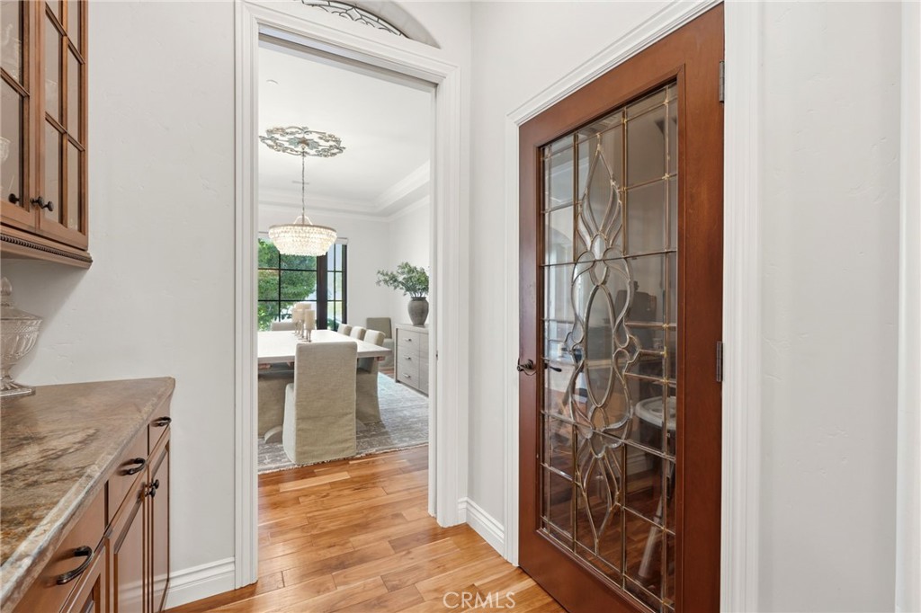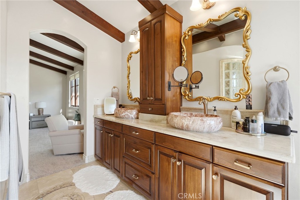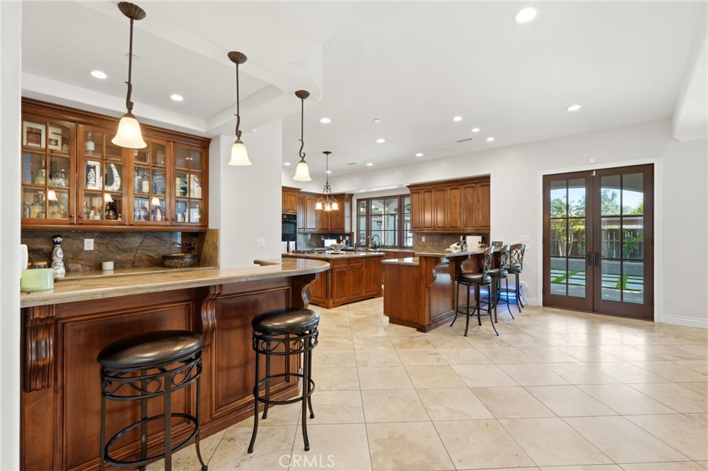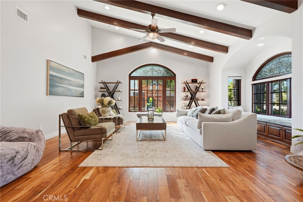 This extraordinary 5,000+ sq ft custom residence offers 5 bedrooms, 5 bathrooms, and remarkable architectural detail designed for both elegant entertaining and comfortable everyday living. Enter through stunning beveled glass doors into a grand interior highlighted by vaulted wood beam ceilings and multiple spacious living areas. The formal dining room flows seamlessly into a built-in bar, wine room, creating an inviting space for hosting. The gourmet kitchen is thoughtfully designed with solid stone countertops, three copper sinks, and an expansive walk-in pantry.