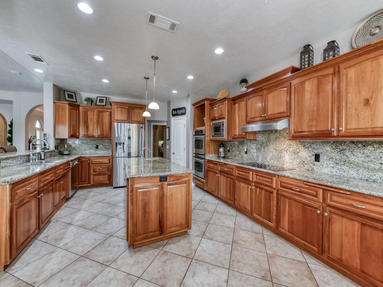 Breakfast Bar, Ceiling Fan(s), Granite Counters, Kitchen Island, Kitchen Open to Family Room, Recessed Lighting, Tile Counters