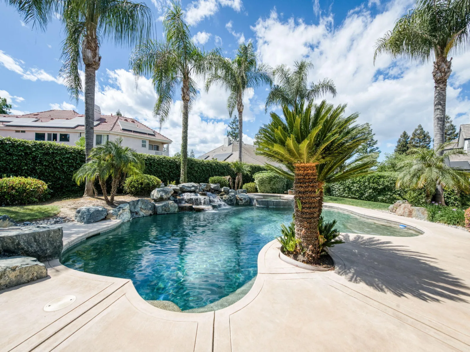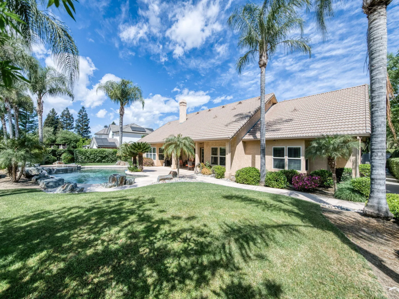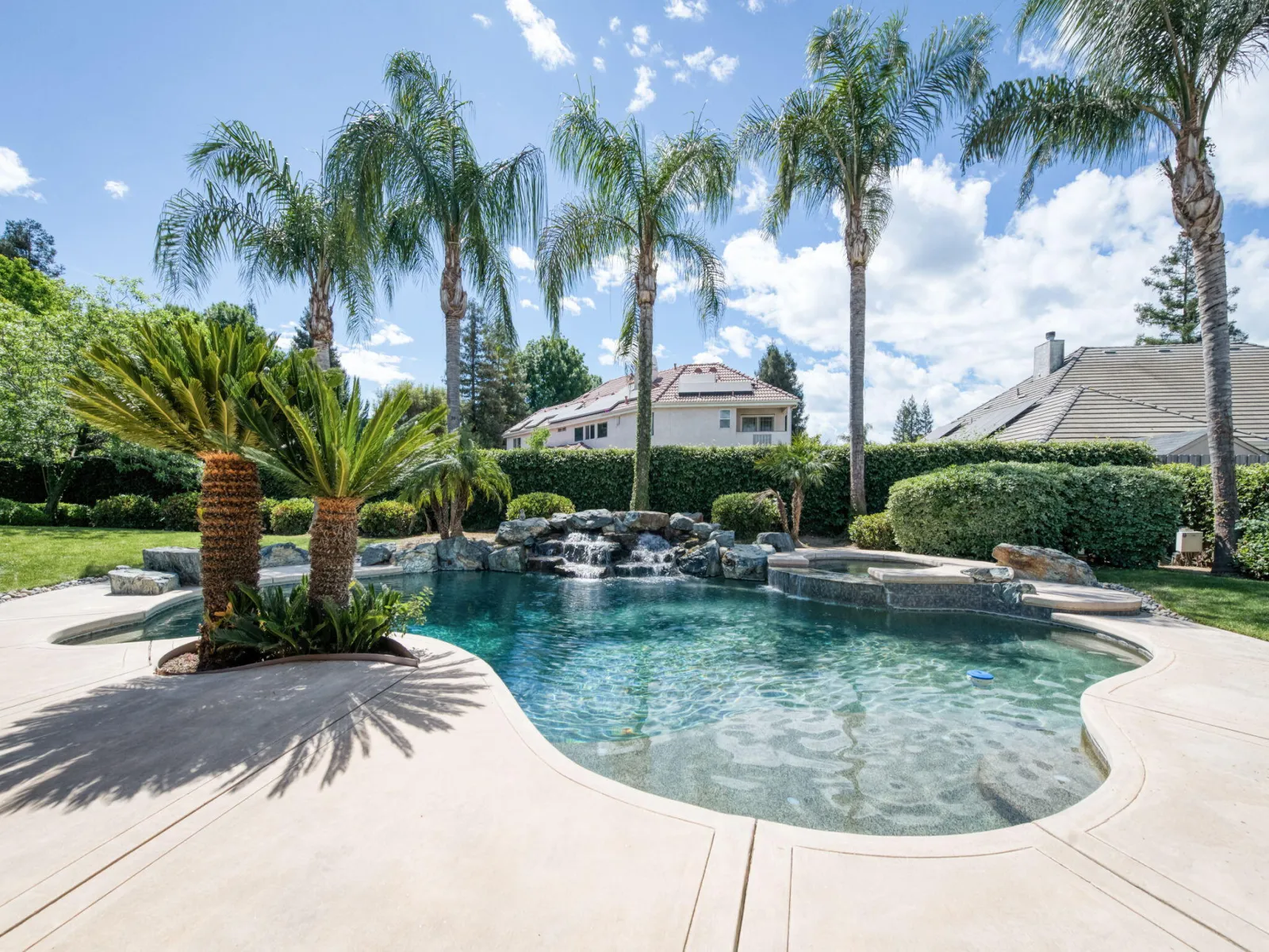 Welcome to this exceptional residence in the highly sought-after Chardonnay Estates, a prestigious gated community in NW Visalia. Situated on a quiet cul-de-sac, this beautifully maintained home offers an ideal blend of comfort, functionality, and thoughtful upgrades. The well-designed layout features four spacious bedrooms conveniently located downstairs, including an isolated primary retreat for added privacy. A versatile bonus flex room with its own dedicated AC system and private bathroom offers endless possibilities, perfect for a media room, gym, fifth bedroom, or playroom. At the heart of the home is a large, inviting kitchen equipped with granite countertops, a breakfast bar, a prep island with sink, stainless steel appliances including double ovens, and abundant cabinet storage. Recessed lighting and expansive windows fill the home with natural light while providing picturesque views of the resort-style backyard. Enjoy multiple living and dining spaces with two separate living rooms and both formal and casual dining areas. The casual dining space opens to a covered patio complete with ceiling fans and exterior speakers, creating the perfect setting for indoor-outdoor entertaining. Step outside to your private backyard oasis featuring a sparkling in-ground pool, spa, and tranquil waterfall. Additional highlights include plantation shutters throughout, new carpet downstairs, new rain gutters, and a finished garage with extensive built-in cabinetry and ample lighting. Located just half a mile from the highly sought-after Oak Grove Elementary School, this home offers luxury living in a prime location.