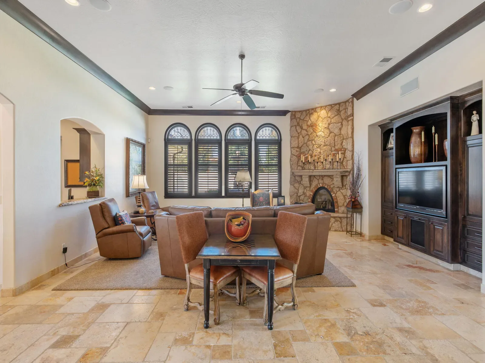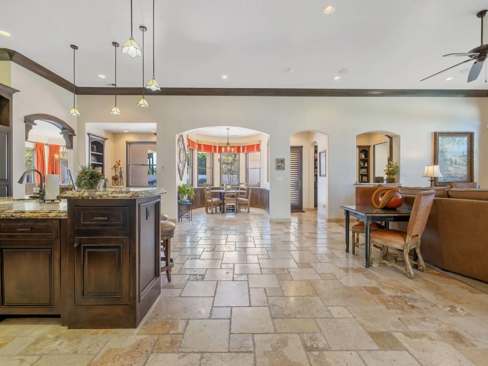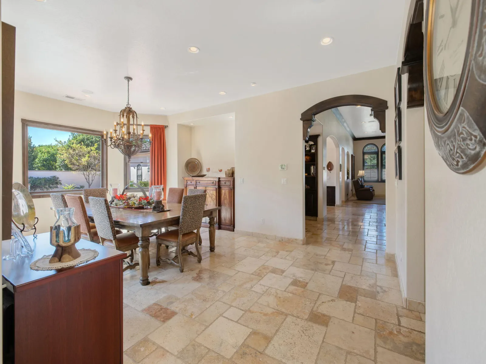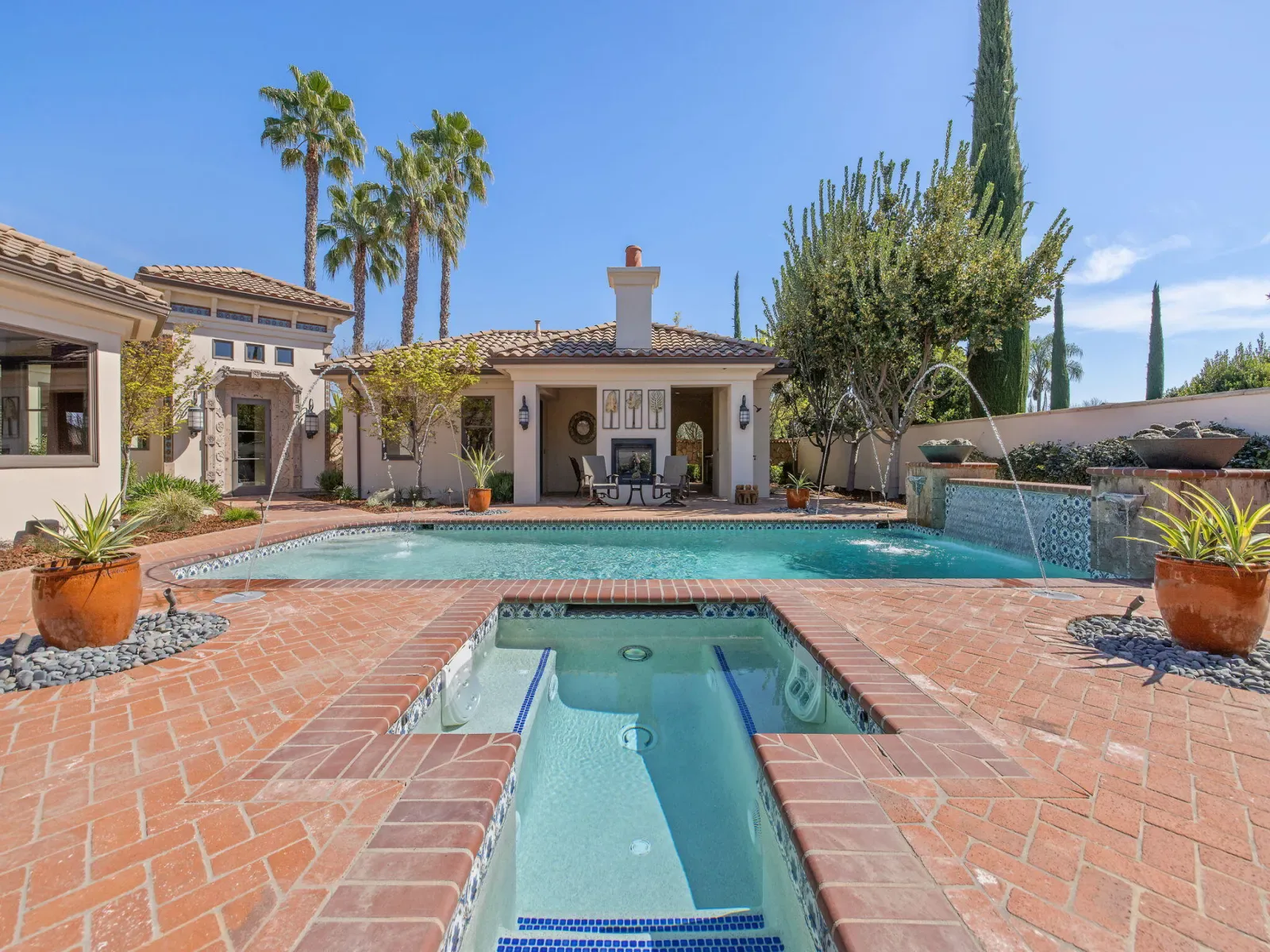 Exquisite custom home in gated Da Vinci! Situated on more than half an acre, a remarkable blend of timeless architecture, craftsmanship, and resort-style living just minutes from top schools, shopping, and the charm of downtown Visalia. From the moment you arrive, manicured grounds and striking curb appeal set the tone. Inside, rich materials and exceptional attention to detail define the home, including Turkish travertine floors, custom tile work, and thoughtfully designed living spaces that feel both elegant and inviting. A formal entry opens to the living room with fireplace, while the dining room, surrounded by windows overlooking the lush backyard, creates a stunning setting for gatherings. Just beyond, a butler’s pantry with built-in cabinetry leads to a spectacular refrigerated wine cellar with a hand-carved custom door, a truly distinctive focal point. The chef’s kitchen is designed for everyday living and effortless entertaining, centered around a large island with granite countertops and professional appliances including a Wolf gas cooktop with custom hood, Thermador refrigerator and freezer, Sub-Zero refrigerator drawer, and Gaggenau dishwasher and oven. A walk-in pantry, ice maker, and charming breakfast nook surrounded by windows complete the space. The great room is warm and inviting with a gas fireplace, brick and stone mantel, and built-in entertainment center. The luxurious primary suite features its own fireplace and French doors opening to the backyard retreat. The spa-inspired bath includes a jetted soaking tub, walk-through tile shower, dual vanities, and two walk-in closets with custom built-ins. Outdoors, the property becomes a private resort with a sparkling pool, water feature, fire elements, in-ground jacuzzi, covered patios, and outdoor kitchen. A private casita with bedroom, bath, and kitchenette provides ideal guest accommodations. Owned solar. Meticulously maintained and truly exceptional. Must see to experience!