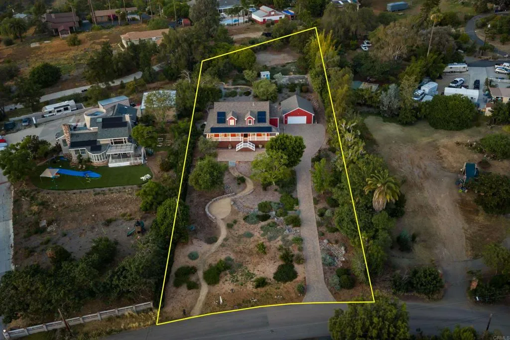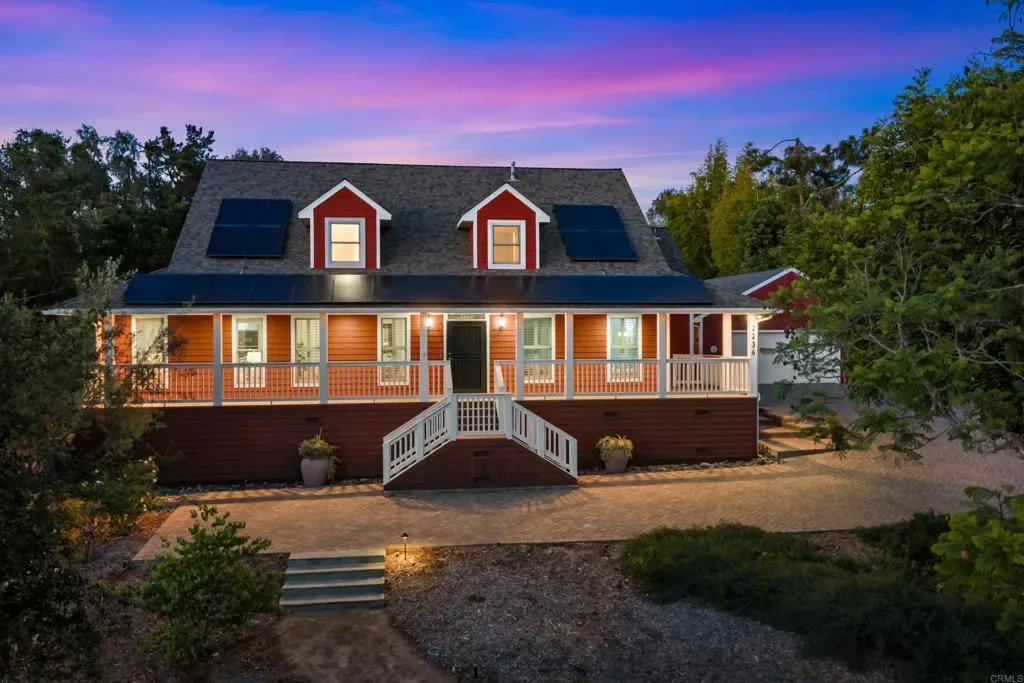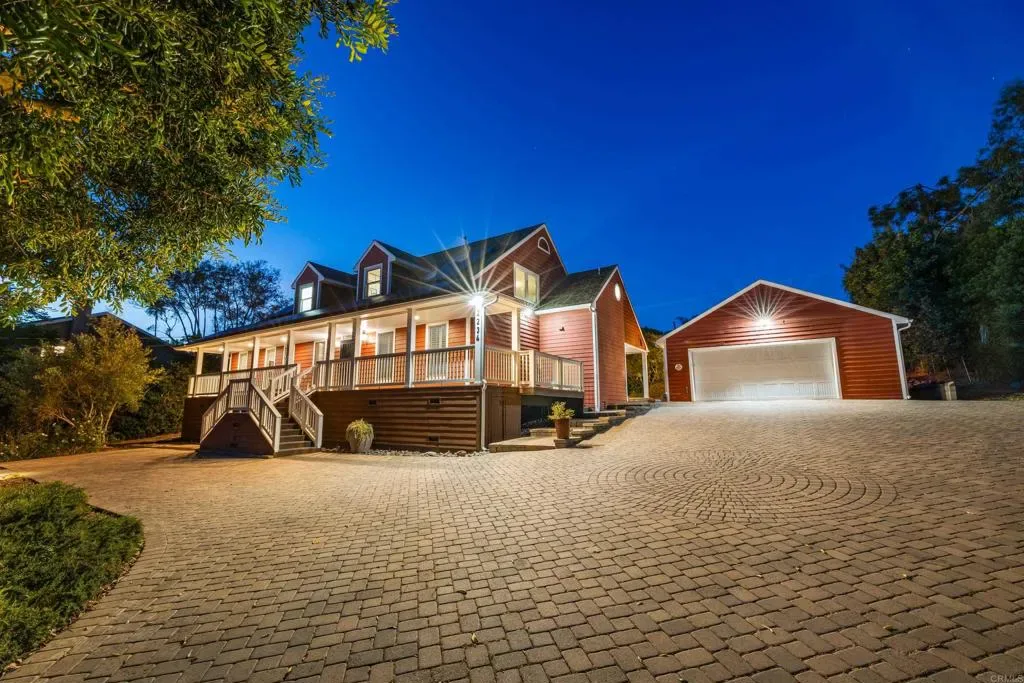 One-of-a-kind home on a fully landscaped acre in Vista, just up the hill from shopping and the 78. Wrap-around front porch, beautiful interior finishes, and flexible layout that lives like a single story. The luxurious first-floor primary suite is designed with accessibility in mind. The kitchen is spacious with multiple working surfaces, abundant cabinet and pantry space, and plenty of room to gather. A butler’s pantry provides additional convenience when entertaining. A combination laundry room and full bathroom are conveniently located off the back patio entrance, a perfect spot to clean up before traversing the eye-catching engineered wood floors. Upstairs, all three bedrooms are oversized with large closets. Two also have attached bonus rooms. Look for the entrance to one, cleverly disguised as a mirrored wardrobe door! Hobbyists will delight in the 750 sq ft detached garage/workshop; athletes will appreciate the 30×30 sport court. Additional features include a brick-paved private driveway, RV and boat storage, and city sewer. Paid-for solar, EV charging circuit in the garage, and a playhouse round out this exquisite and thoughtfully-designed estate.