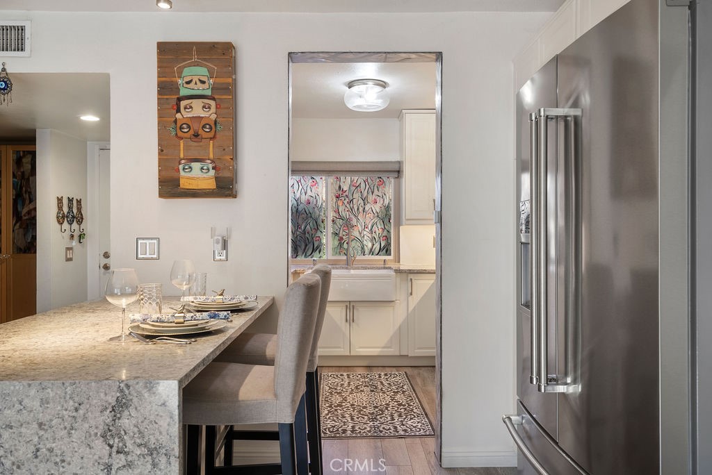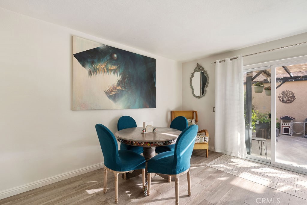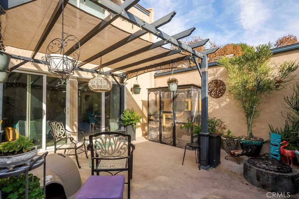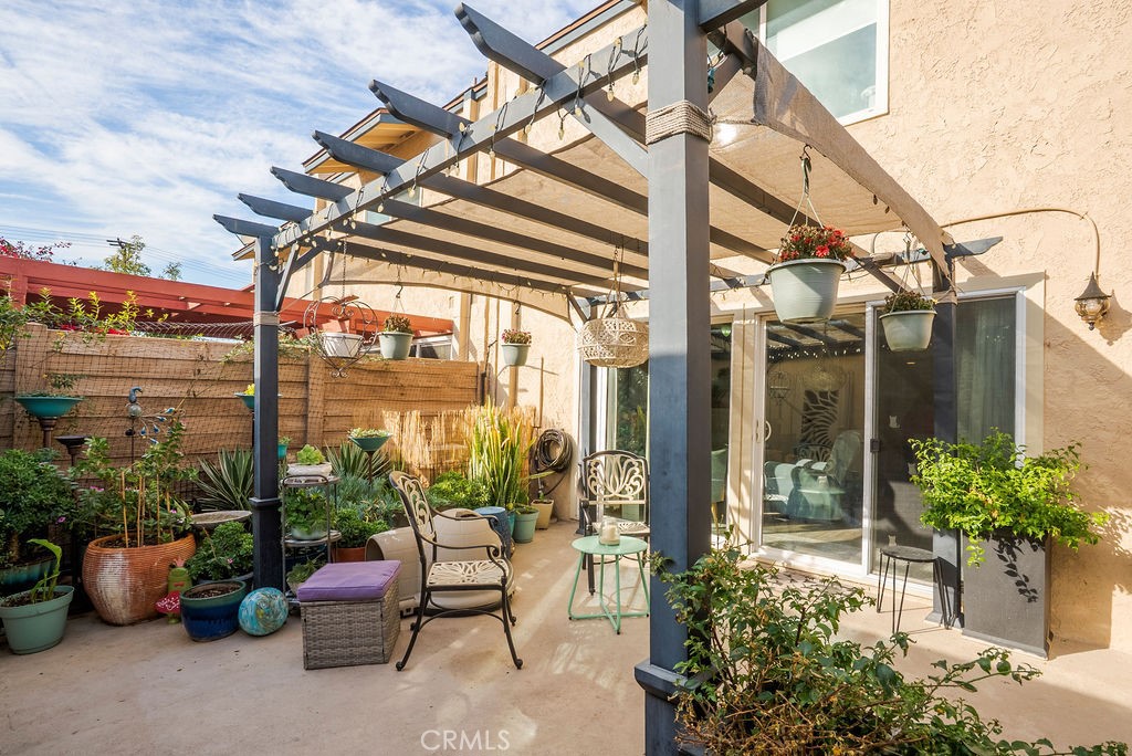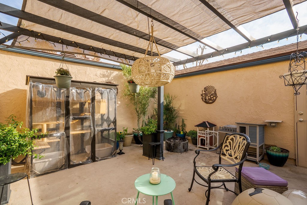 Dining Room/Living Room with Double sliding glass patio doors gives you almost a complete wall of glass with a true California setting, and for your fur babies, a built in pet door to the Patio* Large ,17/20 Patio with lighted Pergola with sunscreen with Ample outdoor living space. Beautiful Custom Screen Door, leads to garage access *Secondary bedroom 1*Newly remodeled with wardrobe system and loads of storage, *Secondary Bedroom 2* has a great view with built-in closet*