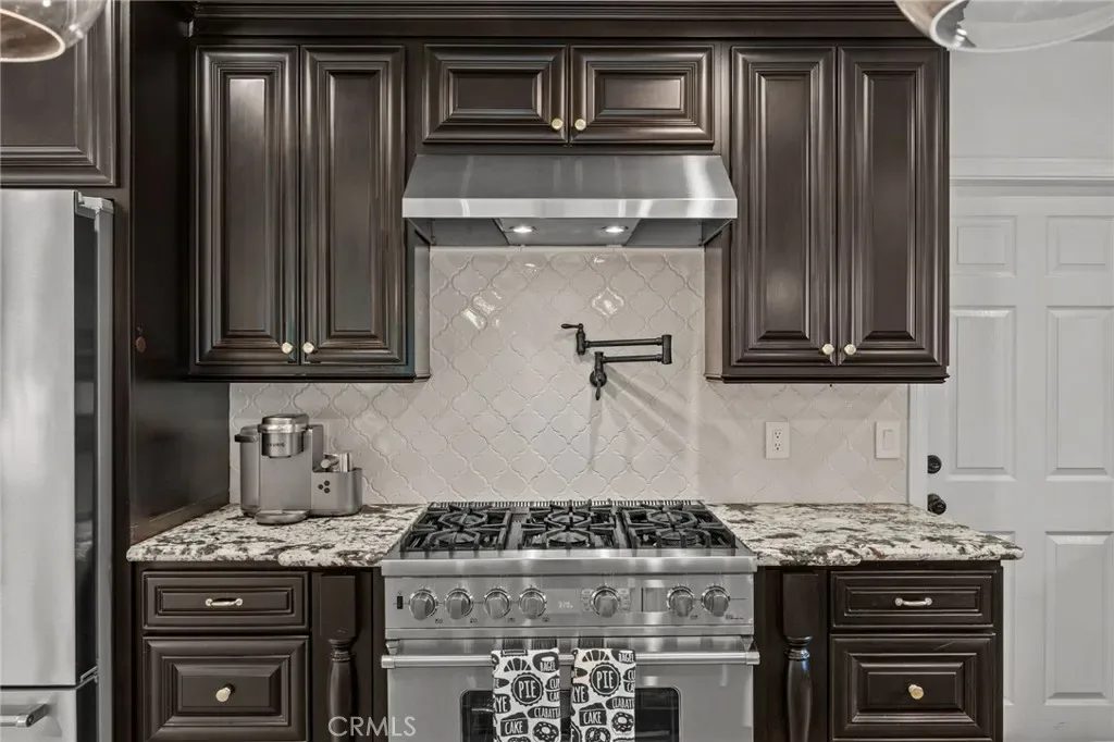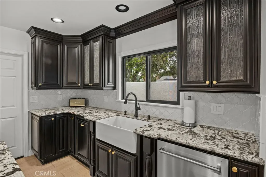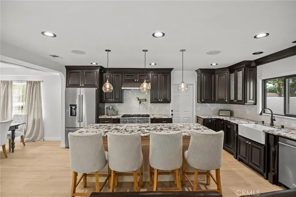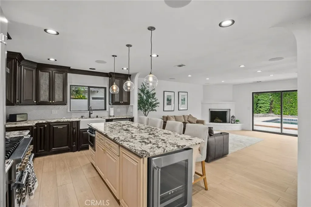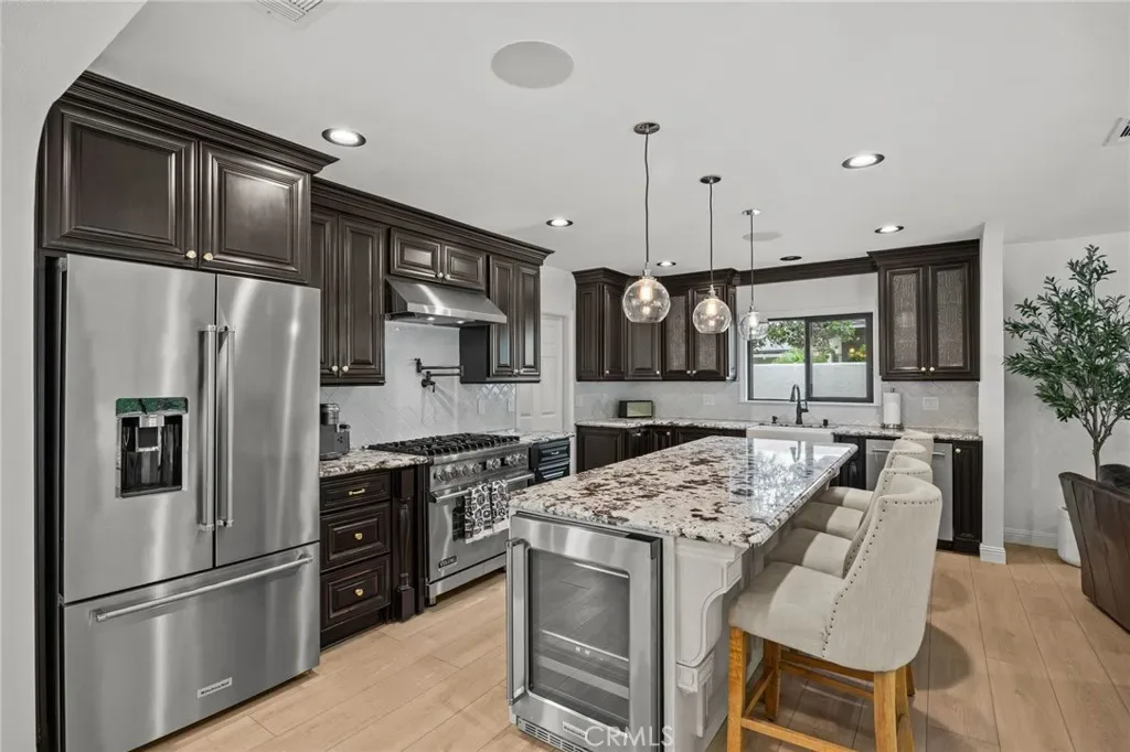 Step inside to a fully remodeled interior featuring new flooring, updated fixtures, crown molding, and built-in ceiling speakers throughout. The heart of the home is a stunning chef’s kitchen, complete with a premium Viking range, six-burner stove, wine refrigerator, and modern finishes—perfect for both everyday living and hosting.
