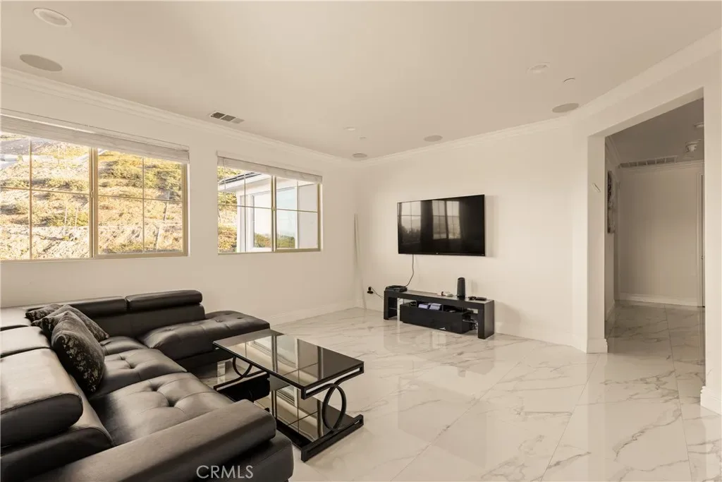 Welcome to this exquisite custom estate in the prestigious Sterling Ranch community of West Hills. Set on a quiet street, this modern masterpiece offers over 4,000 sq ft of refined living space with 5 bedrooms and 5.5 bathrooms on an expansive 11,006 sq ft lot. Designed for effortless California living, the open-concept floor plan features soaring ceilings, sleek porcelain tile floors, and walls of glass that flood the interiors with natural light. The spacious family room centers around a striking fireplace and pocket sliders that open to the backyard, creating a seamless indoor-outdoor flow. The gourmet kitchen is a showstopper, complete with porcelain countertops, premium KitchenAid appliances, a peninsula island with seating, a walk-in pantry, and an adjoining wet bar and dining area perfect for entertaining. A formal dining room adds elegance for special occasions. An attached ADU (or two-bedroom suite) with a private bath offers versatility for guests, family, or a home office. Upstairs, four en-suite bedrooms include a bright loft for lounging or work. The luxurious primary suite features dual walk-in closets, a vanity area, and a spa-inspired bathroom with dual vanities, a soaking tub, two showers, and private water closets. Step outside to your own resort-style oasis featuring a covered patio, Pebble Tec zero-edge pool and spa, built-in BBQ, pizza oven, and refrigerator—surrounded by lush landscaping and evening lighting for perfect ambiance. Conveniently located near top-rated schools, scenic hiking trails, and premier shopping and dining at The Village, Calabasas Commons, and the Fallbrook Center, with easy freeway access to Malibu’s beaches and Warner Center.