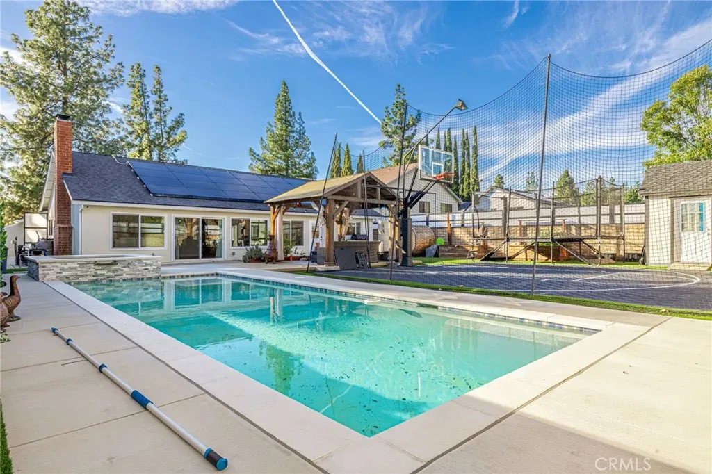 SHOW STOPPER ALERT!!! Welcome to PARADISE, where modern convenience meets LUXURY!! 2 HOMES!! ENERGY EFFICIENT, EXTENSIVELY UPGRADED MAIN HOME 3+2 w/ NEWLY CONSTRUCTED, READY TO MOVE-IN 1+1 ADUHAS SEPARATE ADDRESS, HIGH END FINISHES, 30 FULLY PAID SOLAR PANELS, TESLA E/V CHRGR, NEW HEATED-POOL, BASKETBALL 1/2 court(Mega-Slam), SAUNA *NEW GATES *LOCATED on a QUIET CUL-DE-SAC, fully renovated (8×8)Shed/BONUS SPACE w/ small fridge. From the moment you arrive, the beautiful landscaping and newly paved driveway offers generous space for 6 cars, ensuring a warm and effortless welcome for your visitors. The main home’s brand new modern double doors add security and tie in perfectly with this newly renovated, spectacular SINGLE-STORY. New crown molding/baseboards and brand-new engineered flooring that will last a lifetime! Previous owner installed a NEW ROOF, NEW WINDOWS, A/C/HEATING & UPGRADED the ELECTRICAL PANEL. Relax by the glow of the fireplace in the heart of the home/Living room that opens up to the designer-curated farmhouse kitchen that was engineered for the serious chef which flows effortlessly into the dining area to create a seamless indoor-outdoor hosting experience. Boasting professional-grade appliances, large island w/built small oven, Quartz ctops, high-end stainless-steel appliances, WOLF convection oven, pot filler,white shaker-style cabinetry, this culinary masterpiece flows into a sun-drenched dining area, creating a perfect circuit for entertaining guests while overlooking the massive backyard. The spacious primary suite offers a private upgraded bathroom, LED mirrored wardrobe & makeup area. 2 additional bedrooms fully renovated w/ full bathrm, LED lighting and organized closets in all bedrooms. A separate entrance leads you to the BRAND-NEW 480 ft², 1+1 ADU, w/a lavish quartz waterfall island and ctops,ALL appliances incl (electric)stackable washer/dryer, refrigerator, stainless steel range, stove, microwave & dishwasher. Engineered flooring flows throughout the HOME/ADU & SHED(except bath areas) Retreat to your private sanctuary featuring a state-of-the-art 4-person sauna and a brand-new heated pool. The backyard oasis continues w/ a permanent custom cabana, offering a sophisticated setting for starlit gatherings while overlooking the integrated basketball court. Finished w/ premium all-season turf, this space is meticulously designed for effortless, low-maintenance luxury.*ADU permitted.